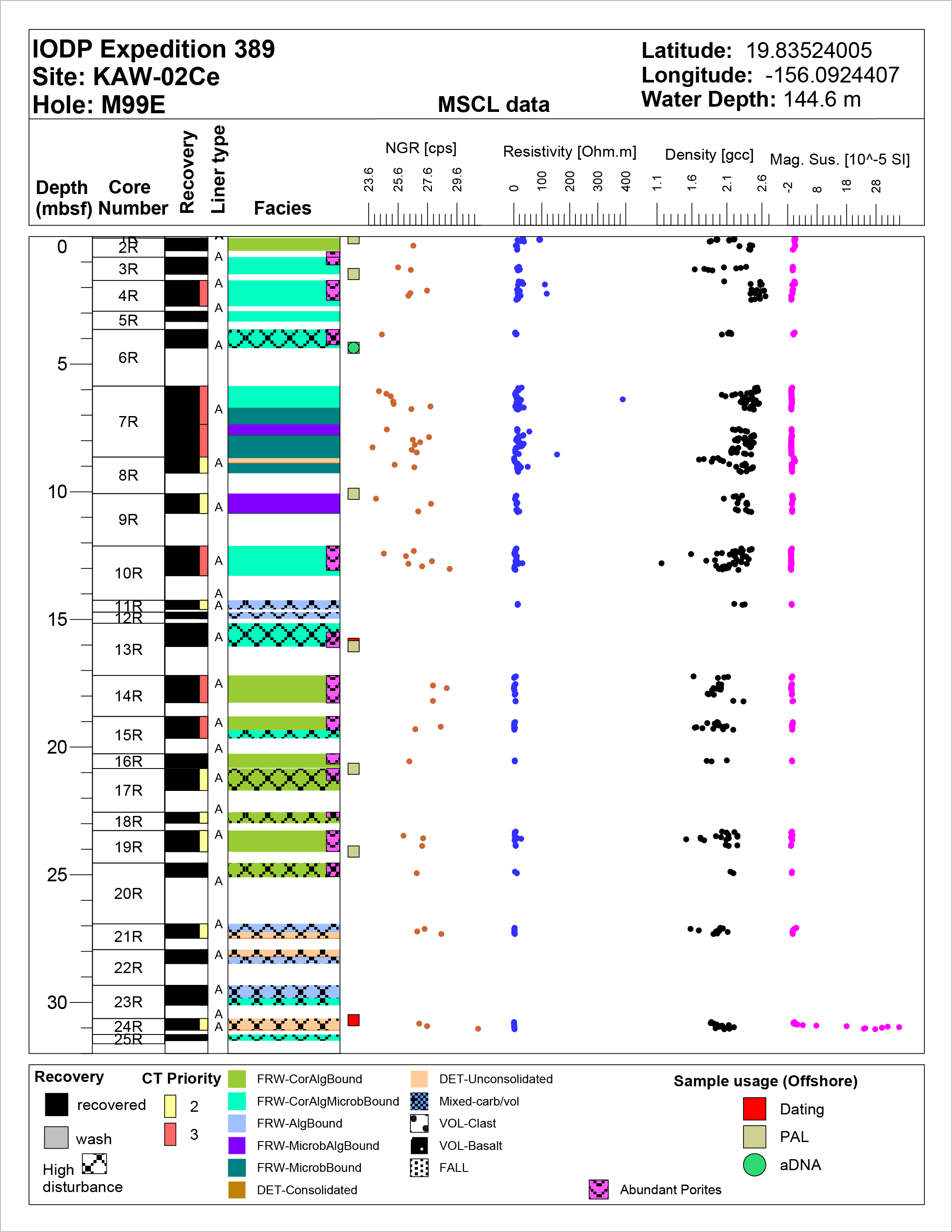 Webster, J.M., Ravelo, A.C., Grant, H.L.J., Rydzy, M., Stewart, M., Allison, N., Asami, R., Boston, B., Braga, J.C., Brenner, L., Chen, X., Chutcharavan, P., Dutton, A., Felis, T., Fukuyo, N., Gischler, E., Greve, S., Hagen, A., Hamon, Y., Hathorne, E., Humblet, M., Jorry, S., Khanna, P., Le Ber, E., McGregor, H., Mortlock, R., Nohl, T., Potts, D., Prohaska, A., Prouty, N., Renema, W., Rubin, K.H., Westphal, H., and Yokoyama, Y., 2025. Expedition 389 summary. In Webster, J.M., Ravelo, A.C., Grant, H.L.J., and the Expedition 389 Scientists, Hawaiian Drowned Reefs. Proceedings of the International Ocean Discovery Program, 389: College Station, TX (International Ocean Discovery Program). https://doi.org/10.14379/iodp.proc.389.101.2025