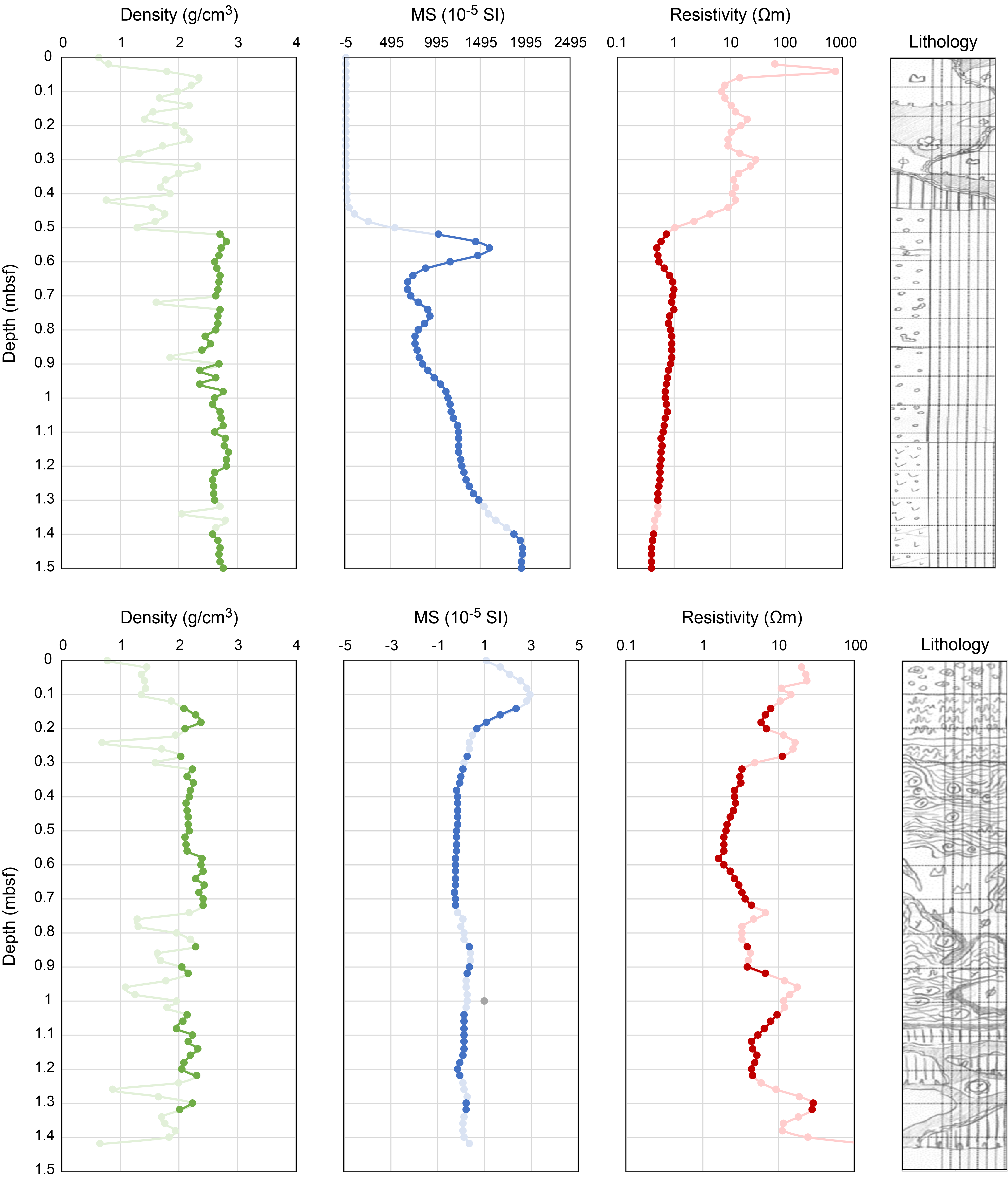 During both the offshore and onshore phases of the expedition, information recorded on VCDs was entered into the mDIS with two different section split labels: WR (whole round, off shore) and A (archive, on shore). Based on this information, lithostratigraphic logs, plots compiling MSCL data (Figure F8), and drilling information (Figure F9) were generated using the Strater 5 software (by Golden Software) for each hole, including composite logs and transects, with a legend.
