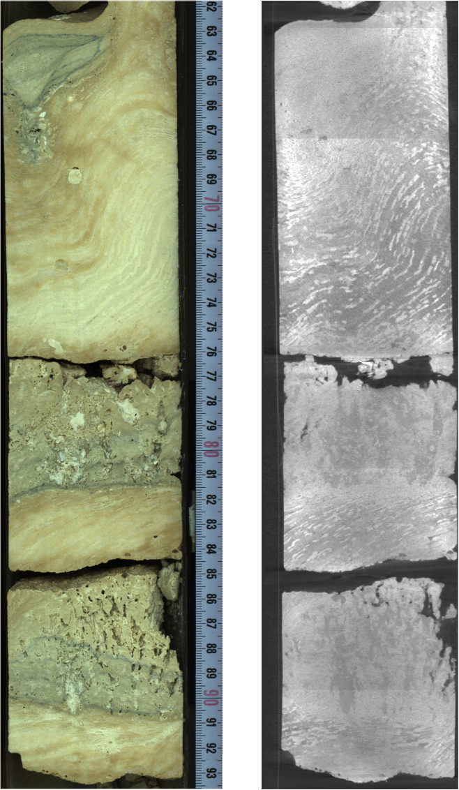 MSCL natural gamma radiation (NGR) measurements range 24–35 counts/s (Figure F2) with an increase at the contact between the carbonate facies (coralgal-microbialite boundstone) and underlying lava at ~12.66 mbsf.