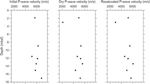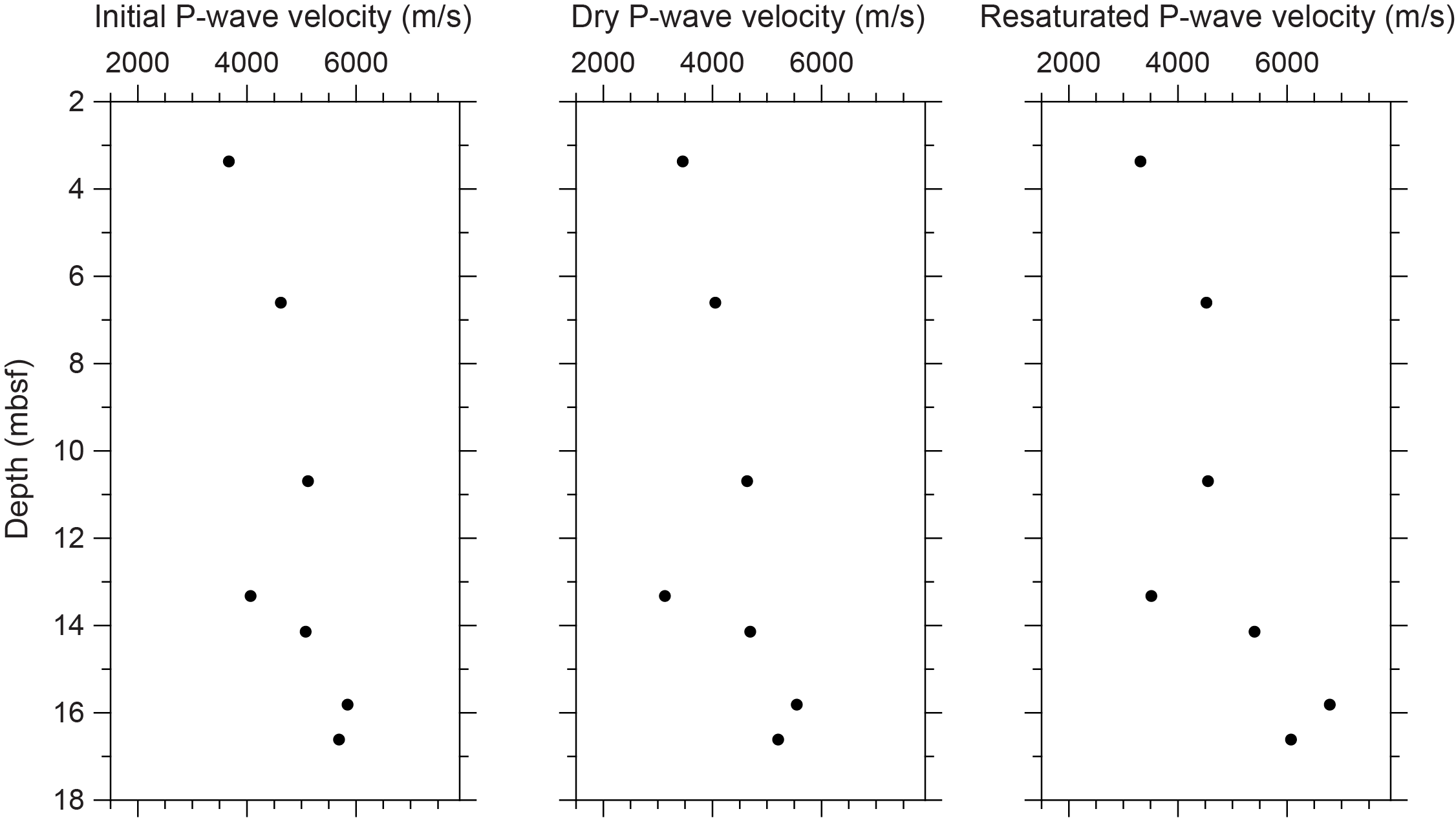 MSCL P-wave velocity measurements yielded no data. A total of eight samples were measured using the discrete P-wave logger. Dry measurement values range 2113–5601 m/s (Figure F13) and show little trend with depth. P-wave velocities recorded for the same samples after resaturation are between 2942 and 6090 m/s.