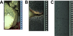 All cores were digitally scanned, and, where appropriate, measured for color reflectance and imaged with the hyperspectral scanner (see HYPERSPECTRAL in Supplementary material). Color reflectance L* values vary between 8.99% and 82.13%, a* varies between −1.64 and 3.67, b* varies between −1.28 and 24.38, and a*/b* varies between −1.76 and 1.00. (Figure F6). Variations in color reflectance parameters clearly show the transition from carbonate to lava in this core.