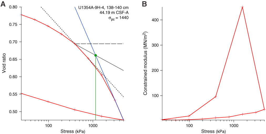 Figure F34. Results of uniaxial consolidation test (interval 317-U1354A-9H-4, 138–140 cm) represented by a semilogarithmic plot of (A) void ratio vs. vertical effective stress and (B) constrained modulus vs. vertical effective stress. Green dot = maximum past effective stress (σpc) derived by the graphical method of Casagrande (1936). σpc corresponds to the abscissa of the point of intersection between the backward projected virgin compression line (blue) and the bisecting line (black solid) between the horizontal line (black dashed) and the tangent (black dotted) at the point of maximum curvature of the consolidation curve (red).