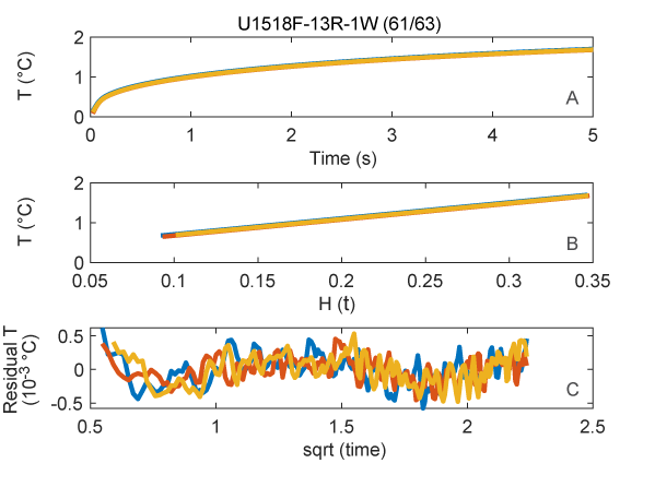 Figure F2 illustrates representative results from a set of three repeated experiments on Sample 375-U1518F-13R-1, 61–63 cm. Panel A shows the observed temperature rise over time for each replicate measurement. Panel B presents the same data plotted against the dimensionless function H(τ), demonstrating the linear relationship that enables inversion for thermal conductivity and diffusivity. Panel C displays the residuals between the observed and modeled temperature rise as a function of the square root of time, confirming the quality of the model fit and the consistency of the measurements.