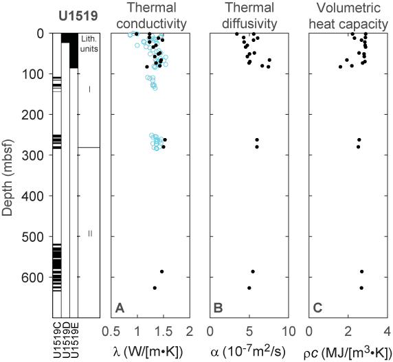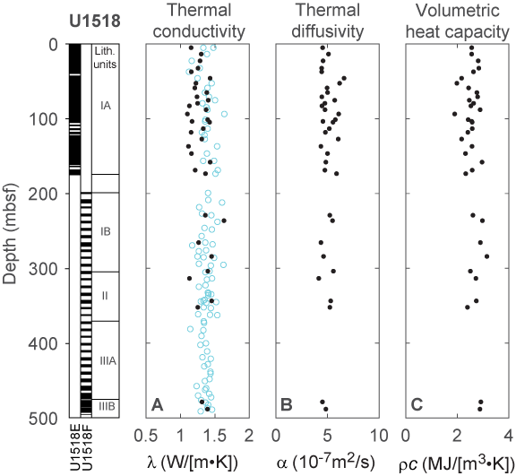 1 Fulton, P.M., and Kitajima, H., 2025. Data report: thermal diffusivity, thermal conductivity, and volumetric heat capacity at borehole observatory Sites U1518 and U1519, Hikurangi Subduction Zone, IODP Expedition 375. In Wallace, L.M., Saffer, D.M., Barnes, P.M., Pecher, I.A., Petronotis, K.E., LeVay, L.J., and the Expedition 372/375 Scientists, Hikurangi Subduction Margin Coring, Logging, and Observatories. Proceedings of the International Ocean Discovery Program, 372B/375: College Station, TX (International Ocean Discovery Program). https://doi.org/10.14379/iodp.proc.372B375.213.2025