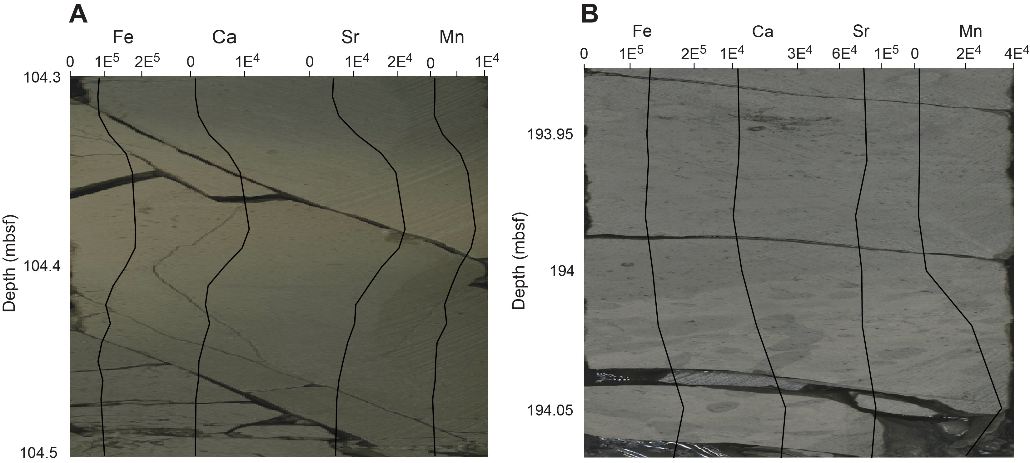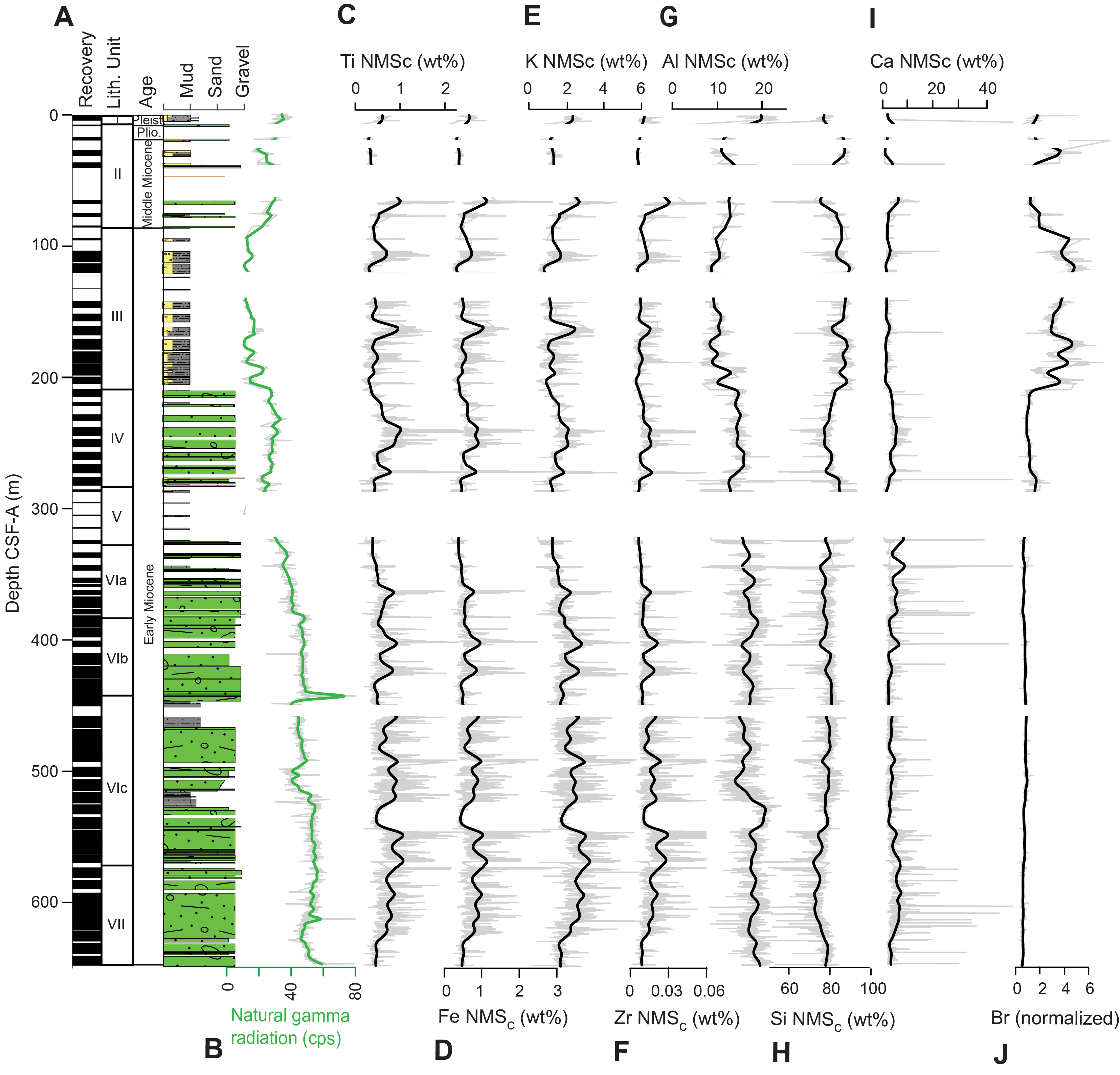 Downhole elemental variability corresponds to changes in sediment composition through time (Figure F2). Diamictites in Units I, II, IV, VI, and VII are characterized by higher NGR values (McKay et al., 2024). Lithogenic elements, including Ti, Fe, K, and Zr, have the highest maximum and mean values in diamictite lithologies (Table T2). Biogenic-associated elements, including Si and Br, have the highest mean values in diatom-bearing to diatom-rich mudstones (Table T2). In the lower part of Unit III, variations in NGR and Br indicate changes in the relative amounts of lithogenic and biogenic sediment. Finally, large peaks in Mn, Ca, and Sr in all units correspond with authigenic carbonates (Figures F3, F2I; Blanchet et al., 2007; Croudace and Rothwell, 2015).
