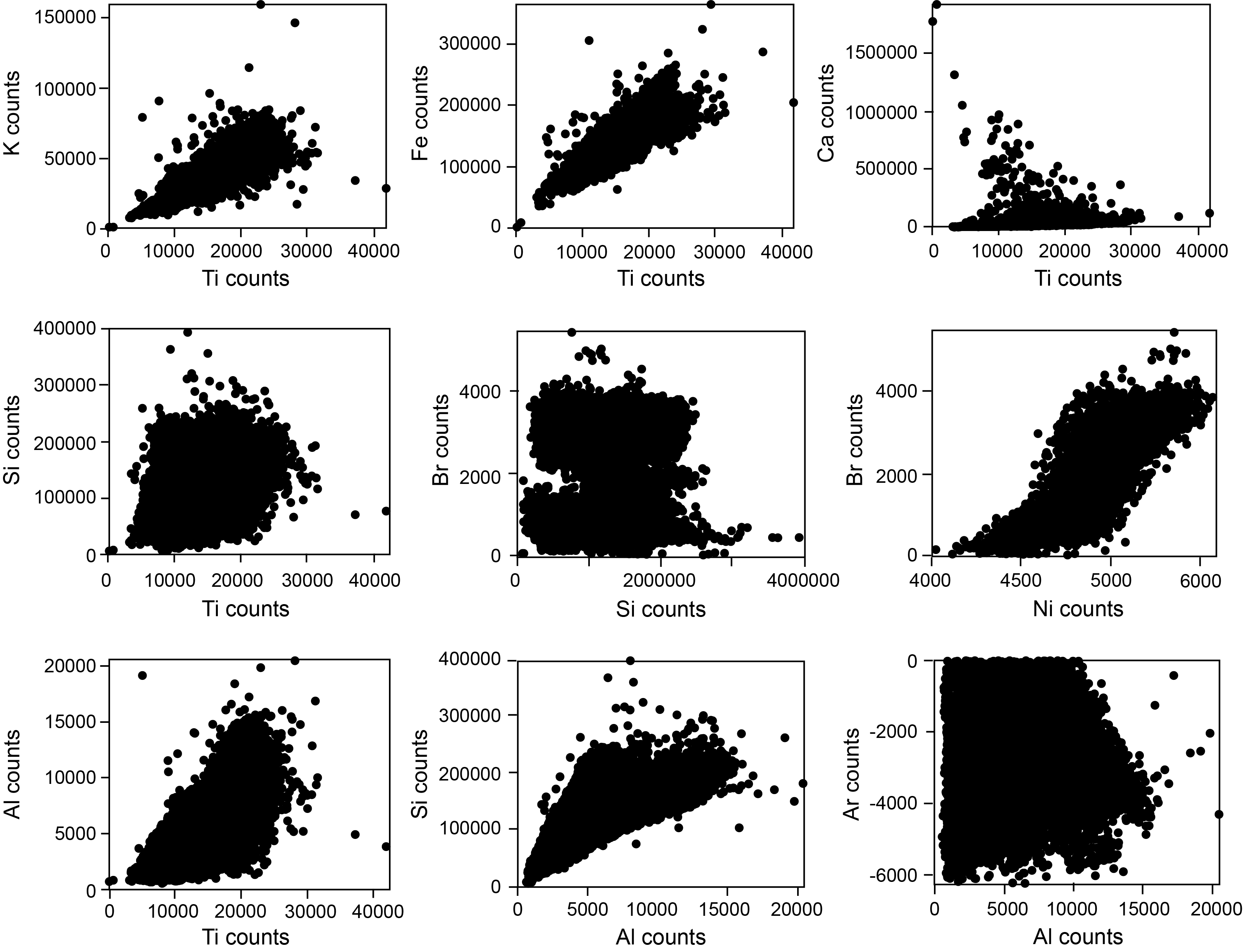 To verify relationships and correlations between elements commonly associated with terrigenous or biogenic sources at Site U1521 (e.g., Croudace and Rothwell, 2015; Gäng et al., 2023; Ziegler et al., 2008), we plotted raw elements against each other (Figure F4) and conducted a Spearman’s rank correlation with raw elements (Figure F6). We find positive relationships and strong positive correlations (ρ > 0.7) between terrigenous elements (e.g., Ti and K, Ti and Fe, and Ti and Al) and between biogenic elements (e.g., Br and Ni). We observe negative relationships and moderate to strong negative correlations between terrigenous and biogenic elements (e.g., Ti and Br and Ti and Ni). Ca, which can have terrigenous, biogenic, and authigenic sources (Calvert and Pedersen, 2007; Croudace and Rothwell, 2015), shows a bimodal relationship with Ti (predominately lithogenic), suggesting that Ca has multiple sources at Site U1521. Si, which can have terrigenous or biogenic sources (Calvert and Pedersen, 2007; Croudace and Rothwell, 2015), shows no relationship or significant correlation with Ti but does show a positive relationship and high positive correlation (ρ = 0.77) with Al.