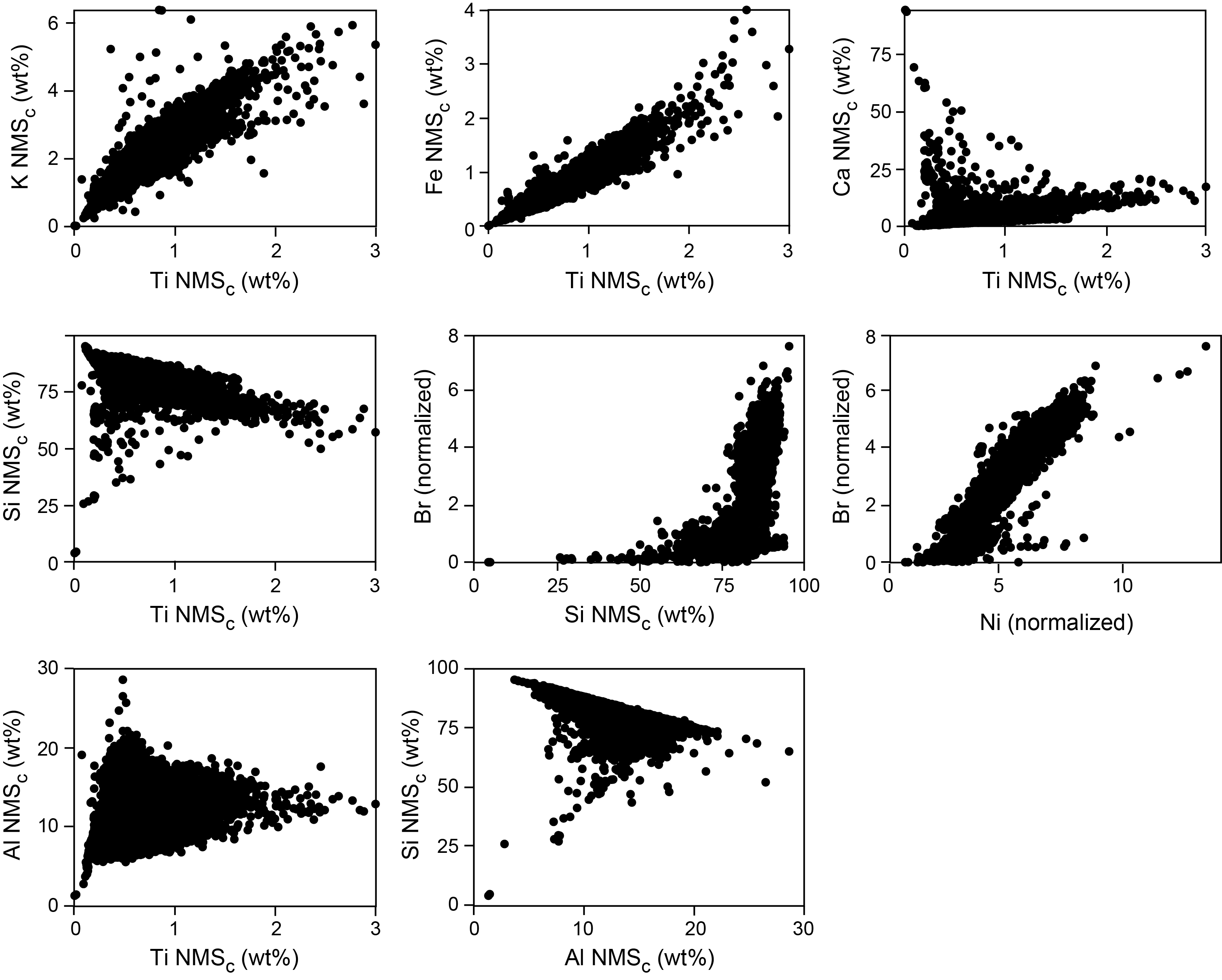 To investigate how normalizing and scaling influences relationships and correlations between elements, we plotted NMSc elements with each other (Figure F5) and conducted a Spearman’s rank correlation with NMSc elements (Figure F7). We still find positive relationships and strong positive correlations (ρ > 0.7) between terrigenous elements (e.g., Ti and K and Ti and Fe) and between biogenic elements (e.g., Br and Ni) and negative relationships and correlations between terrigenous and biogenic elements (e.g., Ti and Br). However, the normalizing and scaling method changes the relationships of Si and Al with other elements. The relationship between Si and terrigenous elements becomes negative with moderate to strong negative correlation (e.g., Si and Ti and Si and K), and the relationship and correlation between Si and biogenic elements become positive with strong positive correlations (e.g., Si and Br and Si and Ni). This indicates that in some lithologies, such as the diatomites and diatom-rich mudstones, Si is predominately a biogenic element. The relationship and correlations between Al and terrigenous elements become weaker, suggesting that the source of Al is complicated at Site U1521. Overall, we demonstrate that normalizing and scaling the XRF data at Site U1521 helps to correct the lighter elements Si and Al for attenuation of the signal.