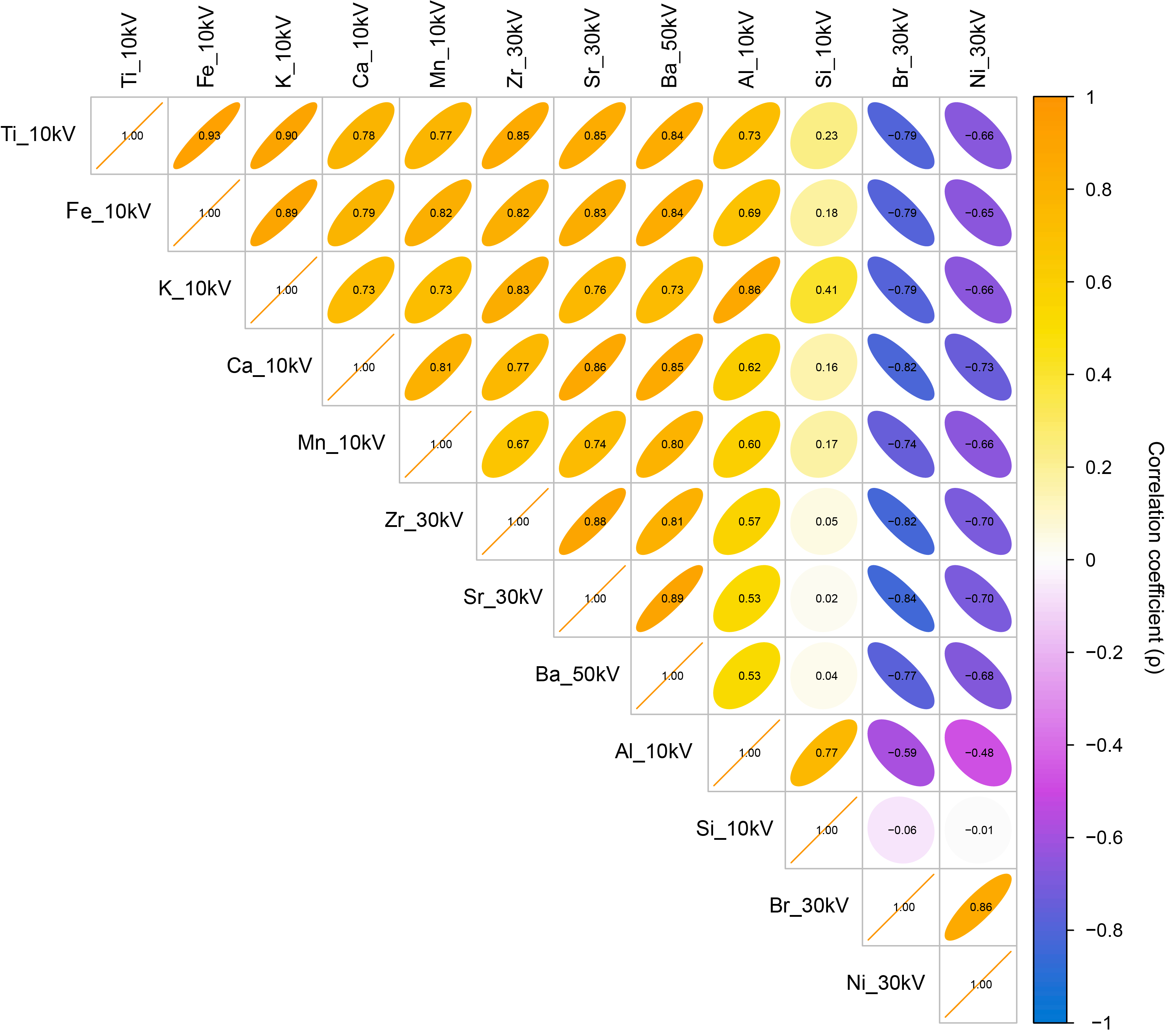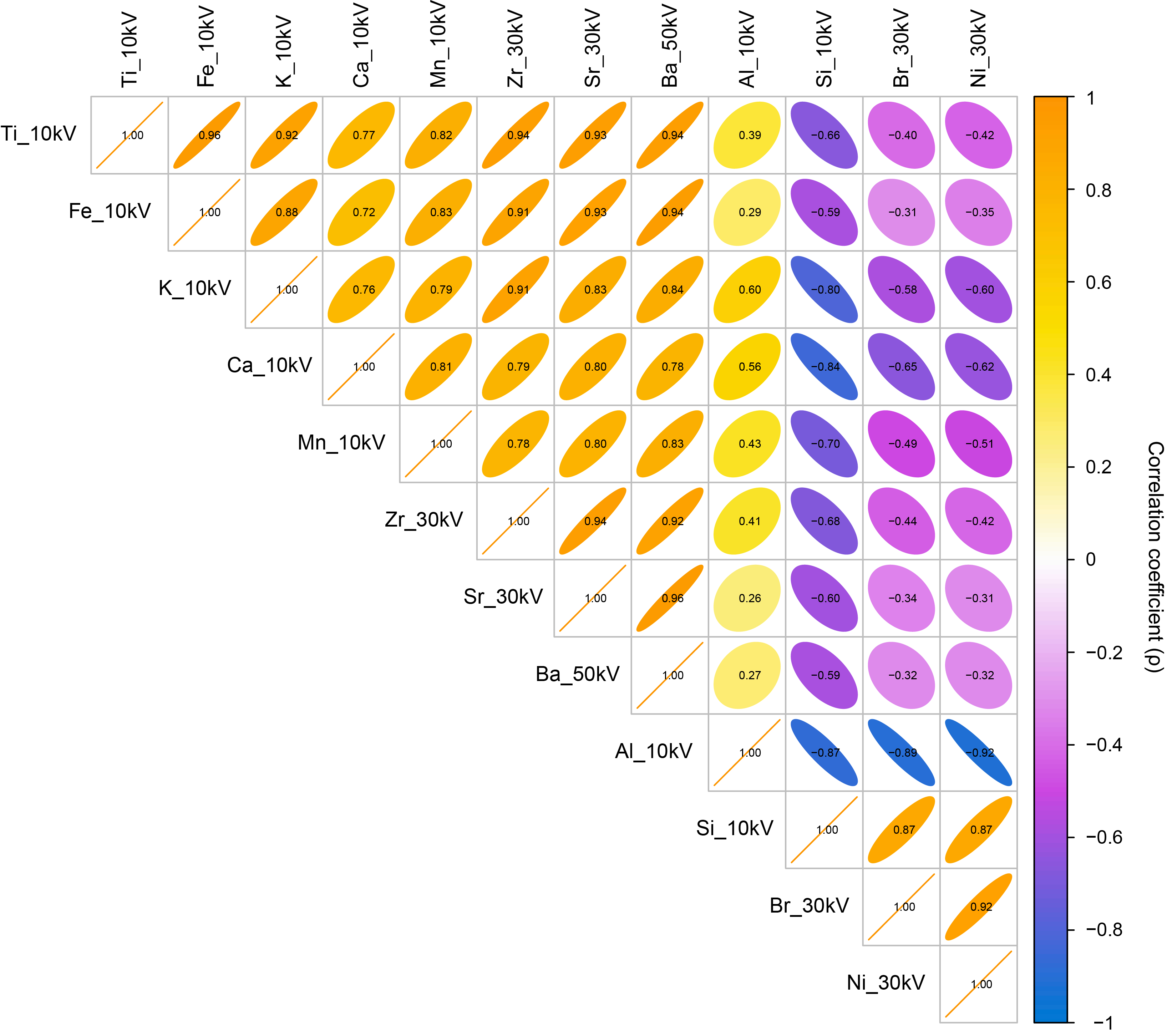 To investigate the relationships among elements, we use both crossplots (Figures F4, F5) and correlation analysis (Figures F6, F7). Because the raw and NMSc XRF data are not normally distributed, we conducted a Spearman’s rank correlation to determine the strength and direction of correlations between element pairs (Figures F5, F7). The strength of the relationship between elements is quantified with the Spearman’s rank correlation coefficient (ρ) and the strongest relationships between elements have a ρ > 0.7. Correlation analyses were performed using the cor function and plotted using the corrplot package in R (Figures F5, F7) (Wei and Simko, 2024; R Core Team, 2024).