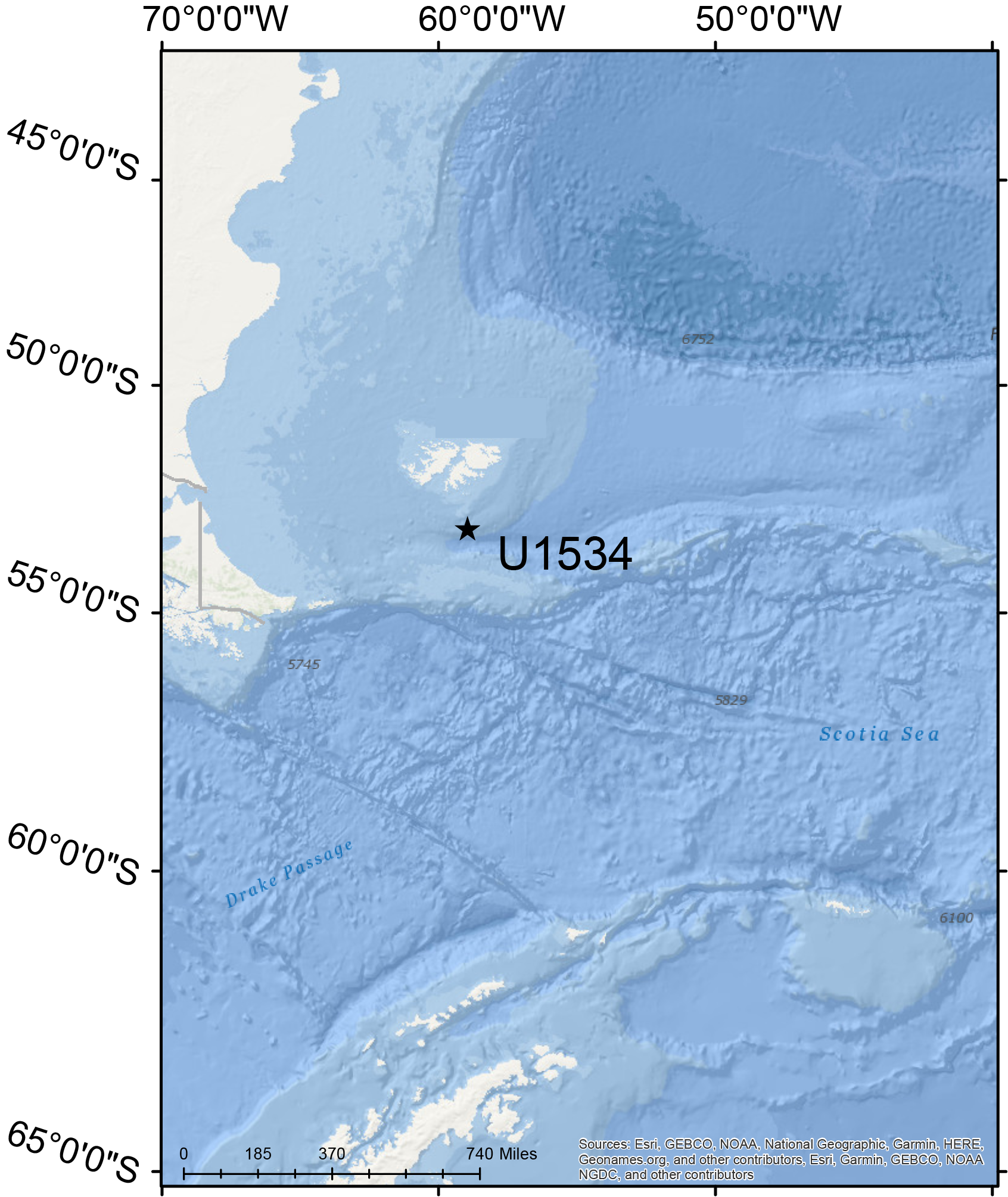 Site U1534 is located at 53°11.38′S, 58°45.65′W (Figure F1), and was drilled during International Ocean Discovery Program (IODP) Expedition 382. The site is located on the northern flank of an east–west trending trough on the continental shelf ~660 km east of the Strait of Magellan, making Site U1534 a primary target to track migrations of the Subantarctic Front on millennial to orbital timescales. Sediments at this site are comprised of contourite drift deposits and are currently deposited beneath the Subantarctic Front at a 600 m water depth (Weber et al., 2019).