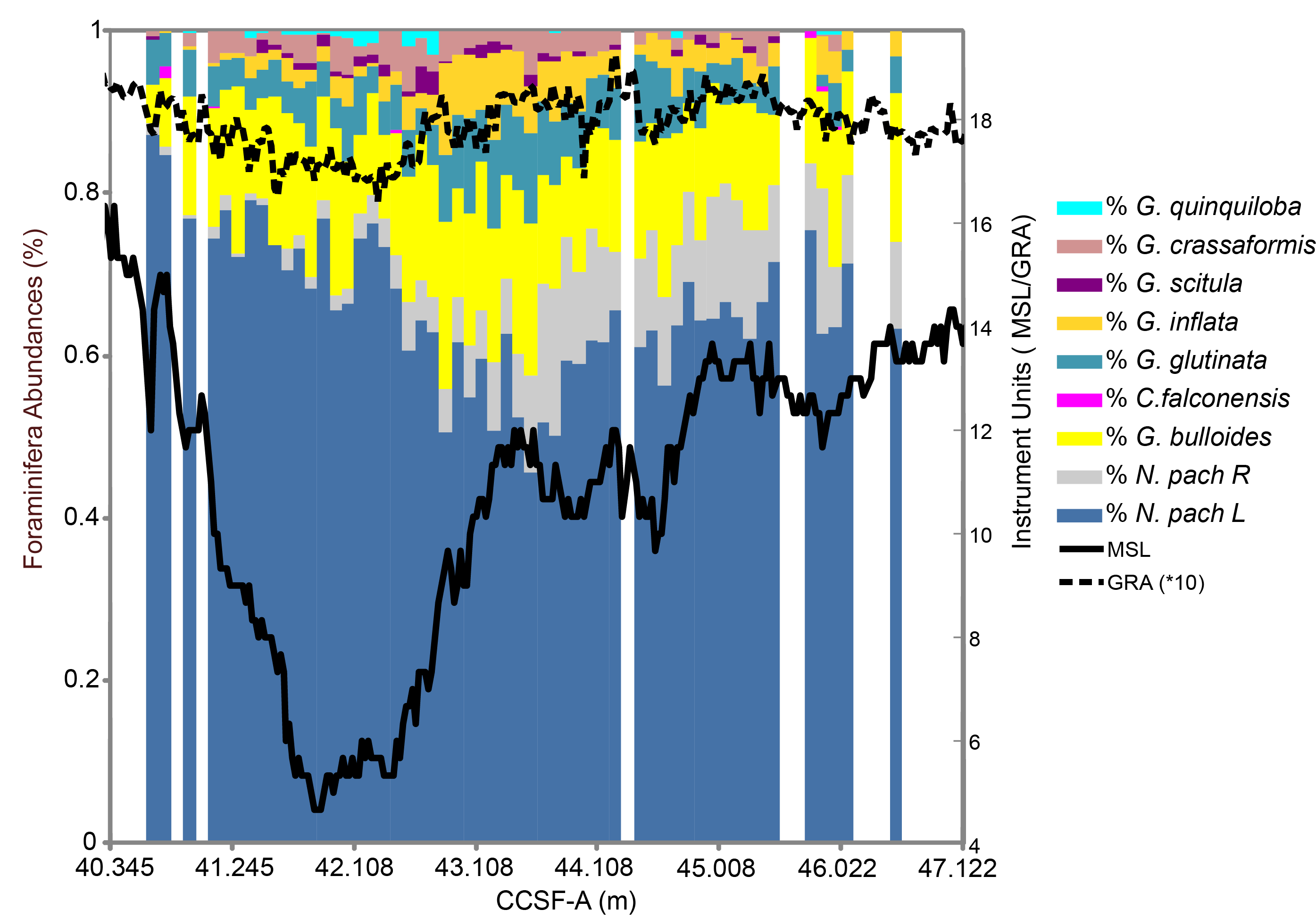 The relative species abundance data of the planktonic foraminifera are recorded in Table T1 and visualized in Figure F2. In general, foraminifera are absent above 40.625 m CCSF-A and below 45.408 m CCSF-A, with rare occurrences observed between 45.602 and 46.022 m CCSF-A. A single sample containing a rare specimen of N. pachyderma (sinistral), N. pachyderma (dextral), G. bulloides, Globigerinita glutinata, and Globigerina inflata was observed at 46.432–46.452 m CCSF-A. Preservation is mostly good with no obvious signs of dissolution. All assemblages are dominated by very small specimens (<125 µm). The lowest percentage of N. pachyderma (sinistral), implying the warmest upper ocean temperatures, is found at ~43–44 m CCSF-A and does not coincide with the lowest magnetic susceptibility data (MSL) and gamma ray attenuation (GRA) bulk density.