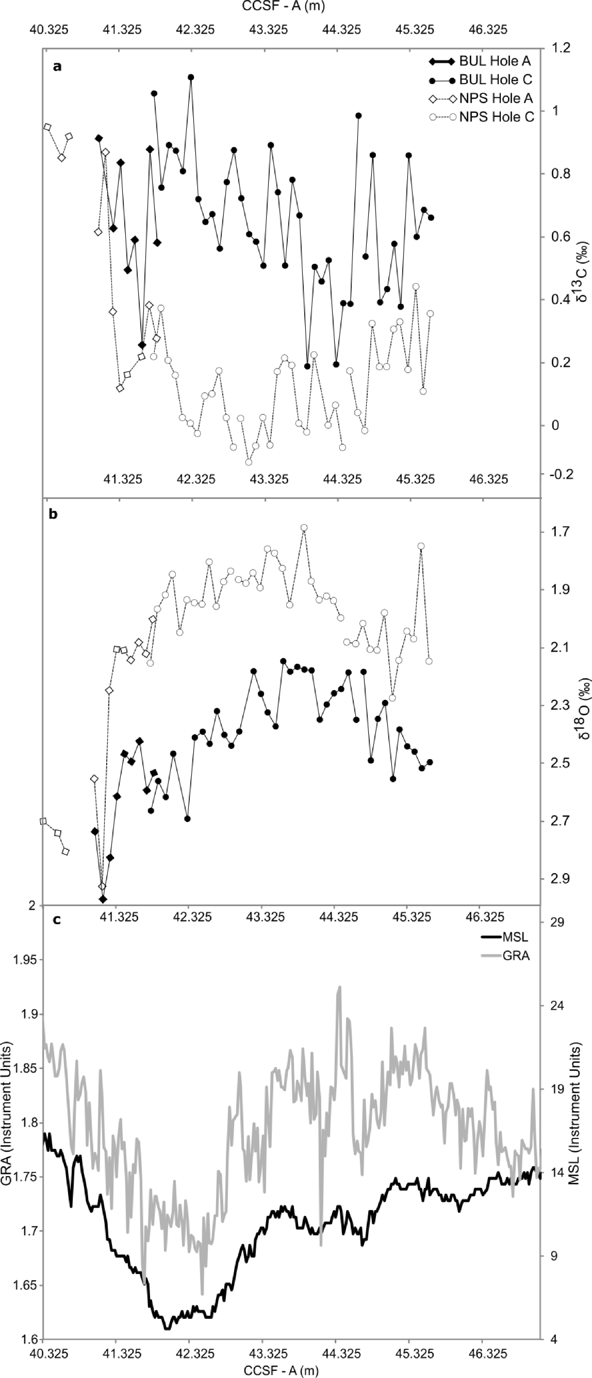 Planktonic foraminifera were collected from the splice at Site U1534 between 40.325 and 46.452 m CCSF-A, which corresponds to MIS 11. The planktonic assemblage is dominated by N. pachyderma (sinistral), with minor occurrences of other calcareous species; the lowest N. pachyderma (sinistral) abundances suggest the warmest upper ocean temperatures at ~43–44 m CCSF-A. δ18O values oscillate through the section but are generally lowest near 43–44 m CCSF-A, in agreement with foraminifera species percentages during interglacial events such as MIS 11 near ~400–410 ka BP (Lisiecki and Raymo, 2005). Relatively warm conditions precede the lowest MSL and GRA bulk density values of the interval, which are near 41.5–42.5 m CCSF-A, indicating that lithologic variability within this interval does not reliably determine glacial–interglacial chronology. The δ18O is up to ~1‰ lower than observed in nearby Holocene sediments.