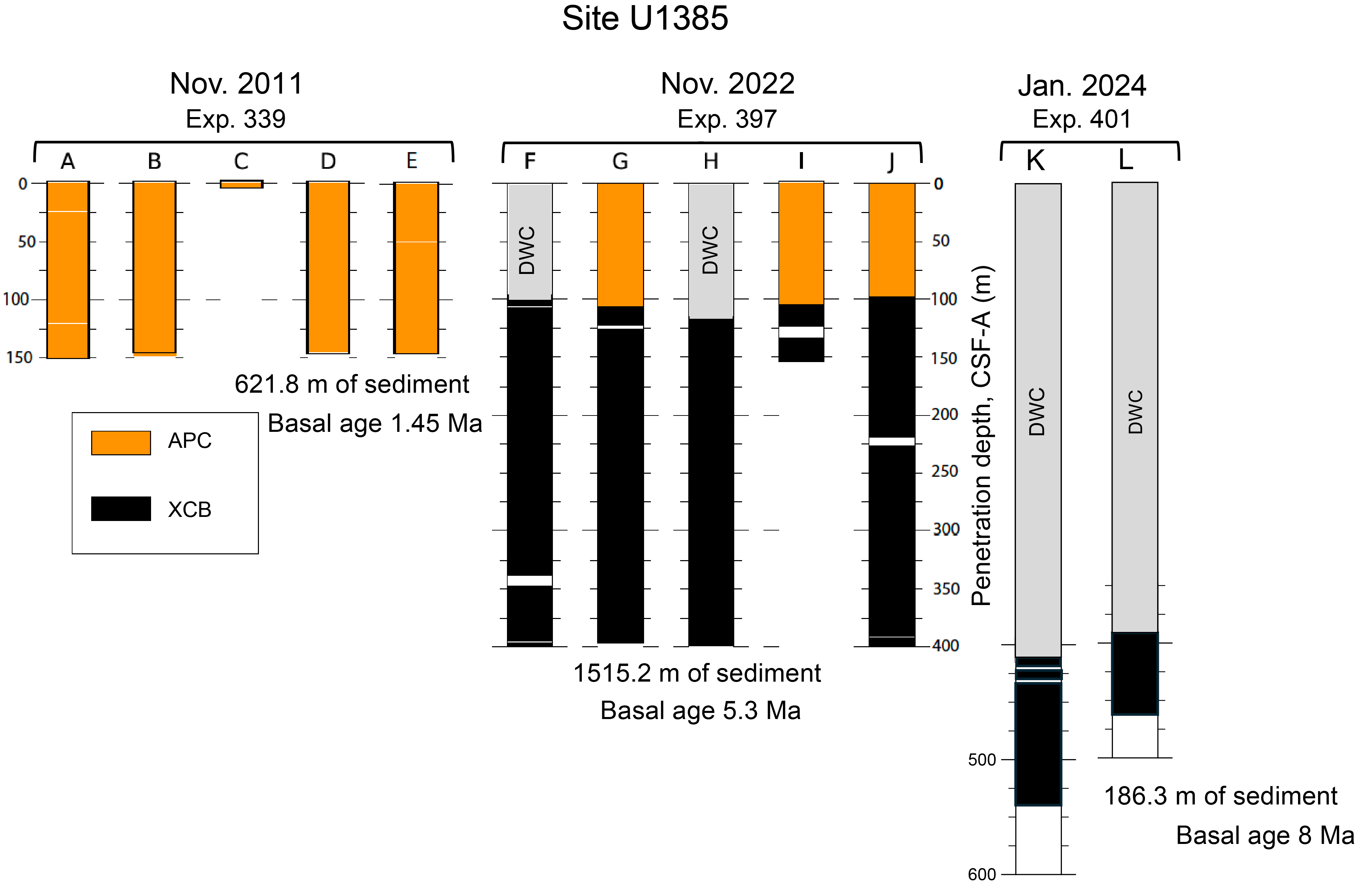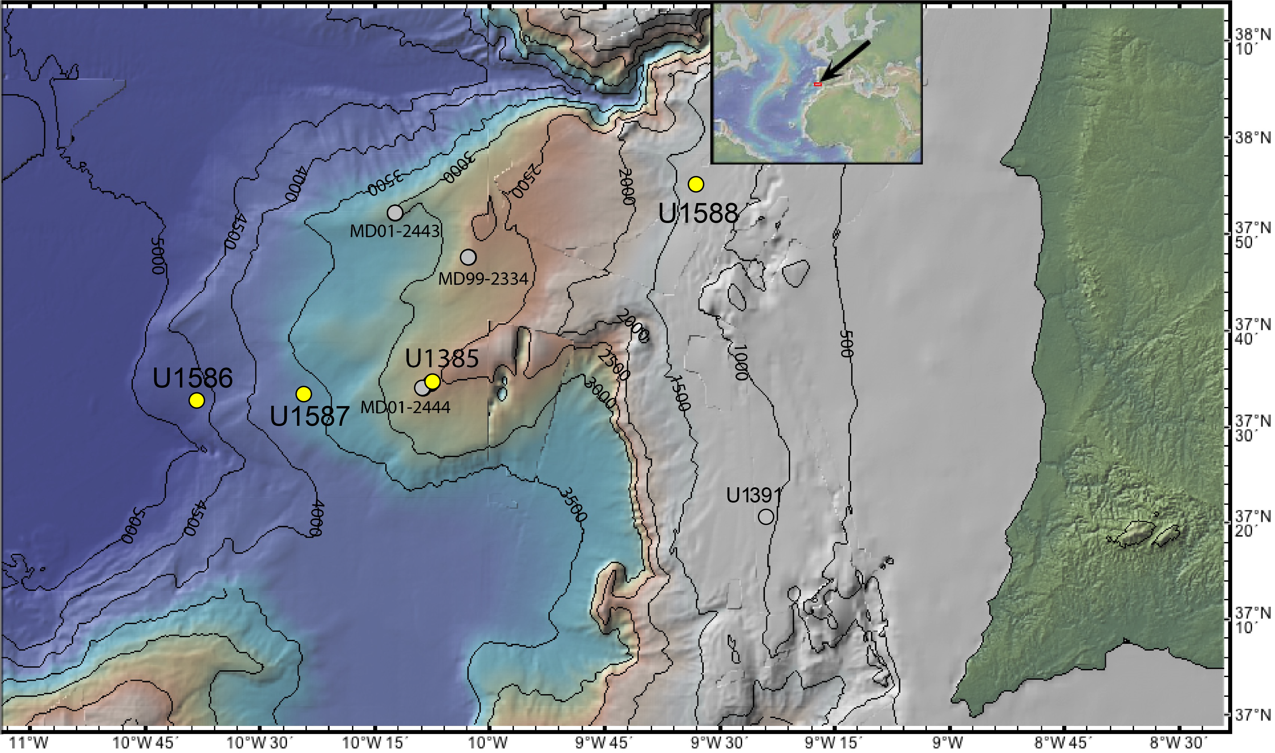 International Ocean Discovery Program (IODP) Site U1385 (37°34.285′N, 10°7.562′W; 2578 m below sea level), referred to as "the Shackleton site," has become a benchmark record for millennial climate variability (MCV) for the last 1.45 My (Figure F1) (Hodell et al., 2023). The site was first drilled in November 2011 during Integrated Ocean Drilling Program Expedition 339 when cores from Holes U1385A–U1385E were recovered (Expedition 339 Scientists, 2013; Hodell et al., 2013b), reaching a maximum depth of 151.5 meters below seafloor (mbsf) (Figure F2). In November 2022, the site was reoccupied during IODP Expedition 397 when Holes U1385F–U1385J were drilled, extending the sedimentary section to 400 mbsf (Hodell et al., 2024b). Most recently, IODP Expedition 401 returned to the site and deepened it to 552.5 mbsf (Flecker et al., 2024). Reoccupations of Site U1385 are designated by prefixing the site name by its expedition numbers: 339-U1385, 397-U1385, and 401-U1385.