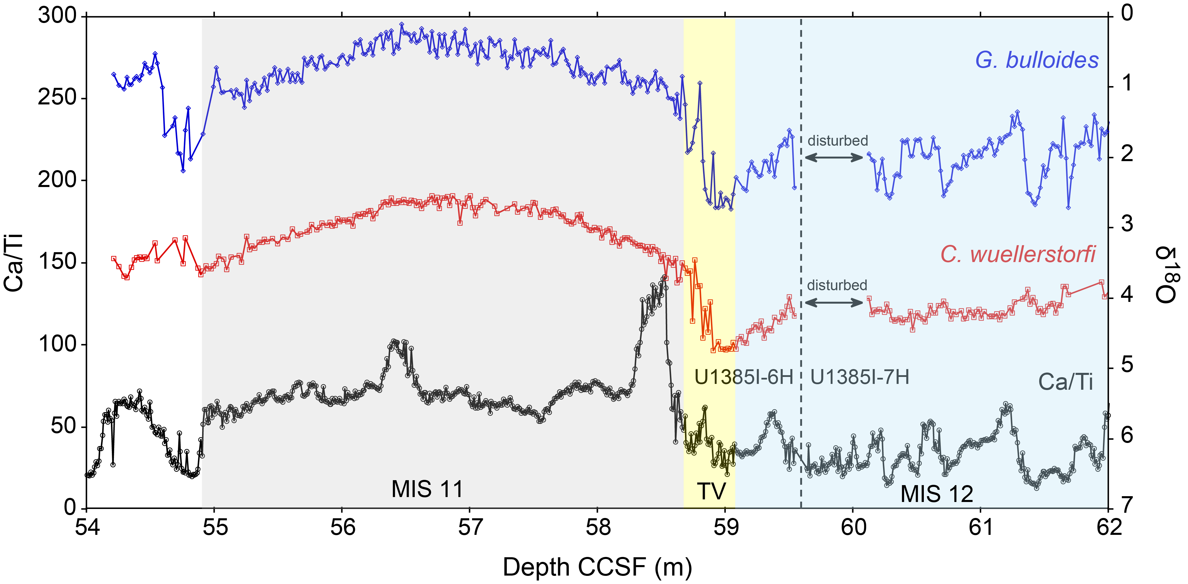 Site 339-U1385 contains a stratigraphic hiatus that removed part of Termination V and MIS 11. Recovery of MIS 11 has proven difficult during the two expeditions; however, Core 397-U1385I-6H captured the high-carbonate, sticky mud deposited during this interval (Figures F4, F5). The Ca/Ti record clearly shows two peaks related to the two precession minima that occurred during MIS 11e. Oxygen isotope analysis of foraminifers further confirms the presence of Termination V and MIS 11 in Core 6H (Figure F6).