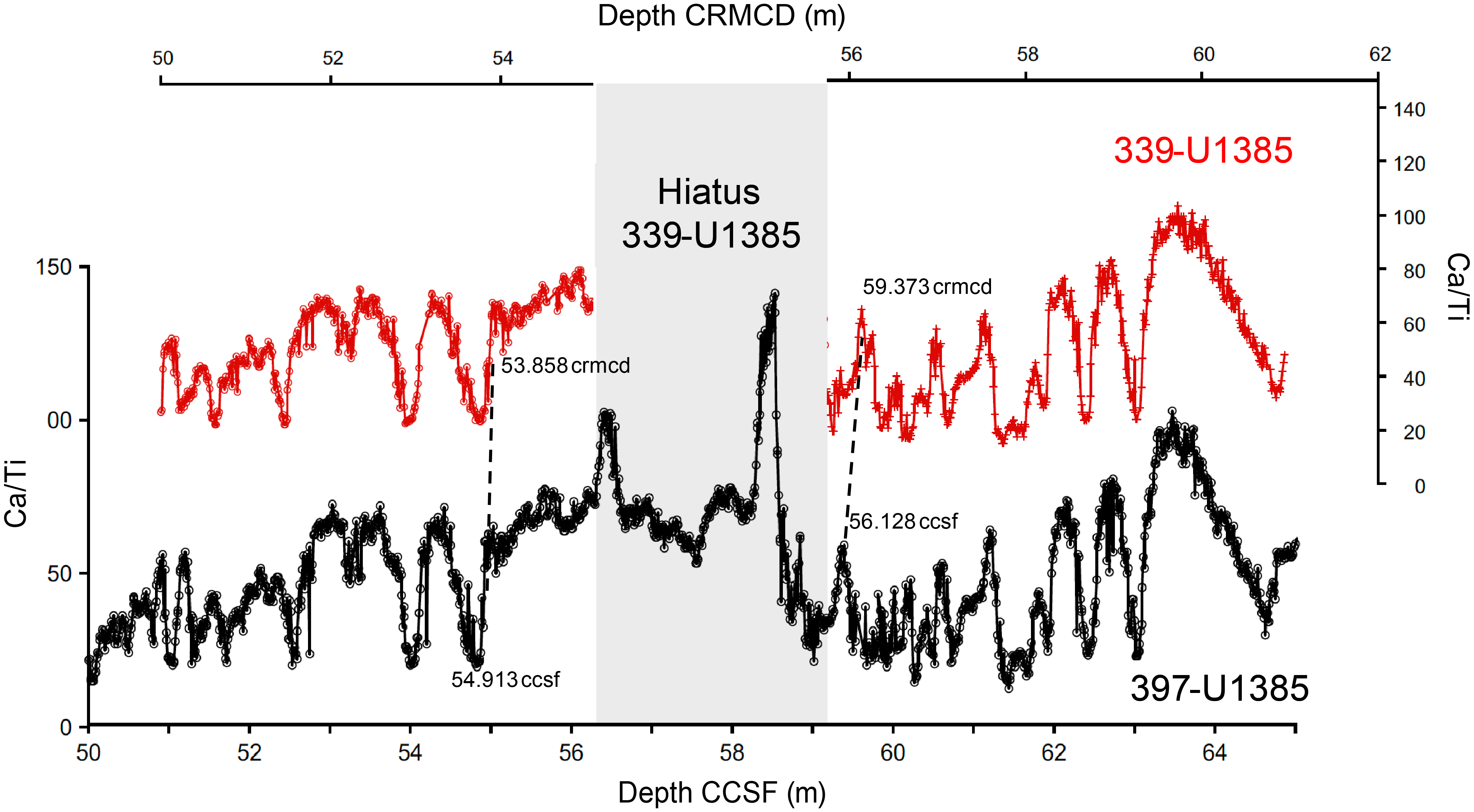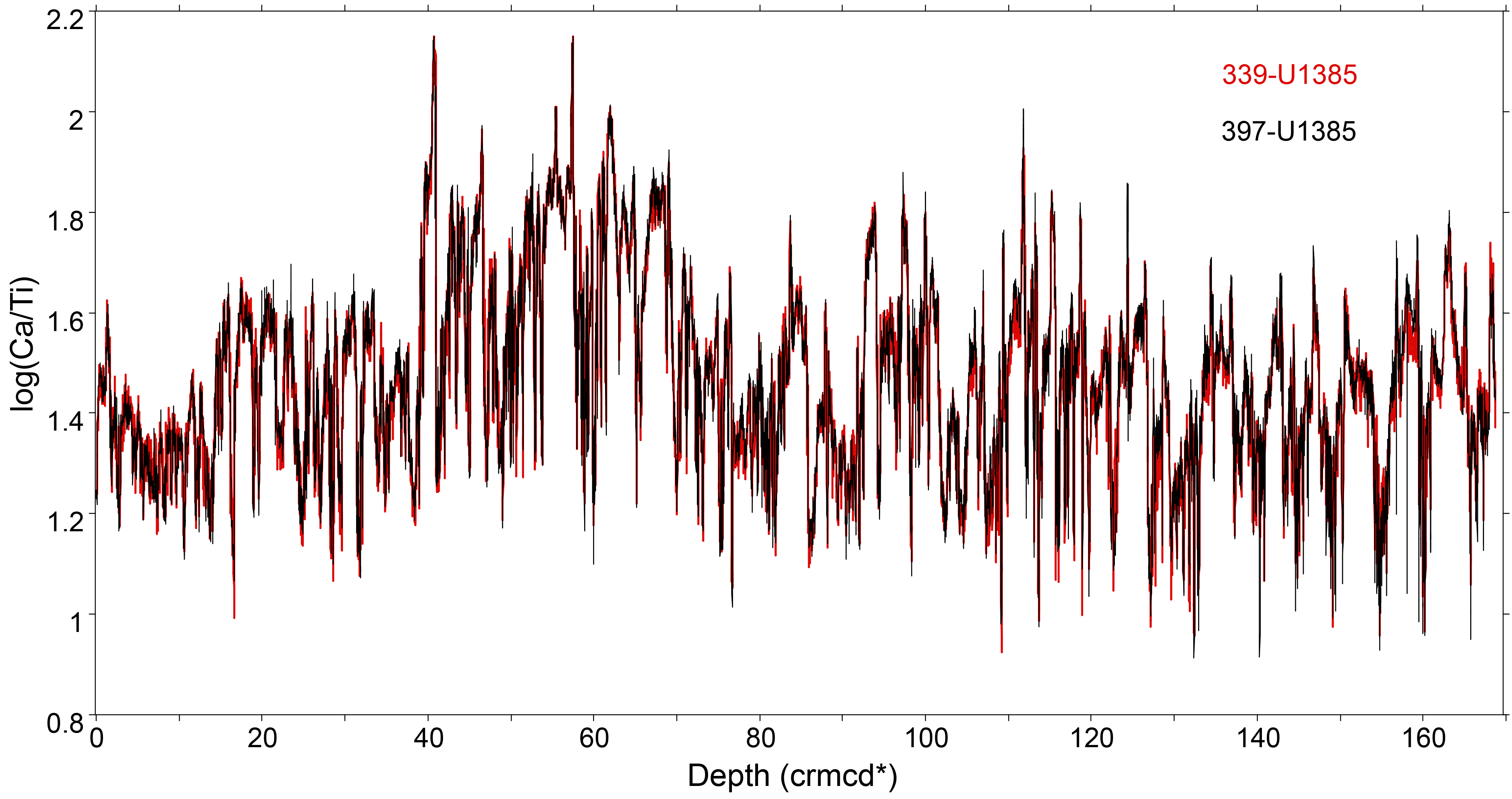 Dynamic time warping is a family of algorithms that optimally aligns two time series by stretching and squeezing one series to match the other. We used the Match algorithm (Lisiecki and Lisiecki, 2002) to optimally align the spliced Ca/Ti signal of Site 397-U1385 with that of Site 339-U1385 (Figure F7). The Ca/Ti signals were first smoothed with a Gaussian process (GP) filter from the GPy Python library (https://gpy.readthedocs.io/en/deploy/GPy.core.html with a Matern32 kernel). This treatment allowed for alignment of the records to within a few centimeters accuracy. Match provides default penalty settings for the length of the equivalent sections (nomatch), average scaling of the mapping (speedpenalty), deviation from constant scaling of the alignment (speedchange), and adherence to the inserted tie point (tiepenalty). The speedpenalty and speedchange were relaxed slightly to improve the total penalty score by ~10% compared to the default settings. The warping function consists of 1198 match pairs of CCSF depths at Site 397-U1385 to equivalent crmcd* depths at Site 339-U1385. Linear interpolation between match pair points is used to calculate the crmcd* depth for any CCSF depth value. The base of the Site 339-U1385 record (168.702 crmcd*) corresponds to 178.4 m CCSF. Below this level, 9.698 is subtracted from the Site 397-U1385 CCSF depth to calculate crmcd*.