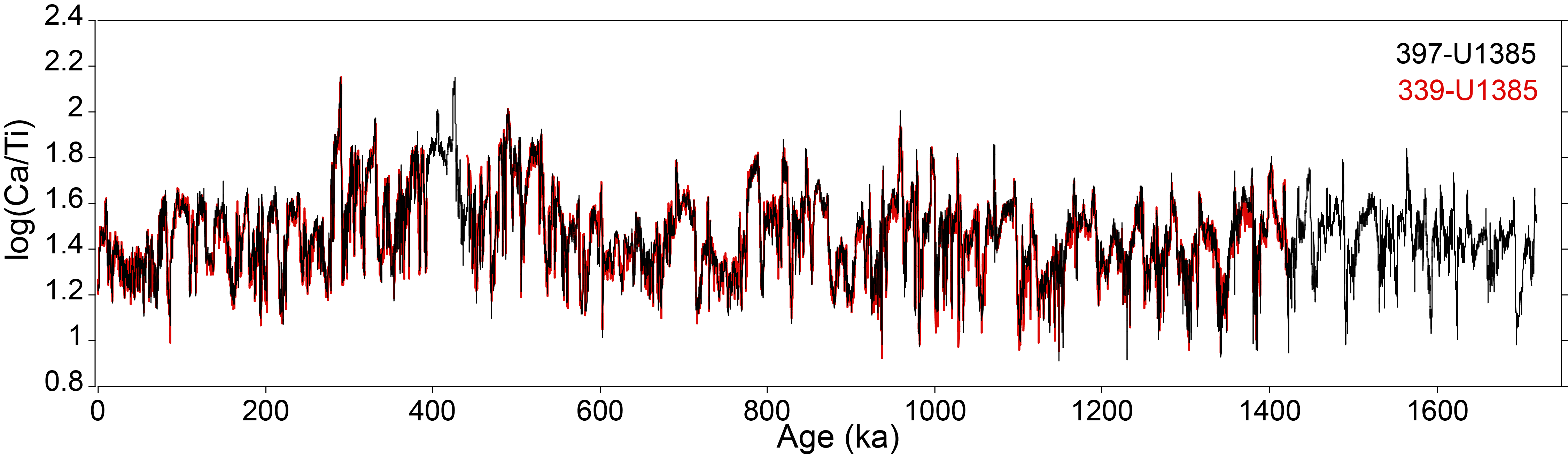 For the past 1.45 My, the age model for Site 397-U1385 was obtained by precisely correlating its Ca/Ti record with that of Site 339-U1385 (Figure F8). This high-resolution correlation enables the direct transfer of any existing age model from Site 339-U1385 to Site 397-U1385 (Figure F9).