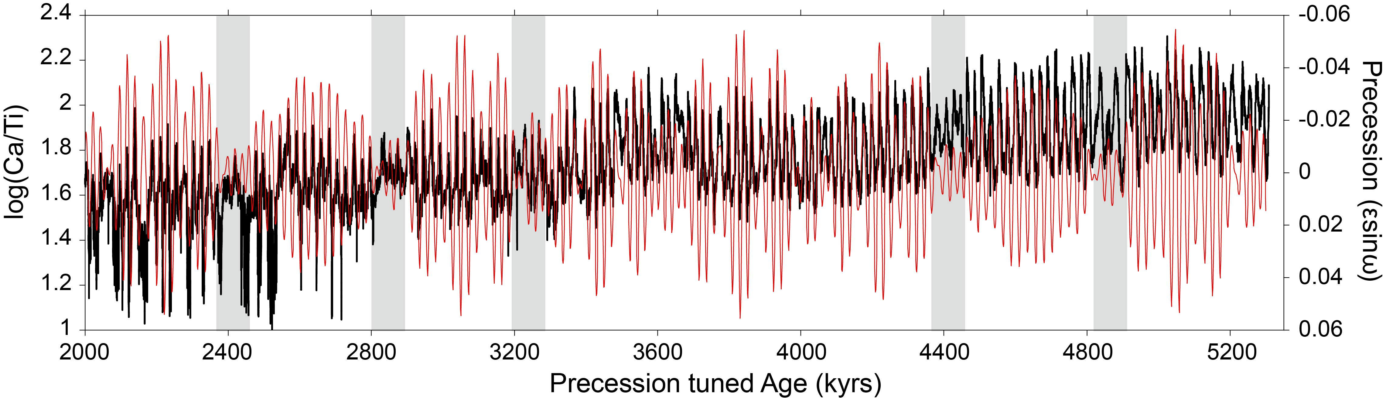 Beyond 2 Ma, strong precession-driven cycles in physical properties (e.g., color reflectance and magnetic susceptibility) and XRF-derived elemental ratios (e.g., Ca/Ti) provided the basis for constructing an astronomically tuned age model for Site 397-U1385. Peaks in Ca/Ti were aligned with precession minima, corresponding to maxima in Northern Hemisphere summer insolation with no lag. The amplitude modulation of precession by eccentricity provides a robust framework for unambiguous tuning between ~2 and 5.3 Ma (Figure F11). The reproducibility of the Ca/Ti precession cycles at Sites U1385, U1586 (Abrantes et al., 2024b), and U1587 supports the continuity of the spliced sections. A low-resolution benthic oxygen isotope record permits identification of MISs to 3.4 Ma (Figure F10). The generally good agreement between Site U1385 benthic δ18O on the precession-tuned timescale and LR04 stack provides support for the astrochronology.