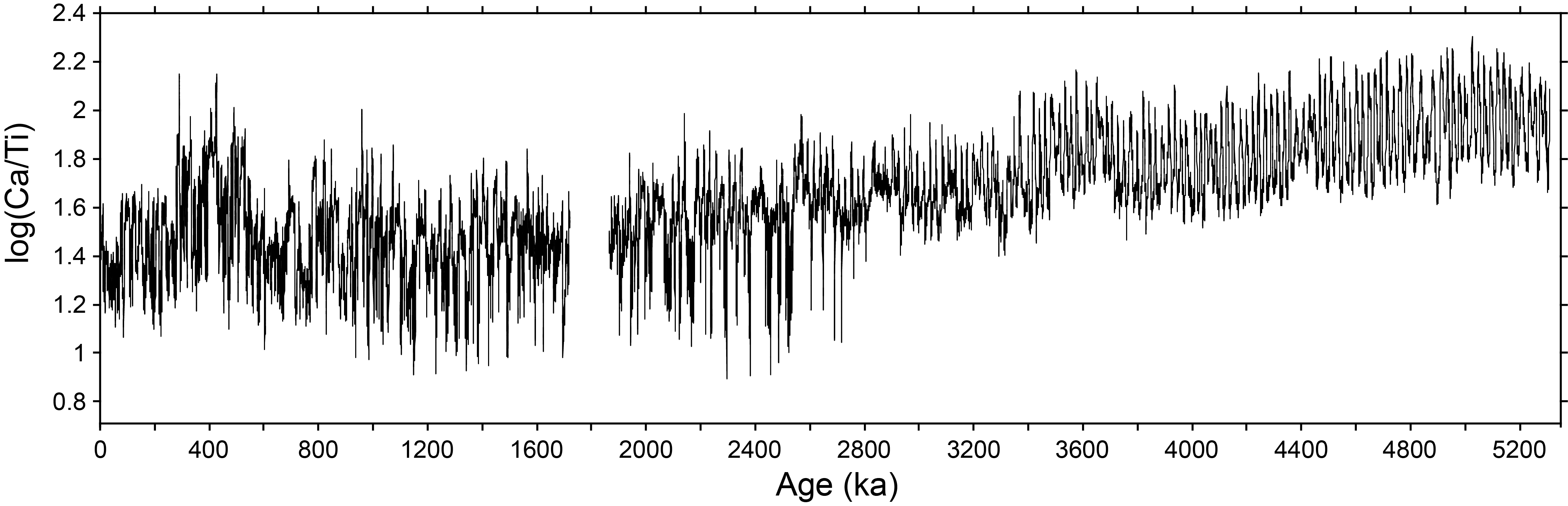 Sedimentation rates average 5.4 cm/ky from 5.3 to 3 Ma when they begin to increase until leveling off at ~2.5 Ma (Figure F12). This increase reflects enhanced clay delivery to the site during times of lowered sea level associated with stronger glaciations following the intensification of Northern Hemisphere Glaciation (Hodell et al., submitted). Sedimentation rates average 11 cm/ky during the Quaternary. The sampling frequency of the XRF data is 1 cm, which translates into an average sampling rate in time of about 200 y for the Pliocene older than 3 Ma and 100 y thereafter in the latest Pliocene and Quaternary. Although the actual resolution is likely to be greater because of bioturbation and drilling disturbance (e.g., biscuiting in extended core barrel [XCB] cores), it is nevertheless high enough to detect millennial events.