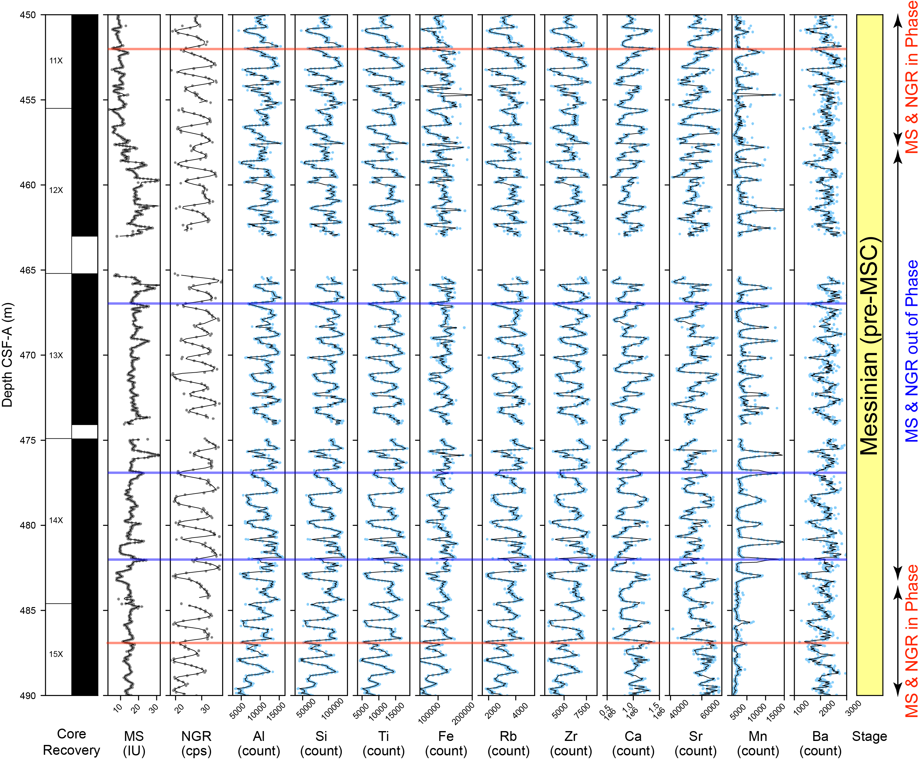 The observed cyclicity is likely to be precessional and reflects the lithologic changes (clay–ooze alternation) in the Site U1385 cores (Flecker et al., 2025a). Typically, peaks in MS and NGR are in phase, and they coincide with peaks in terrigenous elements (Al, Si, Ti, Fe, and Zr) and troughs in biogenic elements (Ca and Sr) (Figure F4). An exception to this is the interval in Hole U1385K between ~458 and 482 m core depth below seafloor, Method A (CSF-A), where MS and NGR are out of phase (Flecker et al., 2025a). The correlation with the XRF elements in this interval remains the same, with troughs in NGR coinciding with troughs in terrigenous elements and peaks in biogenic elements. Interestingly, this interval coincides with a prominent increase in the Mn counts (Figure F2) and where Mn peaks reach relatively high counts (>10,000 counts; Figure F4). The interval with high manganese peaks also appears to be cyclic. The high manganese peaks are in phase with peaks in the biogenic elements Ca and Sr (Figure F3).