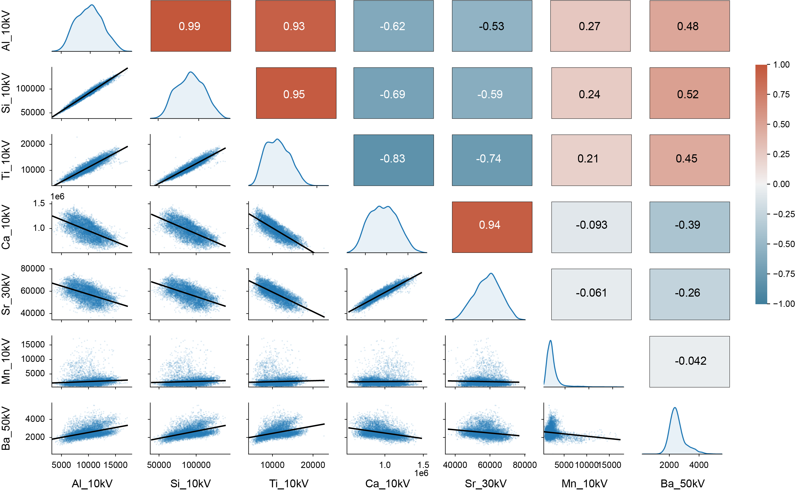 In this report, the plotted elements Al, Si, Ca, Ti, Mn, and Fe are from the 10 kV scan; Rb, Sr, and Zr are from the 30 kV scan; and Ba is from the 50 kV scan.