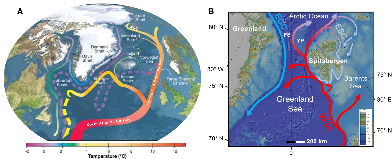 As the WSC flows north of Svalbard, it splits into two main currents (Figure F2). One branch (the North Spitsbergen Current) flows northeast along the Eurasian continental margin, where it divides into a returning current following the eastern and southern margin of Spitsbergen (East Spitsbergen Current; Figure F2), and a branch that moves along the north Eurasian margin, ultimately contributing to the counterclockwise current system that encircles the entire Arctic basin and returns to the North Atlantic Ocean via the EGC. The other branch (the Yermak Slope Current) flows more directly north at intermediate depths along the western margin of the Yermak Plateau, transporting relatively warm North Atlantic waters into the central Arctic Ocean interior.