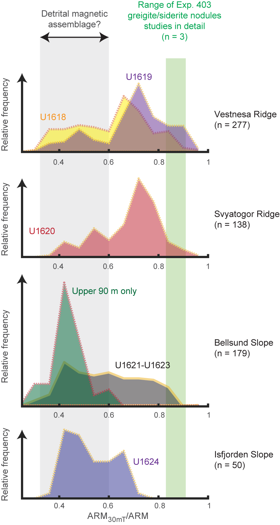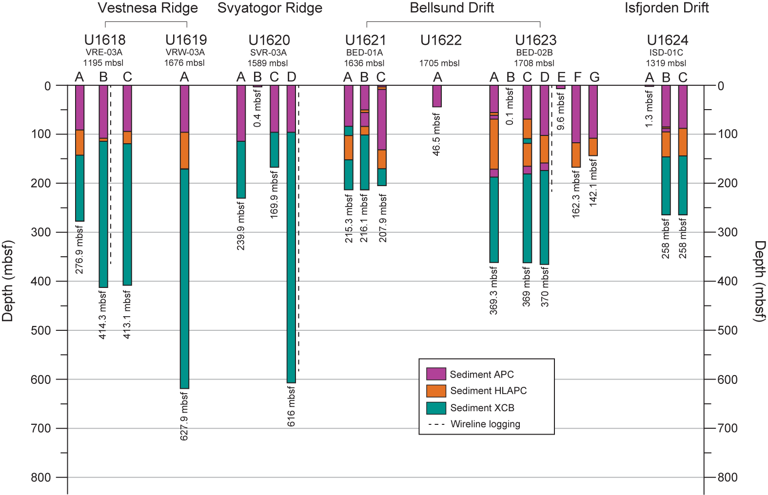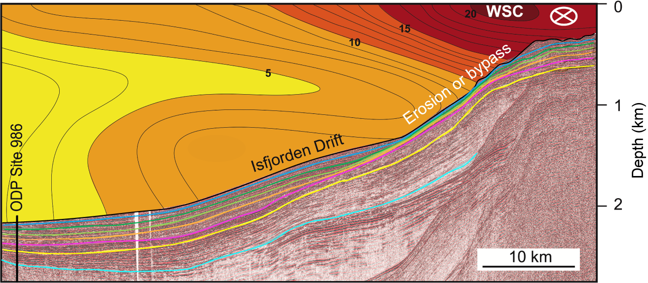 - The region between the active spreading Knipovich Ridge and the western Svalbard continental slope. ODP Site 986 (Leg 162) and the southernmost Expedition 403 sites are in this region. The Expedition 403 Sites U1621–U1624 are situated on plastered sediment drifts deposited along the continental slope (Bellsund and Isfjorden drifts) or on the deeper portion of the Storfjorden trough mouth fan (TMF) (Site U1622).