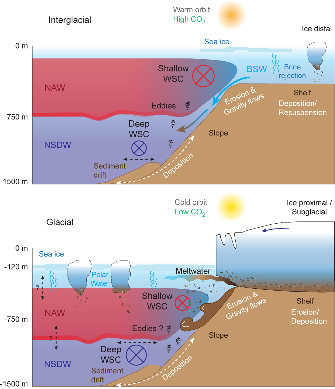 During warm interglacials, the sedimentation is dominated by bottom currents (Figure F4), generating condensed sequences in the upper slope where the current speed is higher and expanded sequences in the lower slope where drifts of fine-grained and strongly bioturbated sediments build. Presently, and possibly during past interglacials, sediment input from nearshore settings is delivered by downslope cascading of brine-enriched shelf water (BSW), which forms during winter through persistent freezing and brine rejection (Quadfasel et al., 1988; Schauer, 1995; Skogseth et al., 2005). Dense BSW, moving across the shelf, resuspends seafloor sediments that are transported to the shelf break and delivered to the deeper environments entering the NSDW and transported northward or deposited in sediment drifts. This process is thought to be the present principal mechanism responsible for initiation of slope convection not only in the Arctic Ocean but all the Arctic areas, including the western margin of Svalbard, contributing significantly to the overall heat and salt balance of the deep Arctic Ocean basins and thus providing ventilation to the deeper environments (Fer et al., 2003; Schauer et al., 2004).