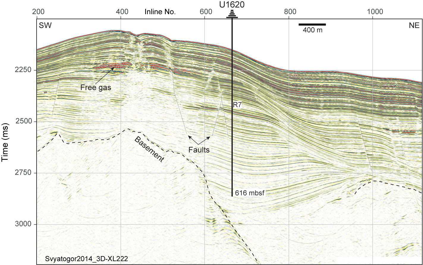 - Constraining the spatial location of the Miocene–Pliocene transition (~5.3 Ma) north and south of the MTF, at the Vestnesa Ridge and the Svyatogor Ridge, respectively, thus reducing the existing uncertainties about the spreading rate of the Molloy and north Knipovich Ridges inferred from magnetic anomalies Chron 2A (2.8 Ma) and Chron 5 (9.8 Ma) (e.g., Engen et al., 2008; Johnson et al., 2015). Geomechanical and petrophysical data from these key regions will help constrain spatial variations in the effect of glacial and tectonic stresses on subseabed sediment deformation. In addition, such data can inform our understanding of carbon migration within sediment and carbon transfer between sediment-ocean-atmosphere reservoirs under different paleoclimatic conditions.