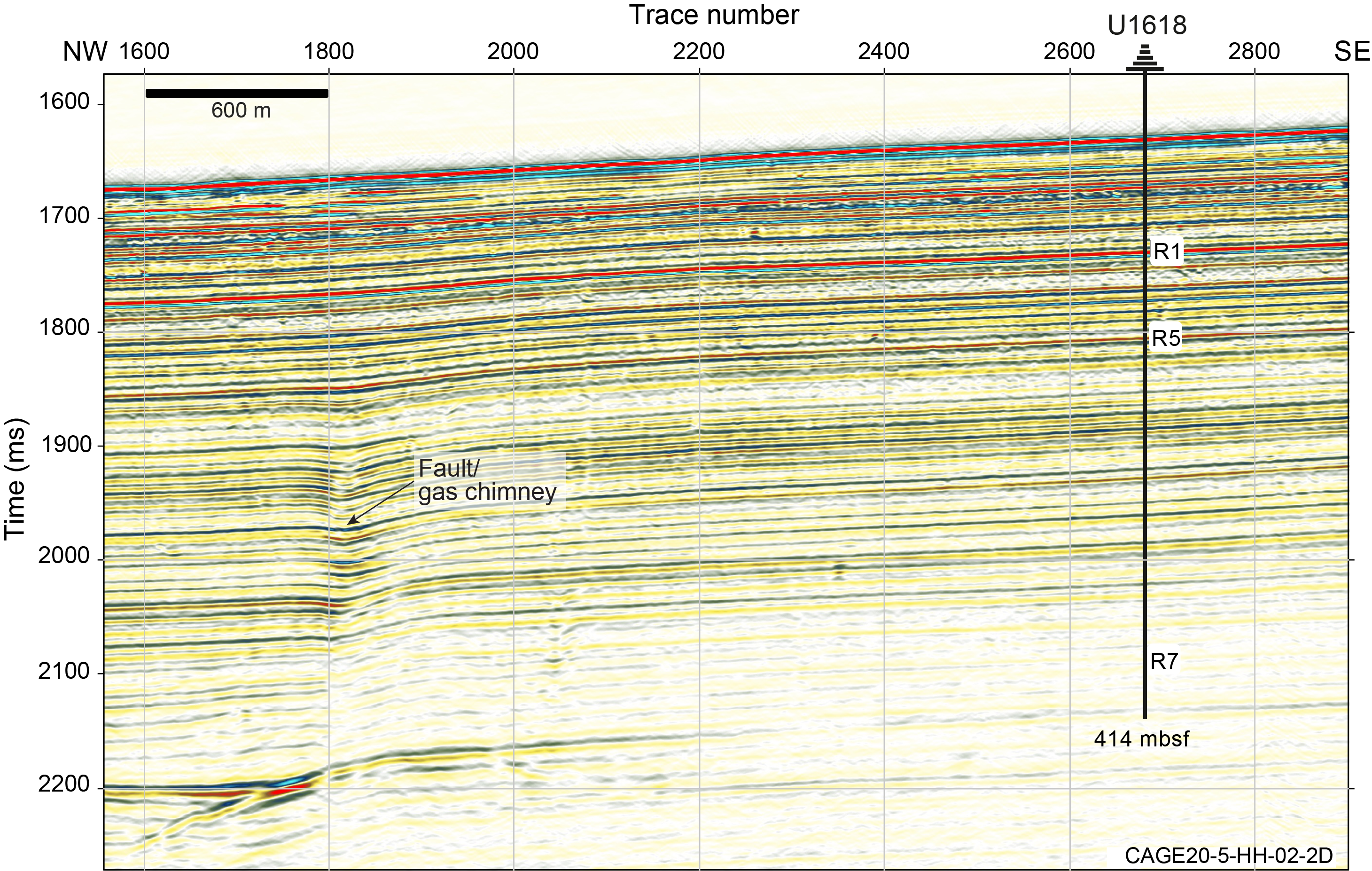 Site U1618 (Figure F1), located on the Vestnesa Ridge East termination, was chosen for its proximity to the continental margin and outer reaches of the former paleo-Svalbard–Barents Sea Ice Sheet, which make this site ideal to reconstruct the ice sheet dynamics in the northern area. For safety and to maximize recovery toward the primary science objectives, Site U1618 was positioned away from the regional BSR, and Hole U1618A was located on Seismic Line CAGE20-5-HH-02-2D at 3.8 km from a gas chimney and 1.1 km from a fault that was supposed to act as a conduit for fluid migration (Figure F2). Holes U1618B and U1618C were located 50 and 25 m northeast from Hole U1618A, respectively, along the same seismic line (Figure F1). Water depths at all three holes were between 1195 and 1196 m. The deepest penetration (Hole U1618B) reached 414 mbsf, and the maximum recovery (Hole U1618C) was 110%.