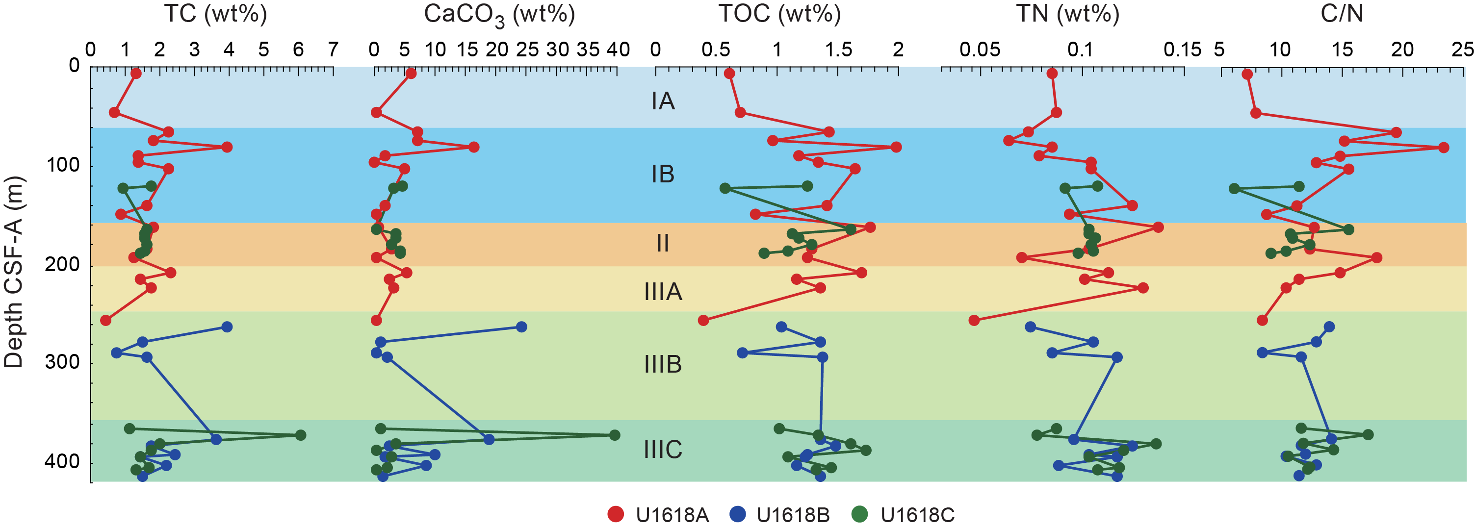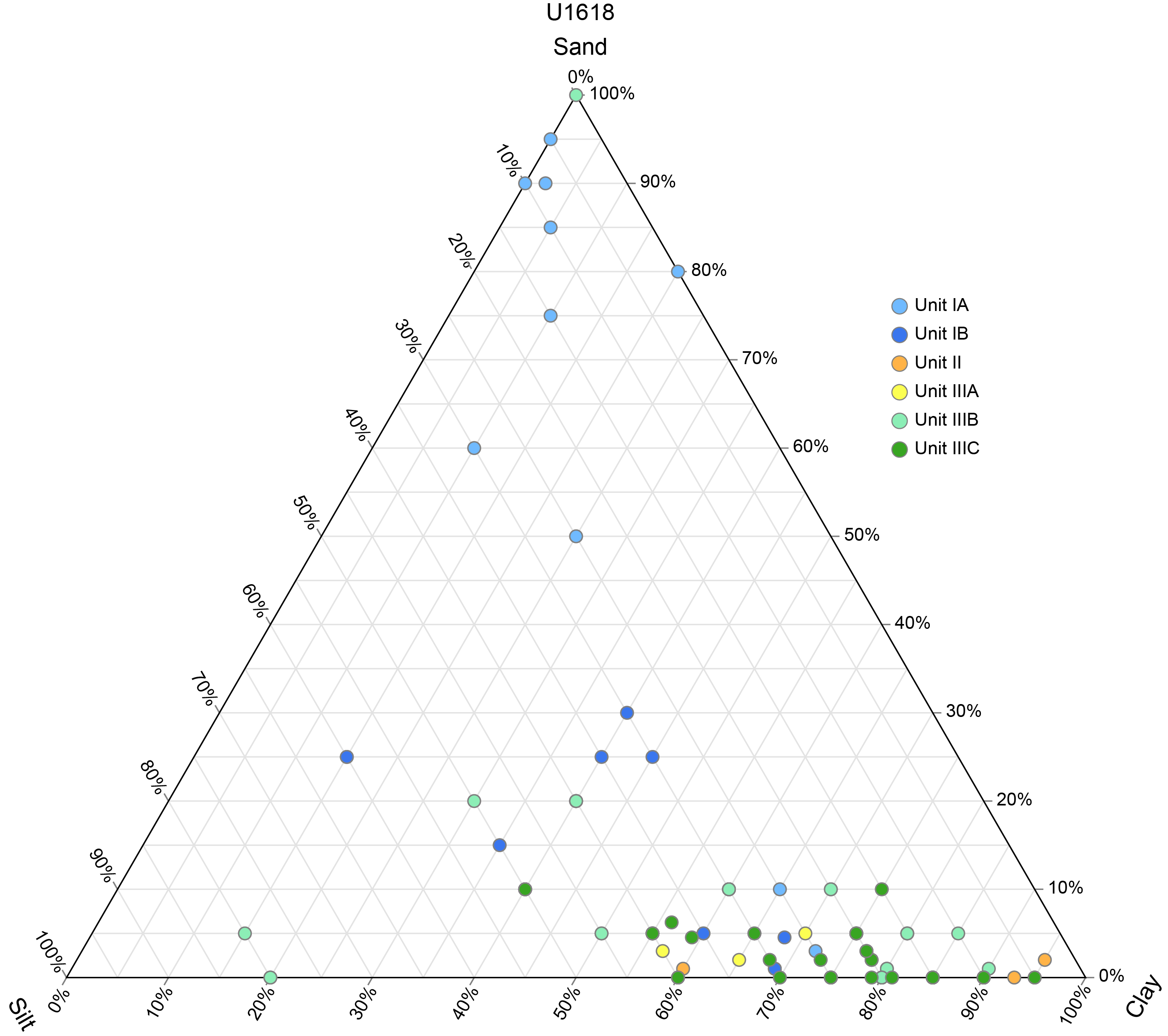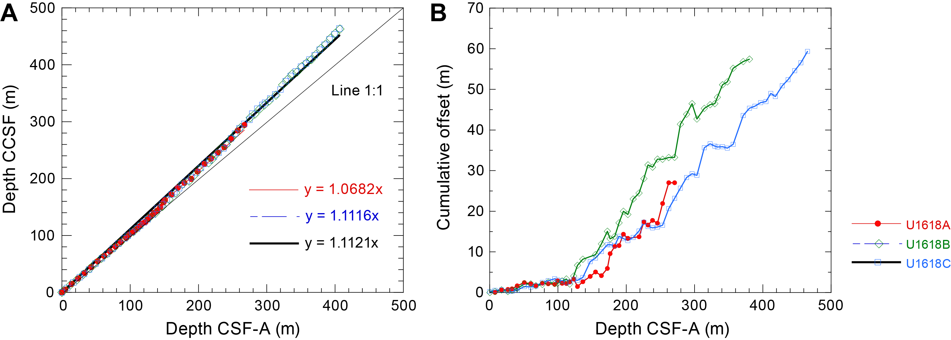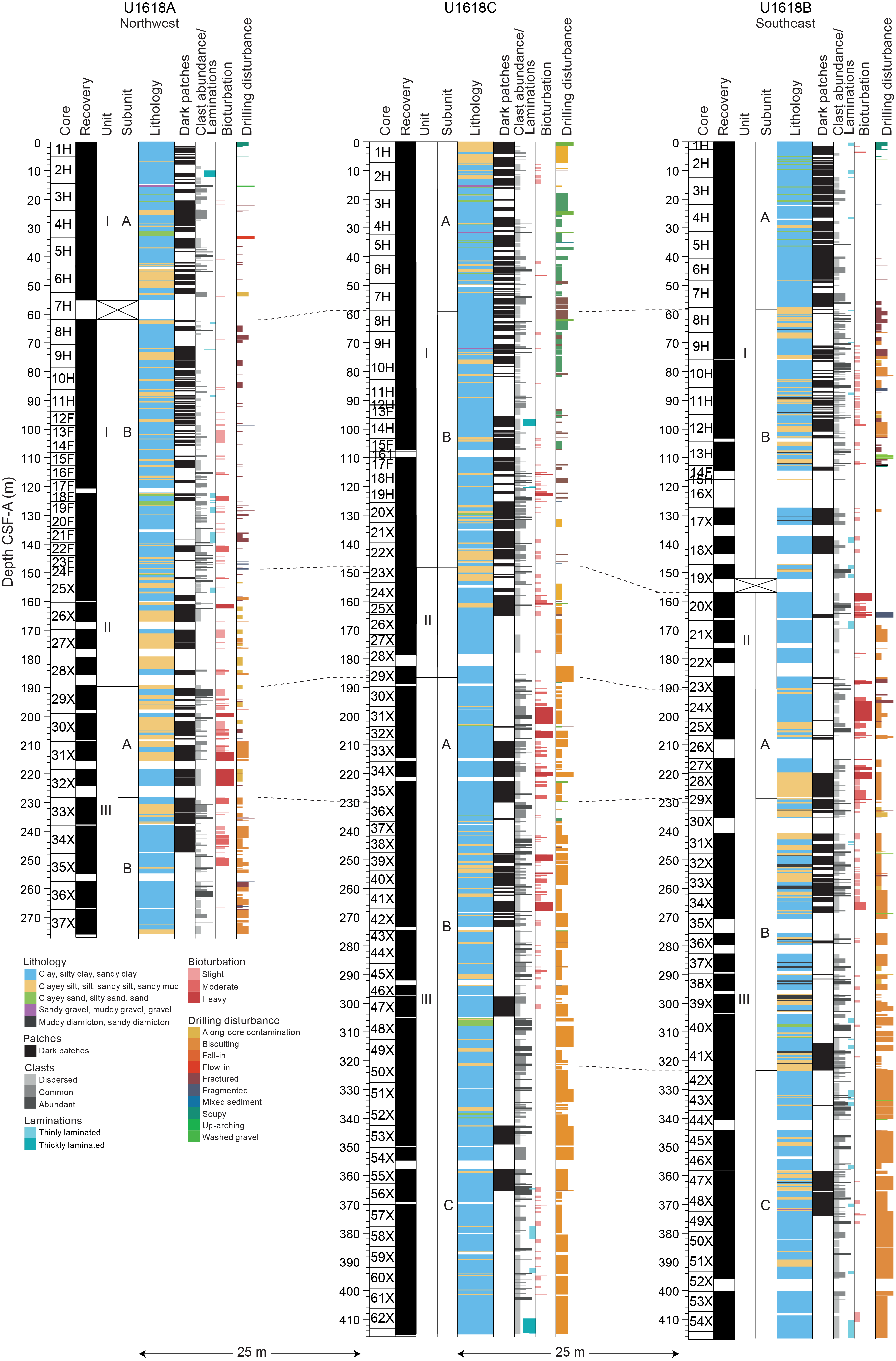 - Depths: Hole U1618A = 0–55.10 mbsf; Hole U1618B = 0–58.51 mbsf; Hole U1618C = 0–59.19 mbsf