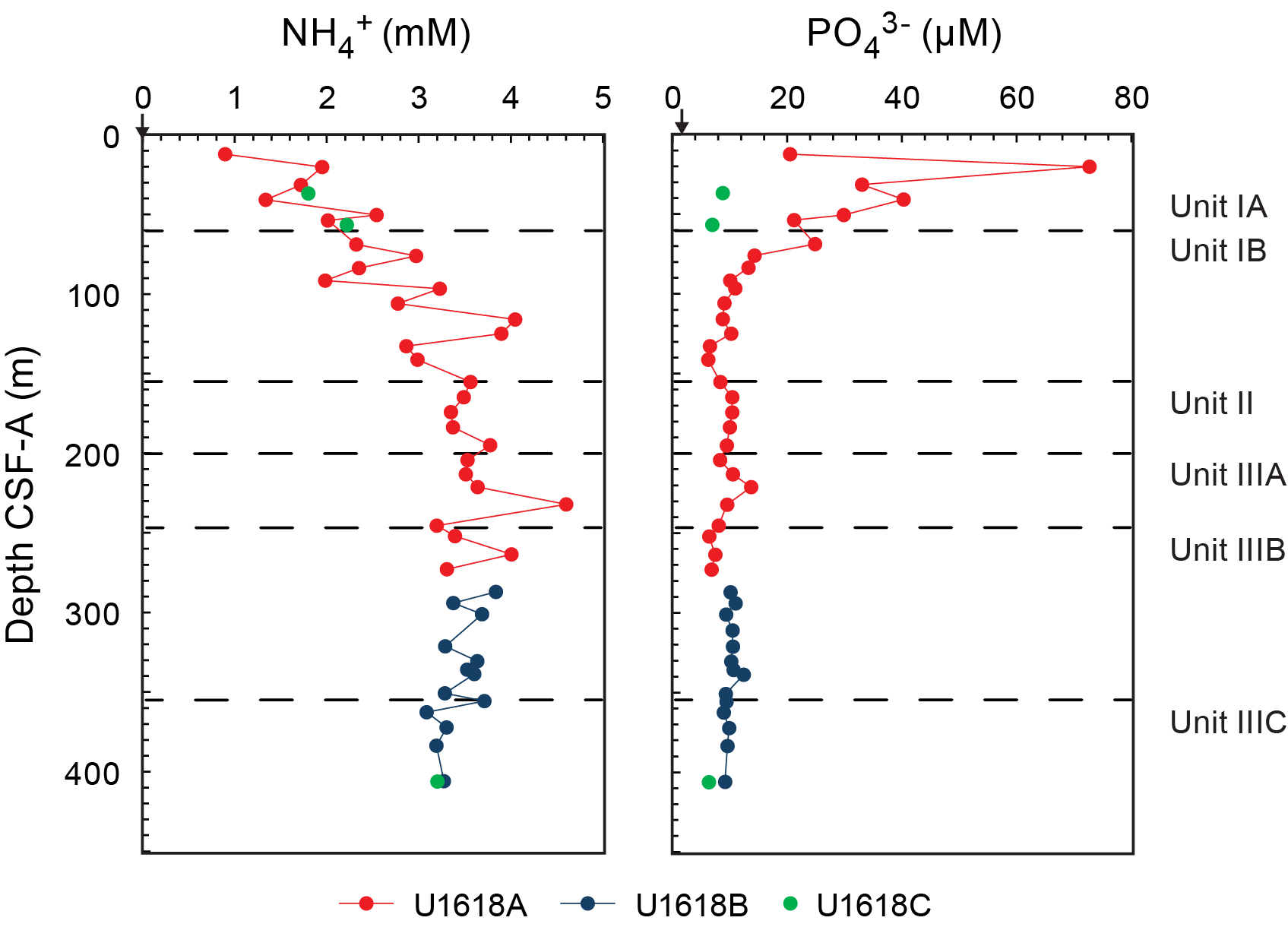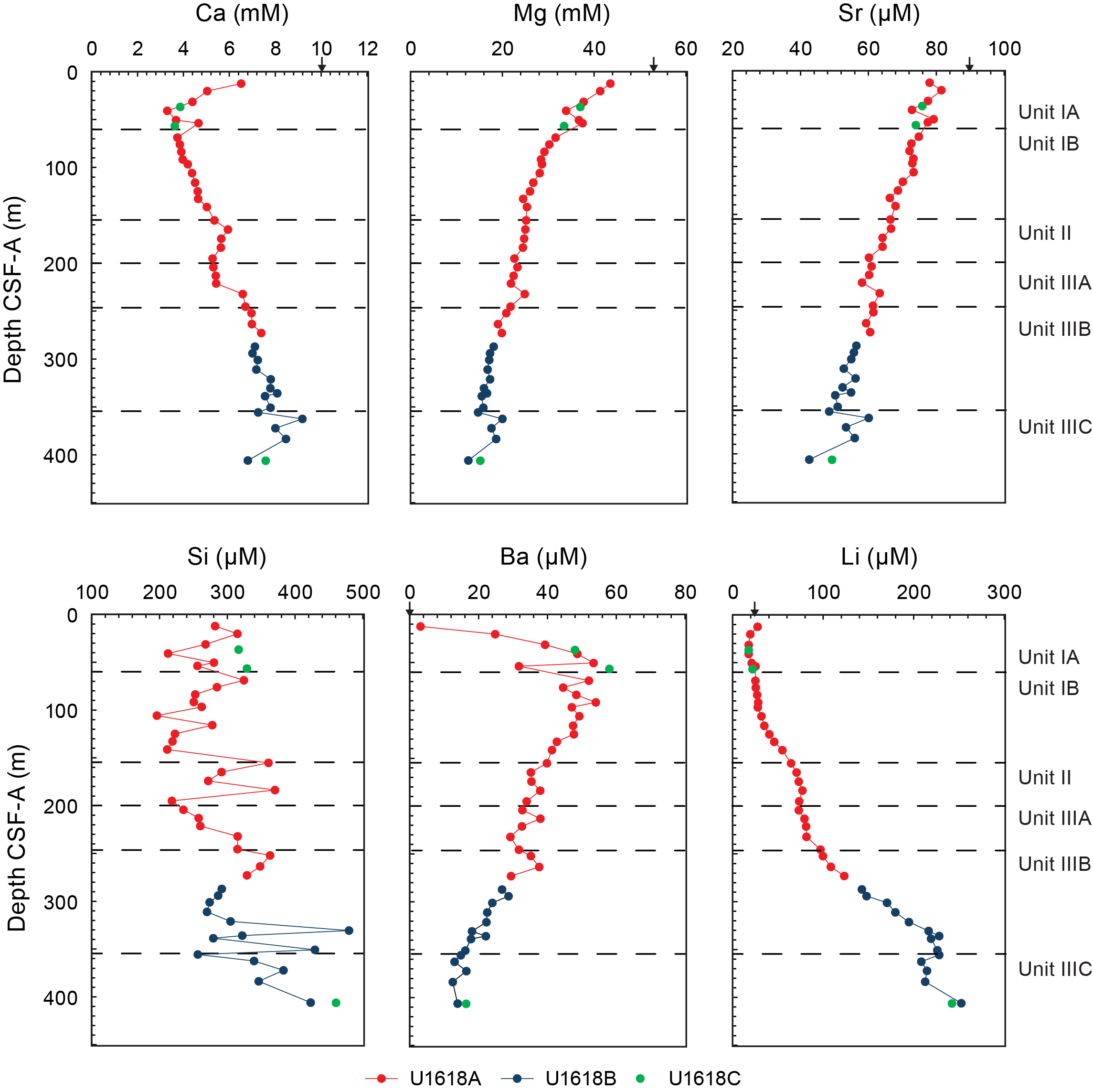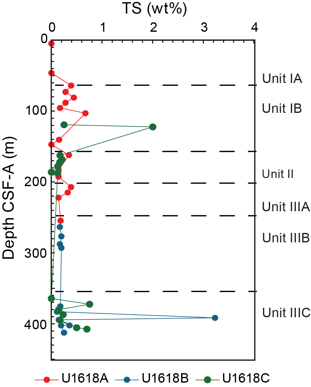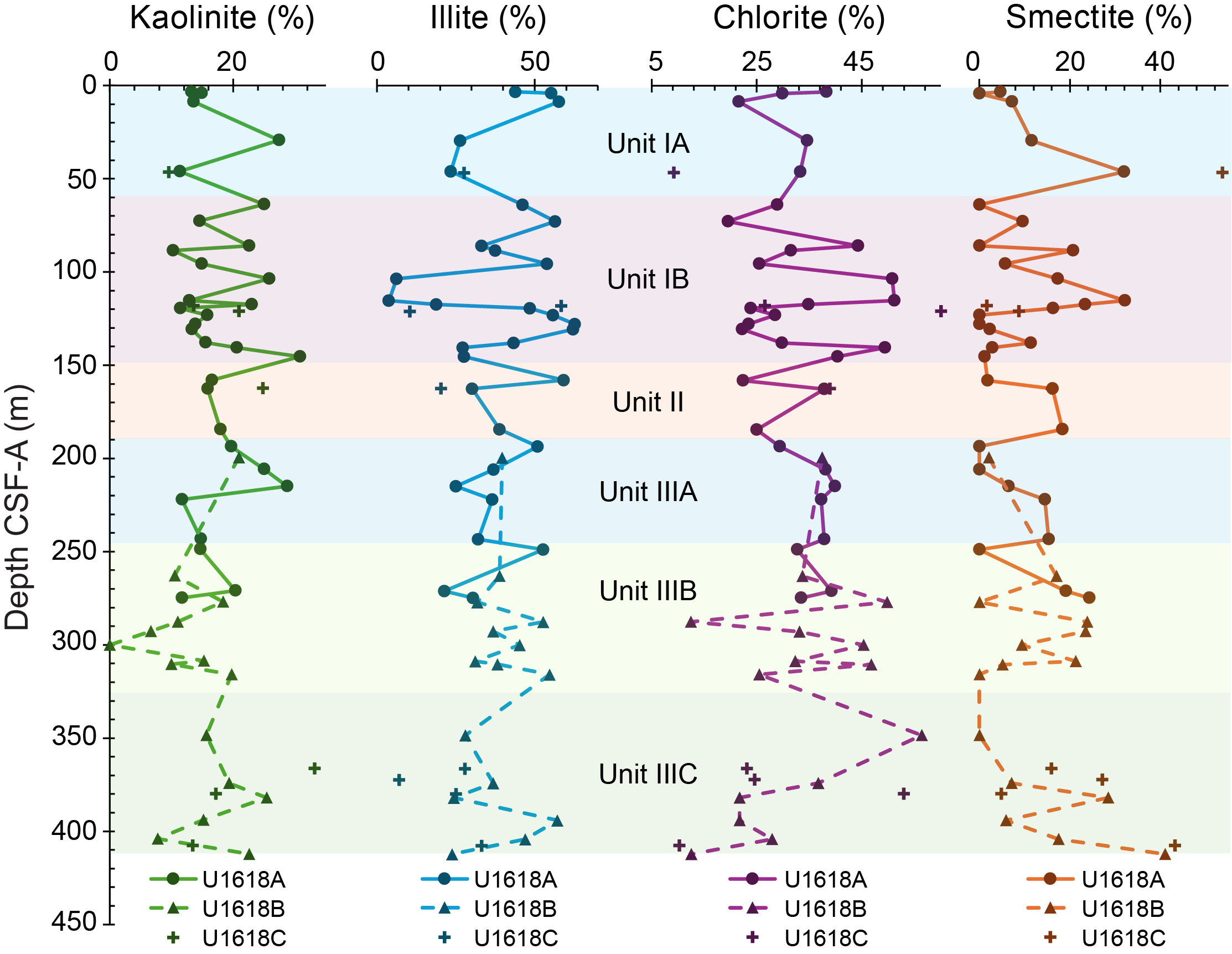 - Depths: Hole U1618A = 0–55.10 mbsf; Hole U1618B = 0–58.51 mbsf; Hole U1618C = 0–59.19 mbsf