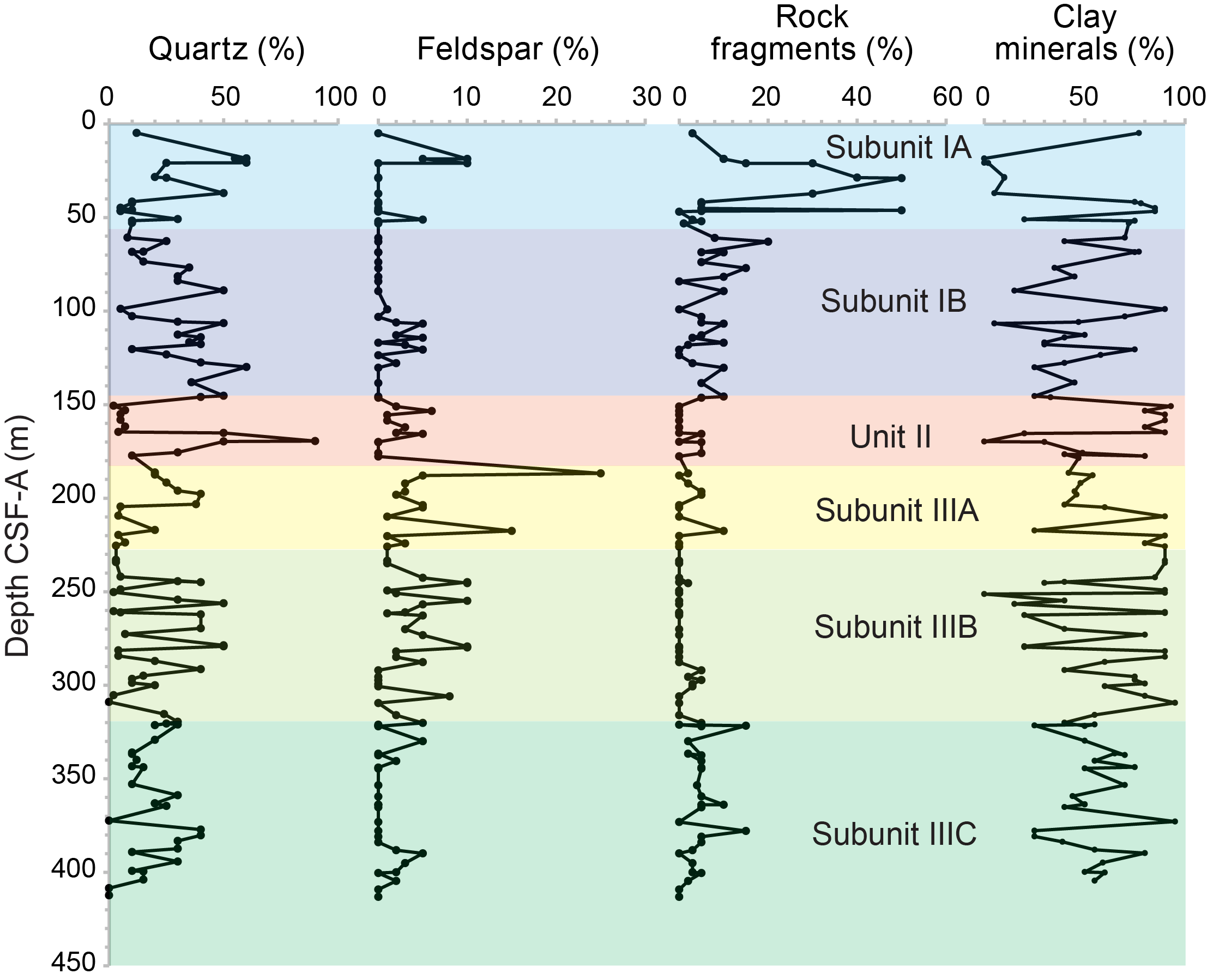 The most common minerals observed in smear slides are quartz and clay, accompanied by a considerable number of rock fragments and a relatively low concentration of heavy minerals, feldspar, and other minerals (Figure F8). Glauconite is also occasionally recognized. The biogenic component of the sediment is typically less than 2%, except in a few intervals that are dominated by calcareous nannofossils.