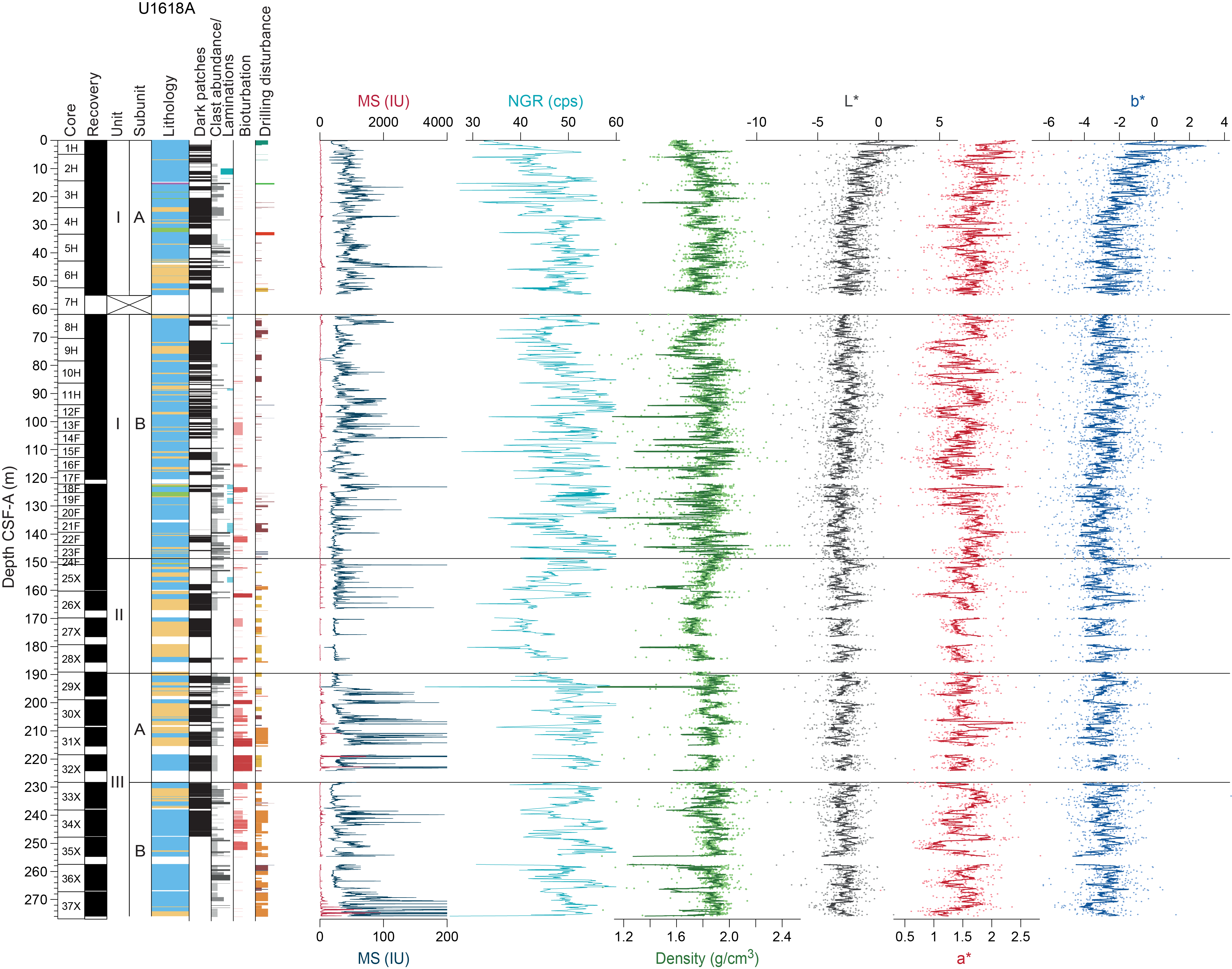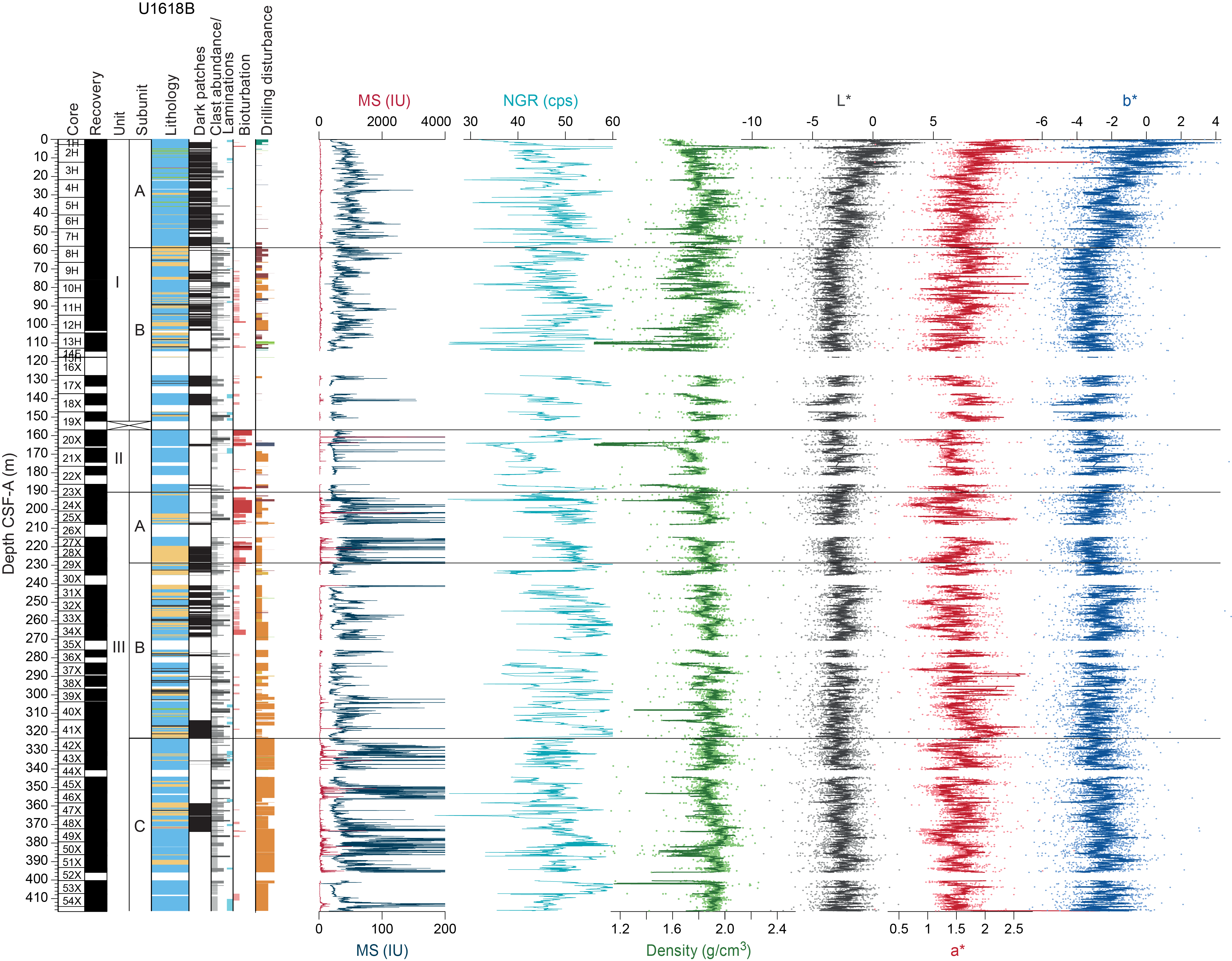 Based on these characteristics, the sediments recovered from Site U1618 are divided into three primary lithostratigraphic units and additional subunits (Table T2). The relatively continuous Hole U1618C is used as the primary record to define the lithostratigraphic unit and subunit boundaries. The stratigraphic boundaries in Hole U1618C are subsequently transferred to Holes U1618A and U1618B based on stratigraphic correlation on the mbsf (equivalent to CSF-A) scale (see Stratigraphic correlation) (Figure F7).