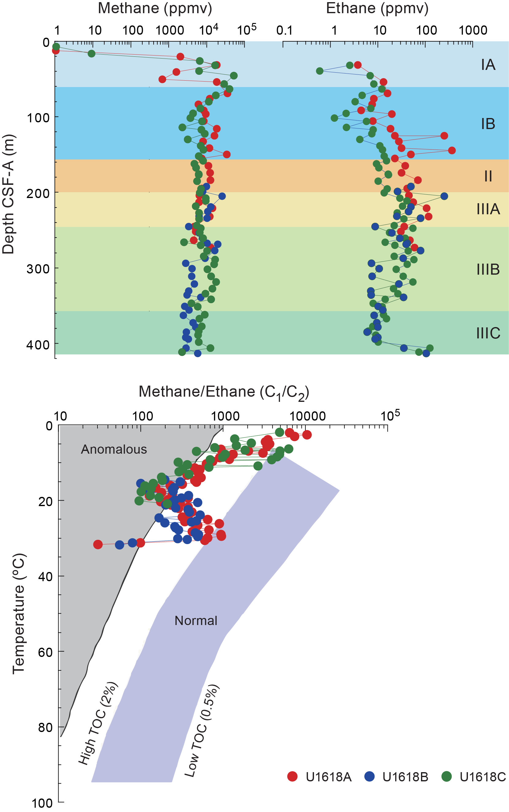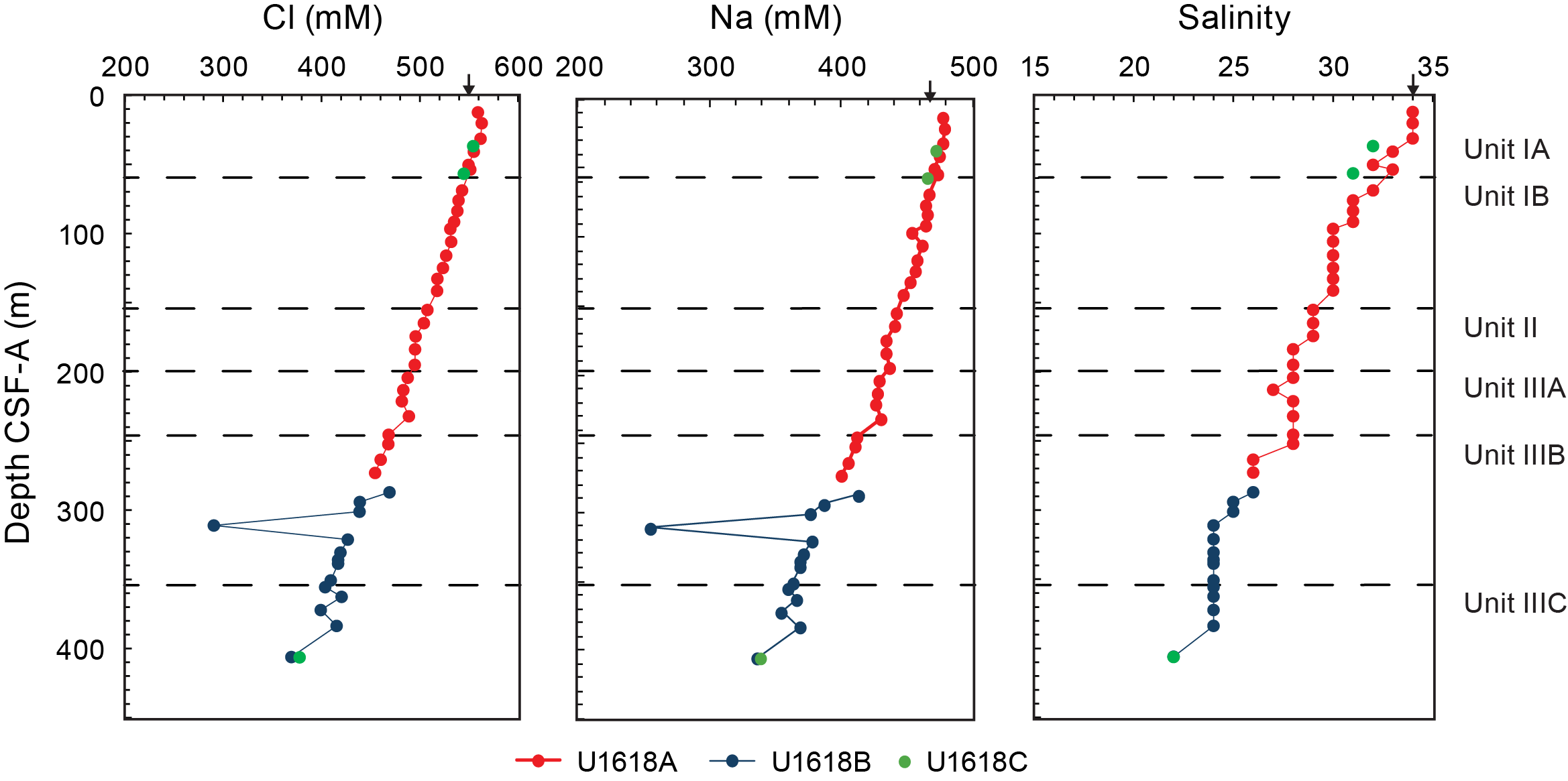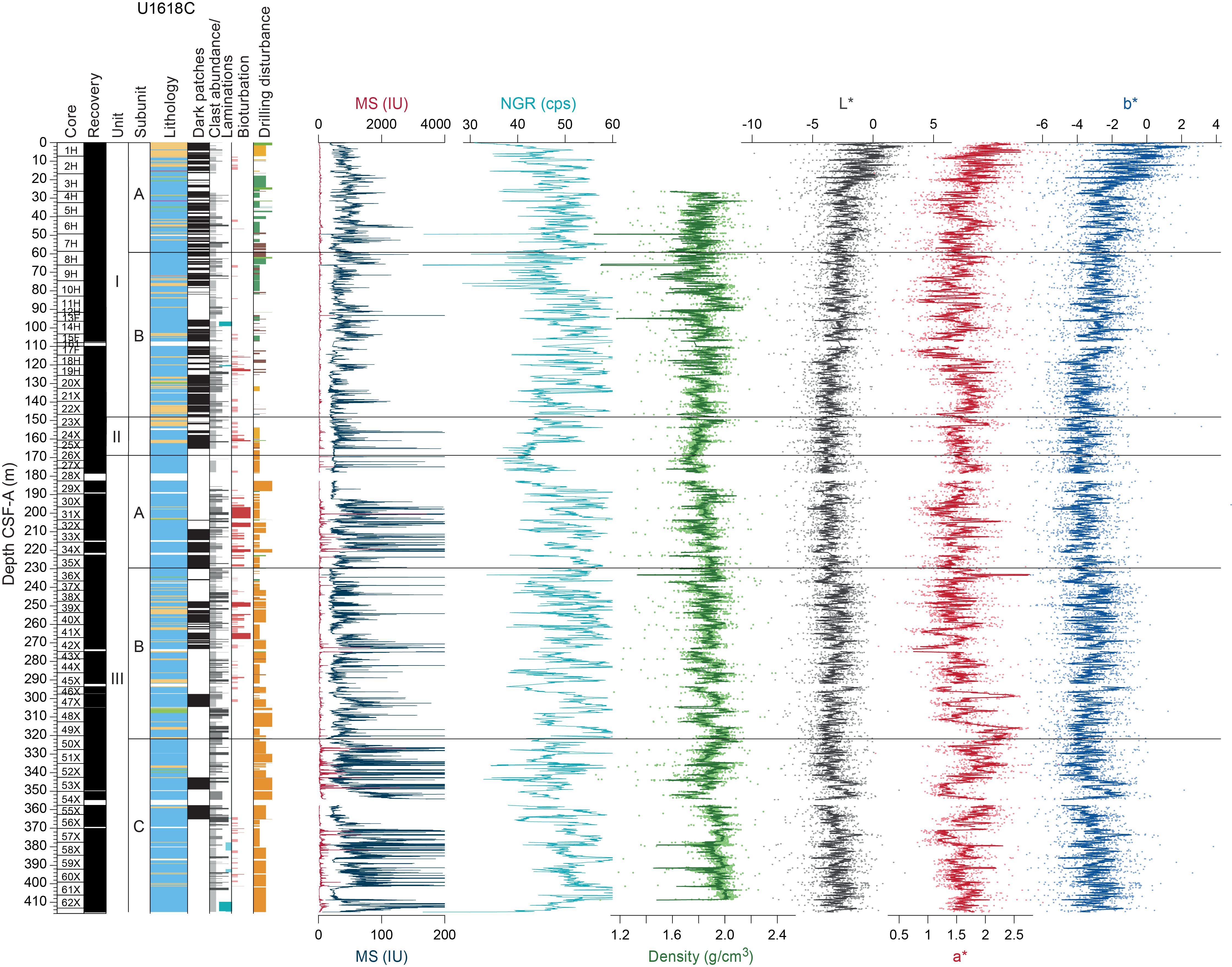 - Depths: Hole U1618A = 0–148.87 mbsf; Hole U1618B = 0–152.20 mbsf; Hole U1618C = 0–148.05 mbsf