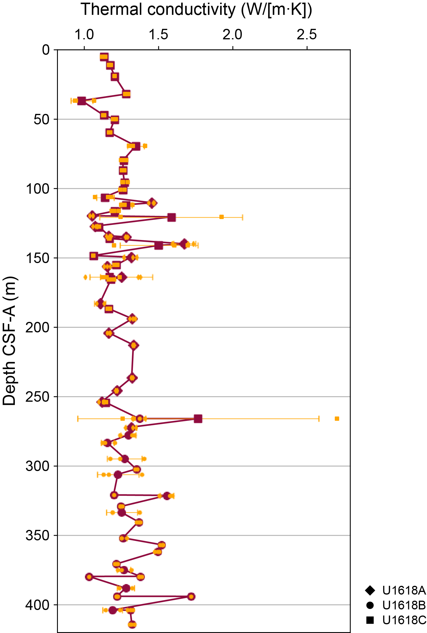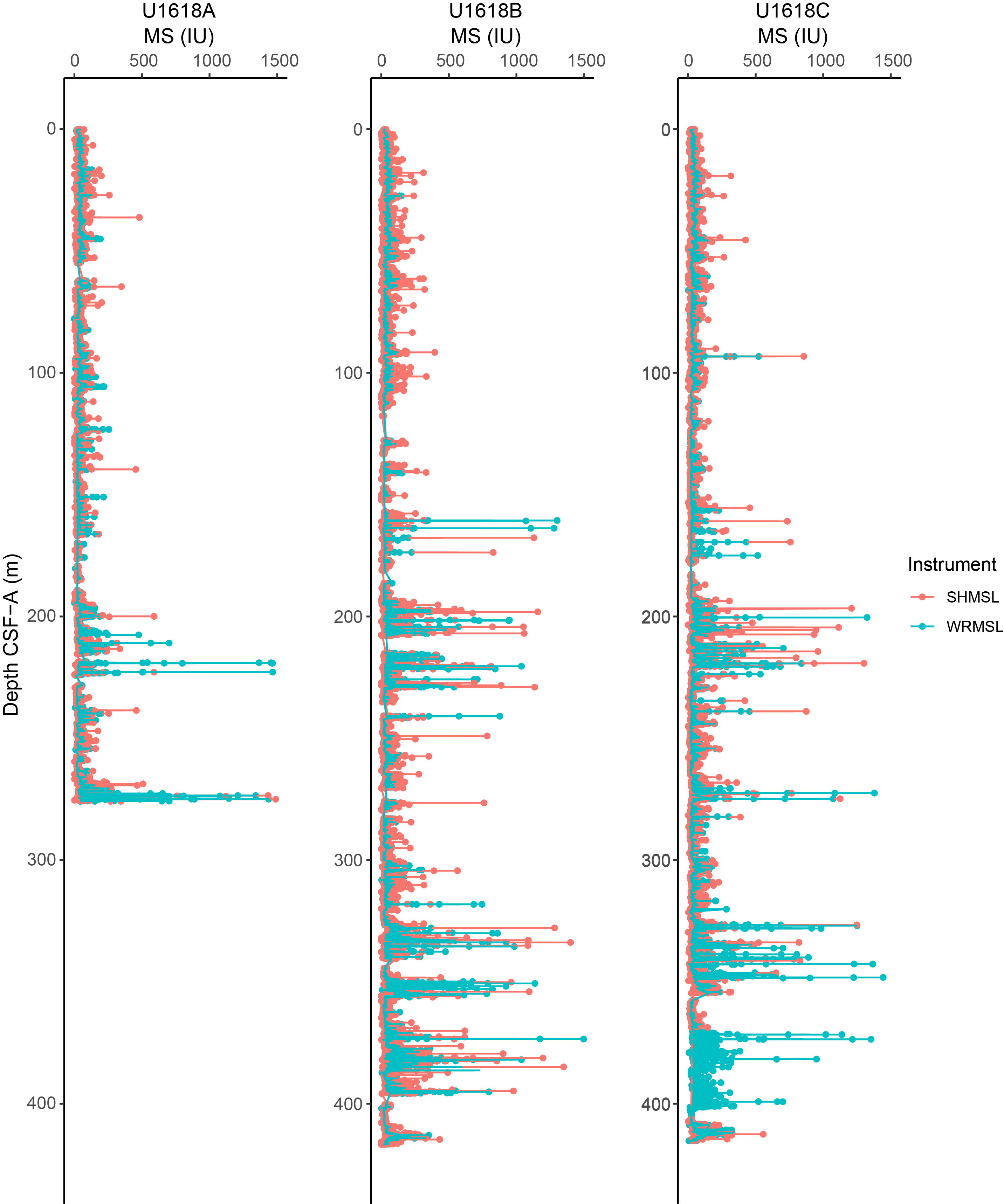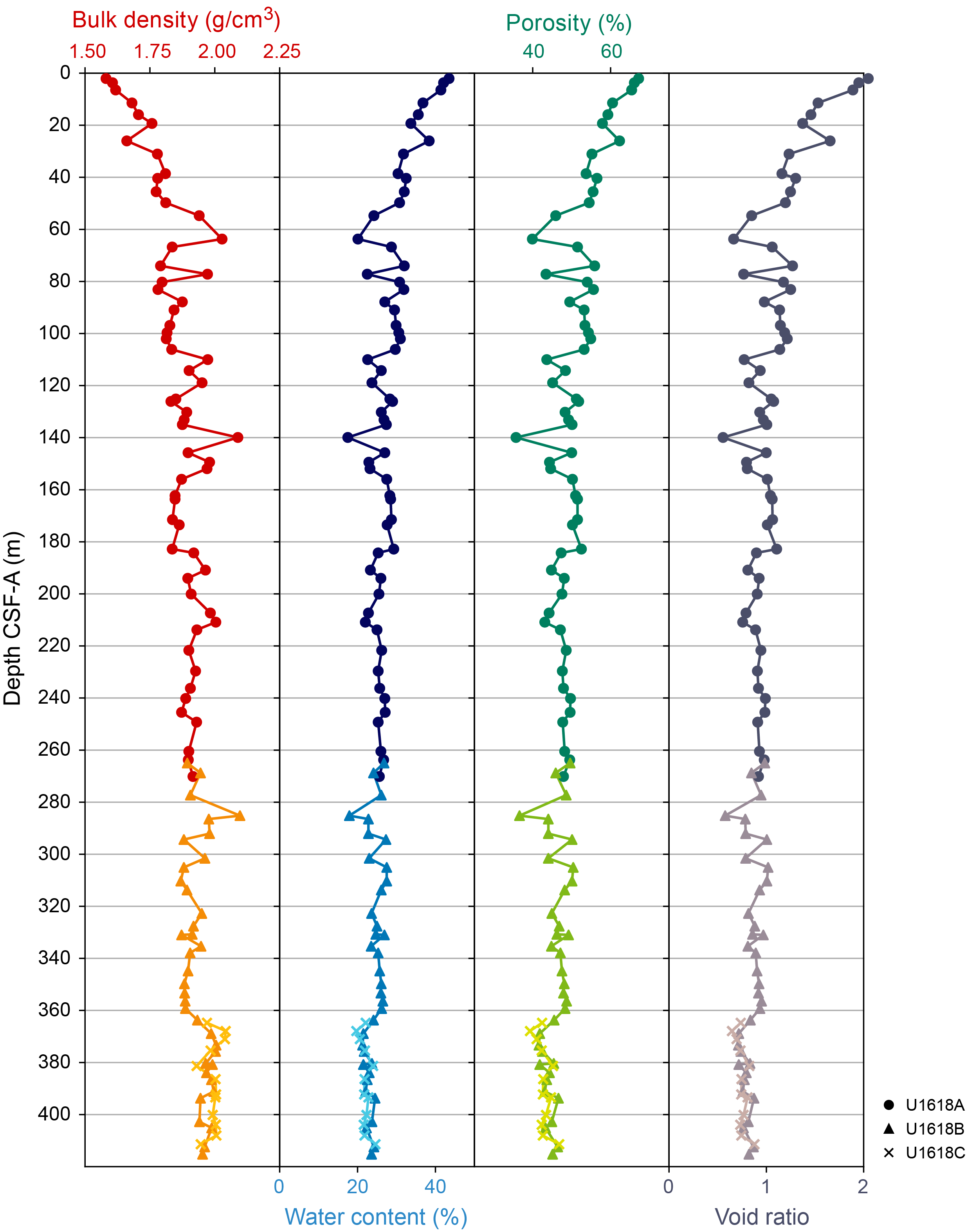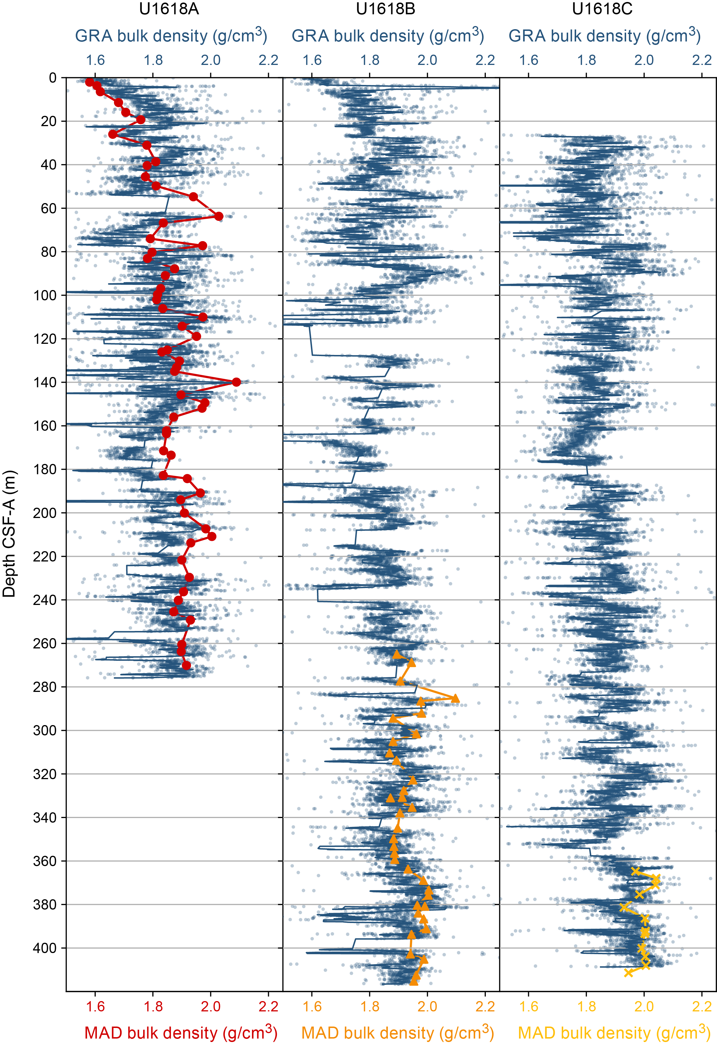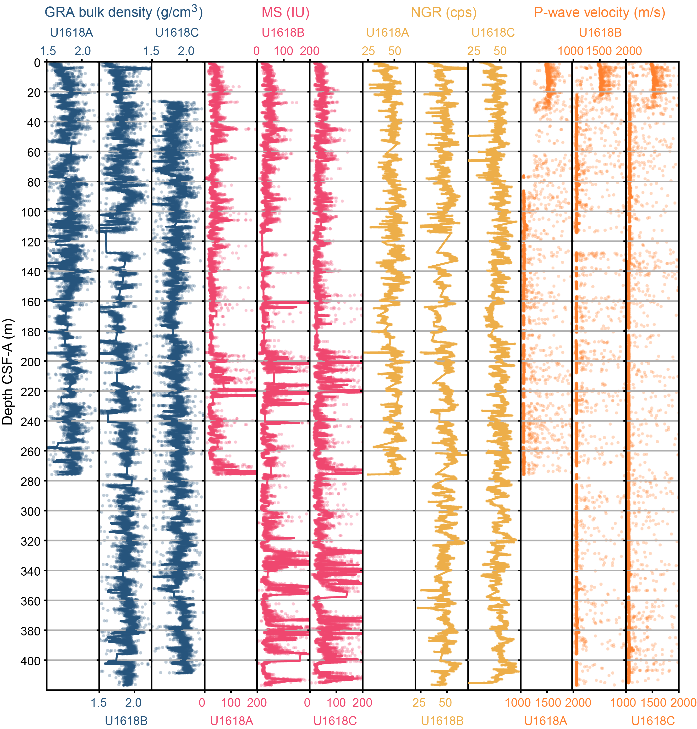 - Depths: Hole U1618A = 189.56–276.9 mbsf; Hole U1618B = 190.60–414.3 mbsf; Hole U1618C = 186.65–413.1 mbsf