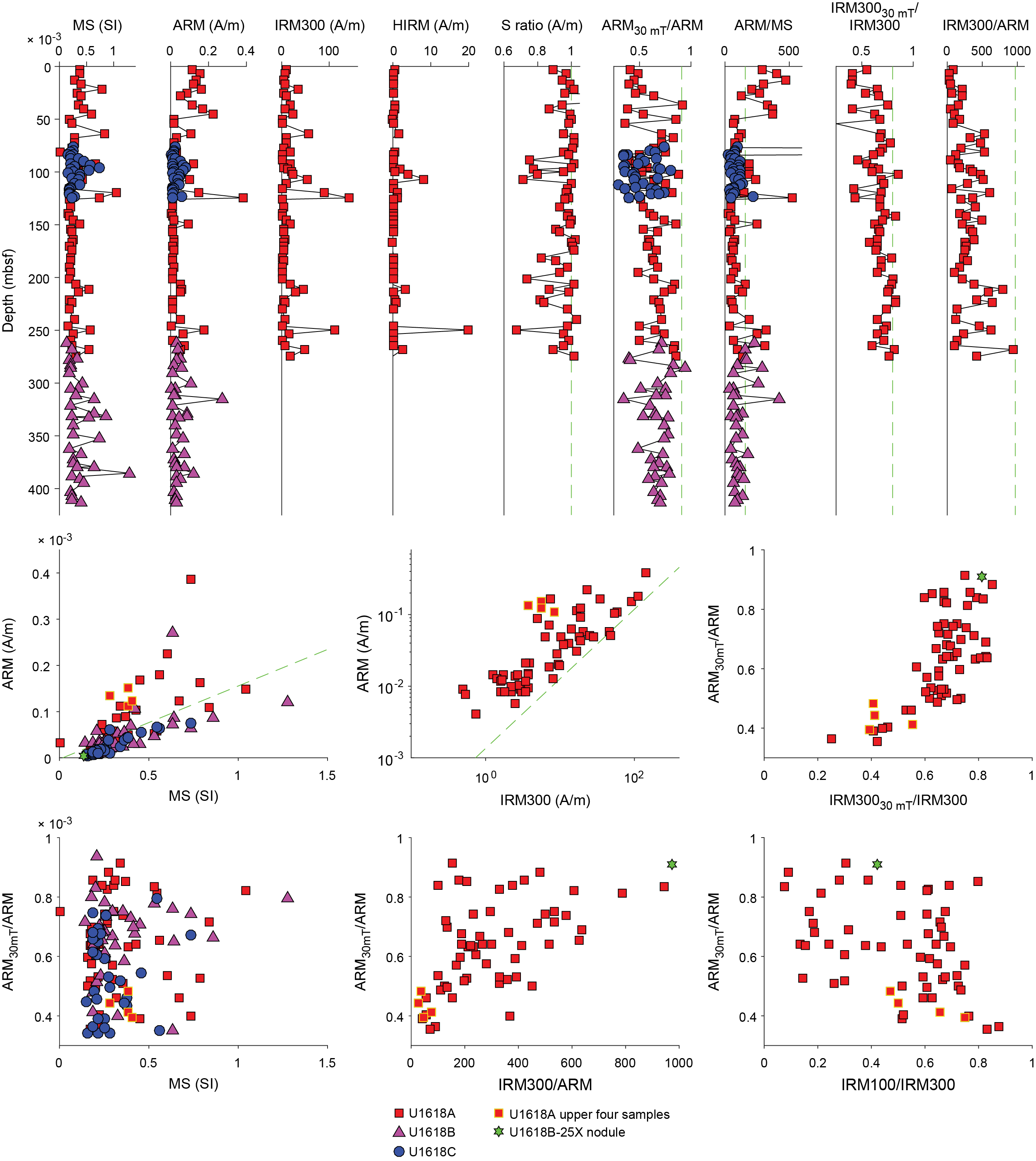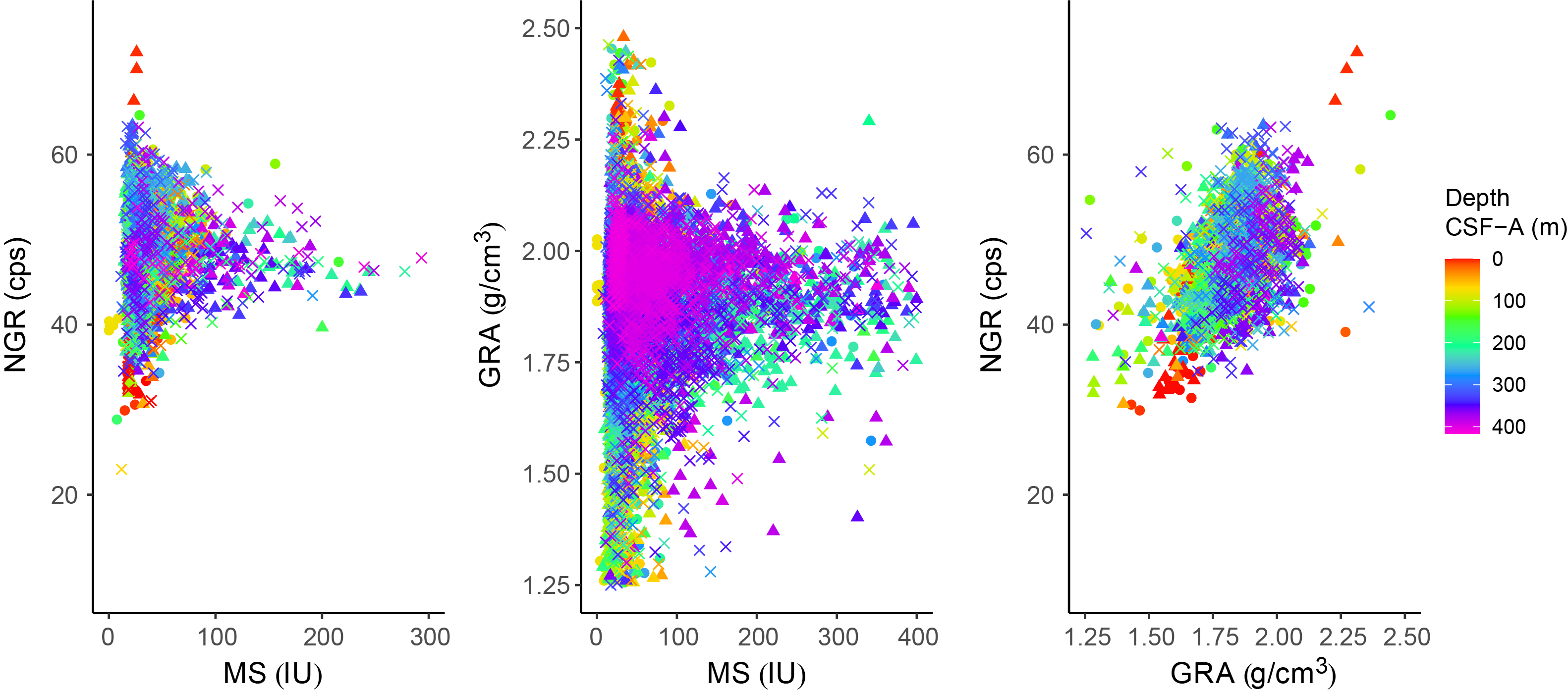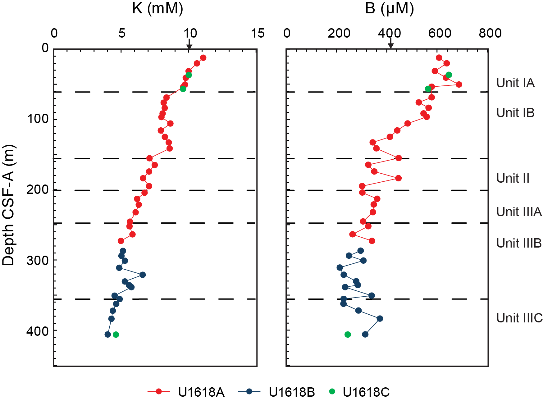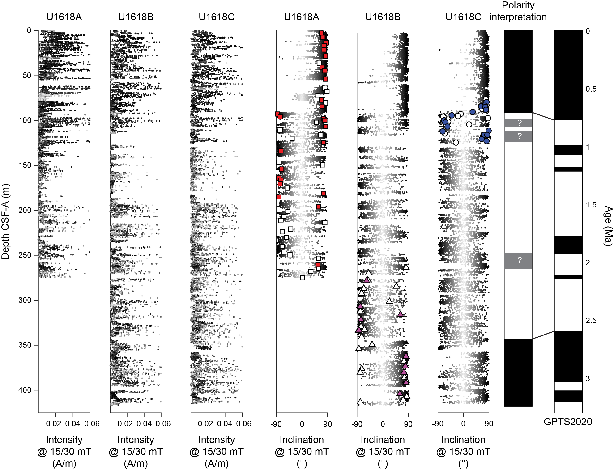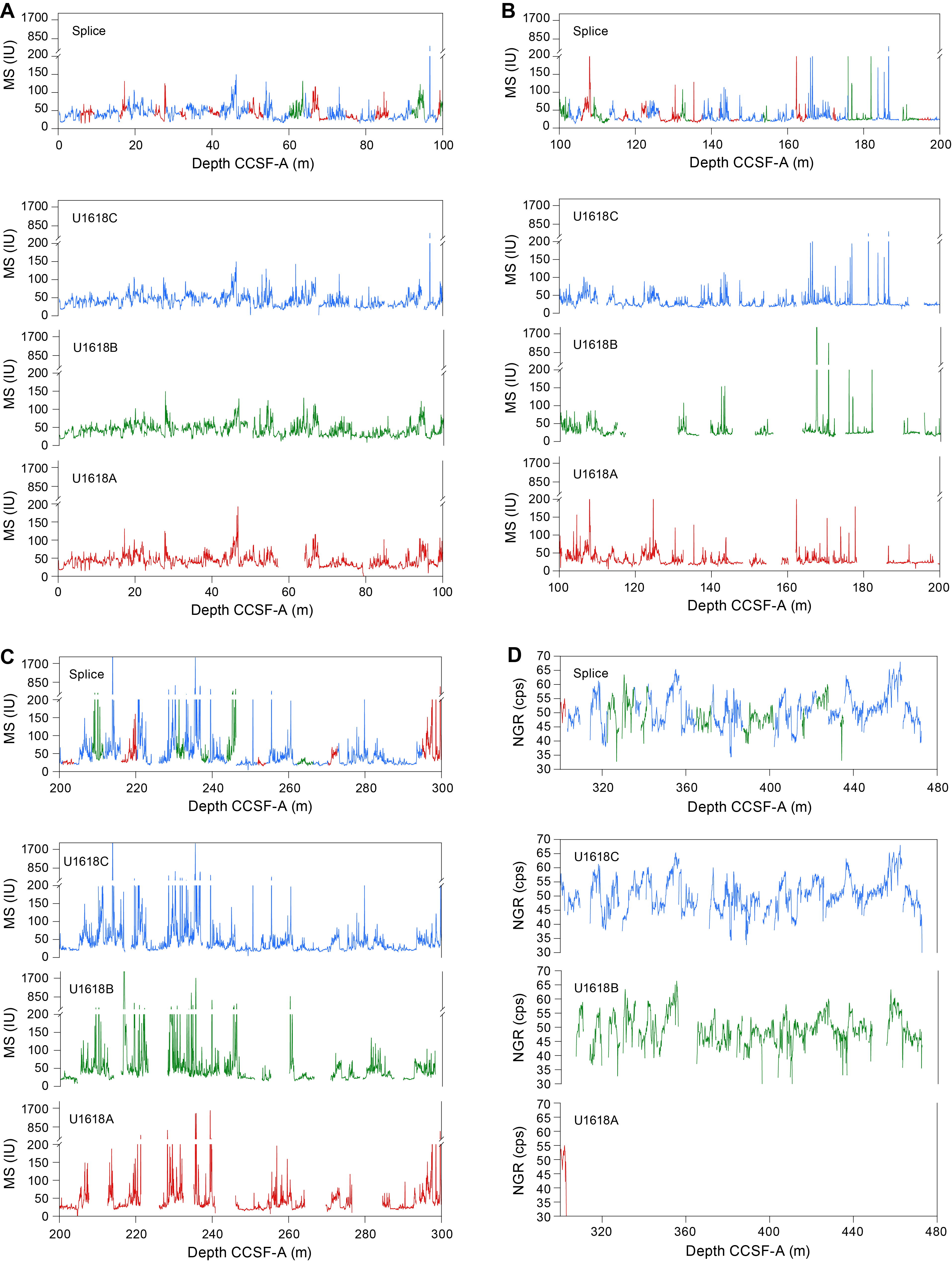 - Depths: Hole U1618A = 189.56–276.9 mbsf; Hole U1618B = 190.60–414.3 mbsf; Hole U1618C = 186.65–413.1 mbsf