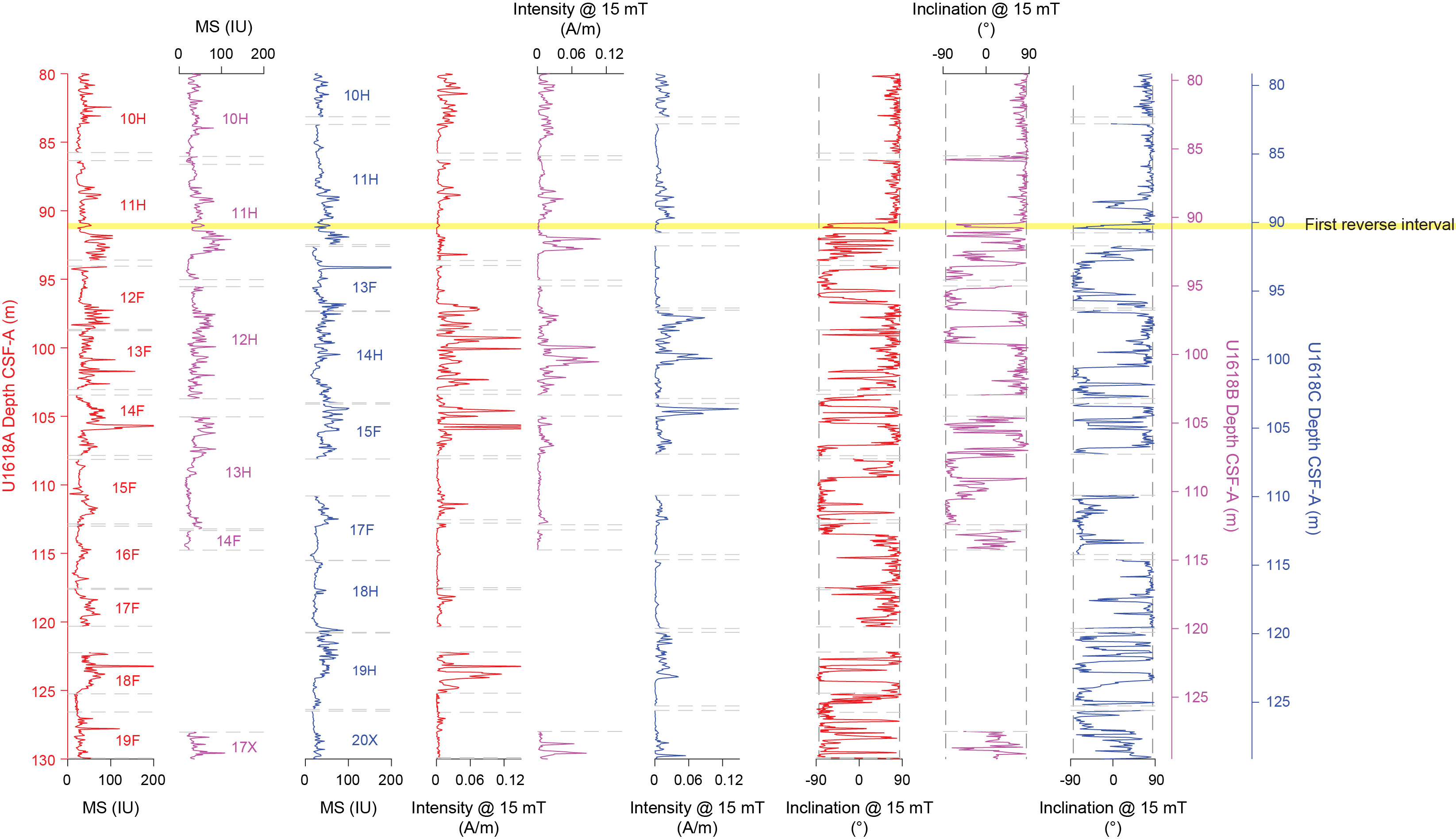 - Depths: Hole U1618A = 189.56–224.21 mbsf; Hole U1618B = 190.60–228.81 mbsf; Hole U1618C = 186.65–230.07 mbsf