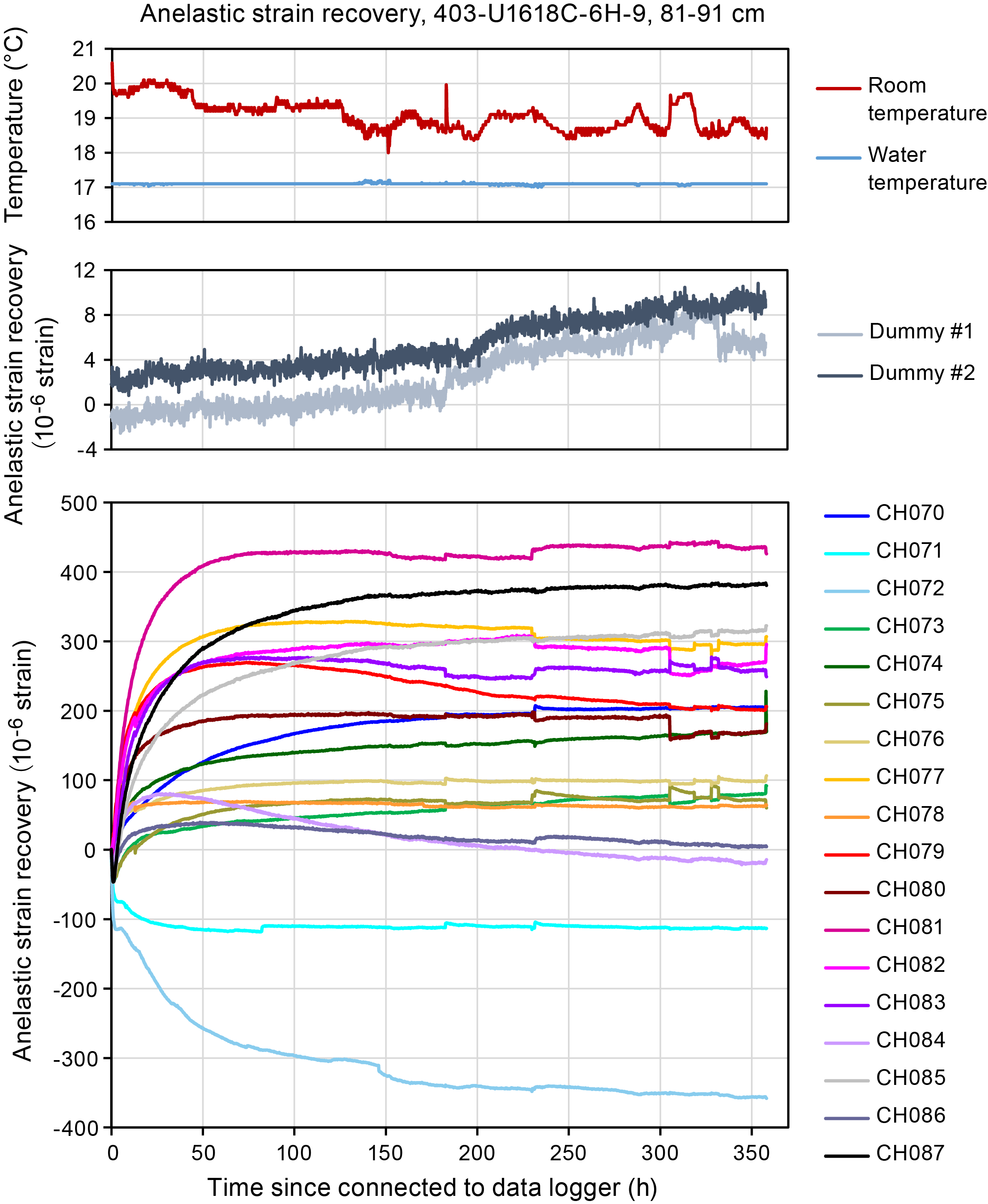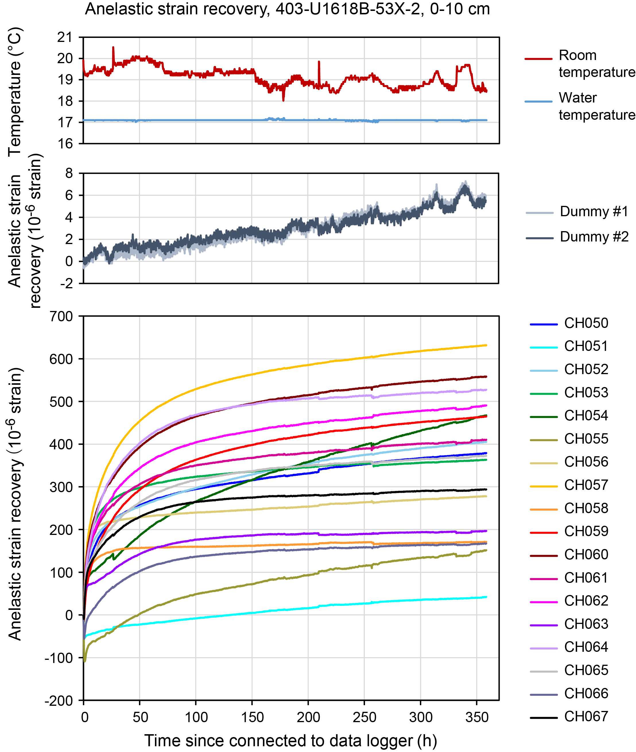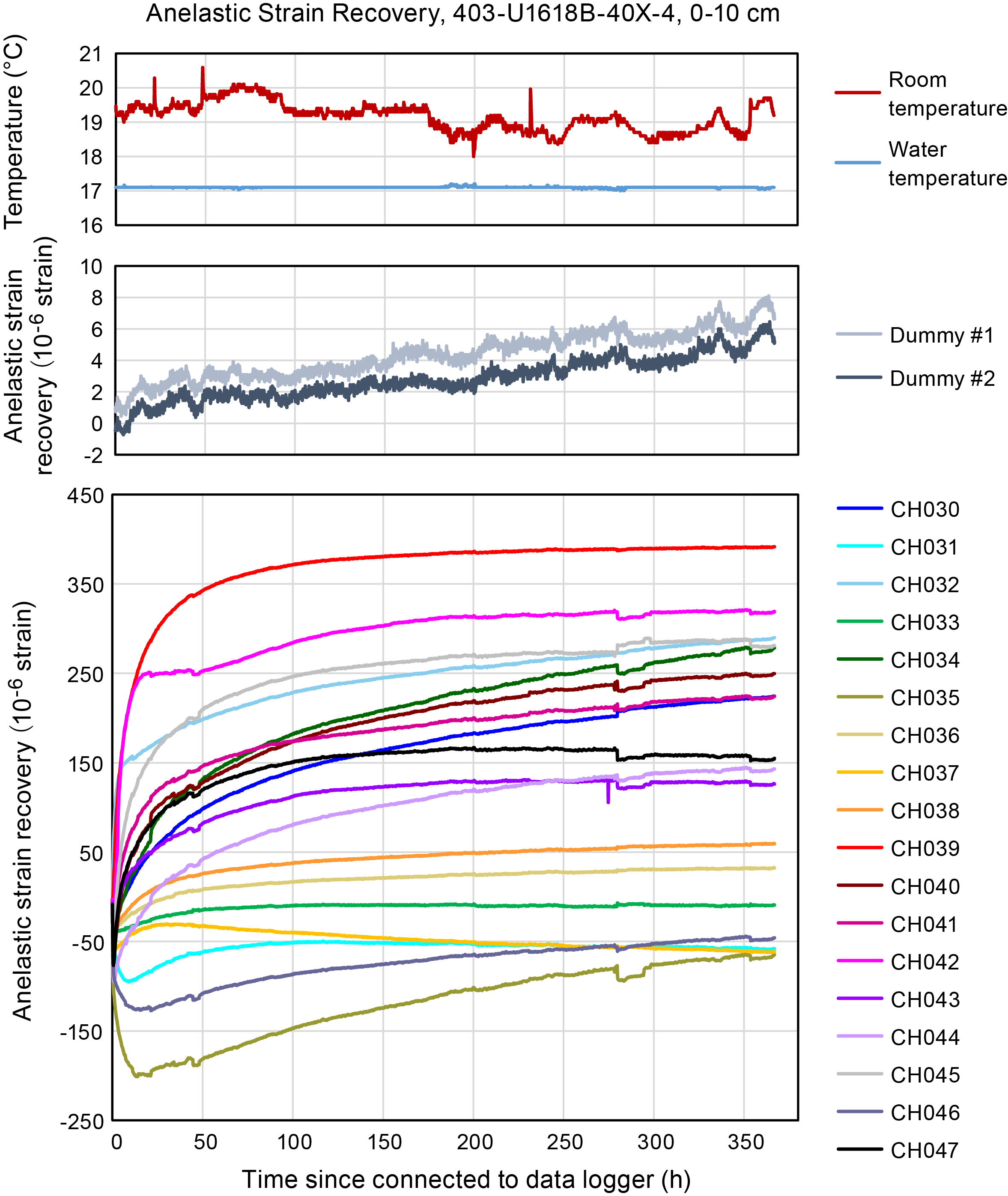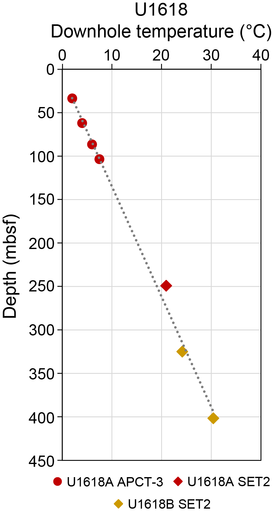 All cores collected with the APC and HLAPC systems were taken using nonmagnetic core barrels. Two temperature measurements were attempted using the SET2 temperature probe. The first, after Core 403-U1618B-40X, returned with no data. The second attempt, after Core 41X, returned a good temperature reading from 325.0 mbsf.