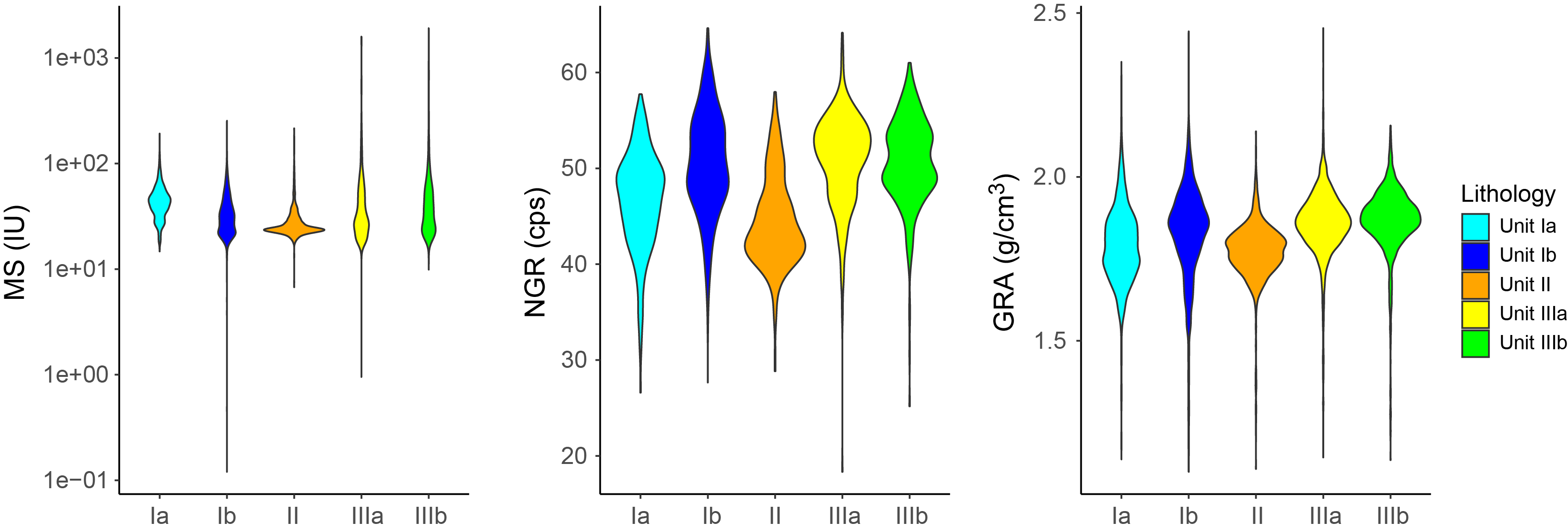 Unit II has increased variability in magnetic susceptibility (MS), which most likely corresponds to authigenic iron sulfide minerals. This unit has generally lower NGR and lower gamma ray attenuation (GRA) density (especially Hole U1618A; Figure F9) than the other units. The upper boundary of Unit II is likely to be consistent with Seismic Reflector R5.