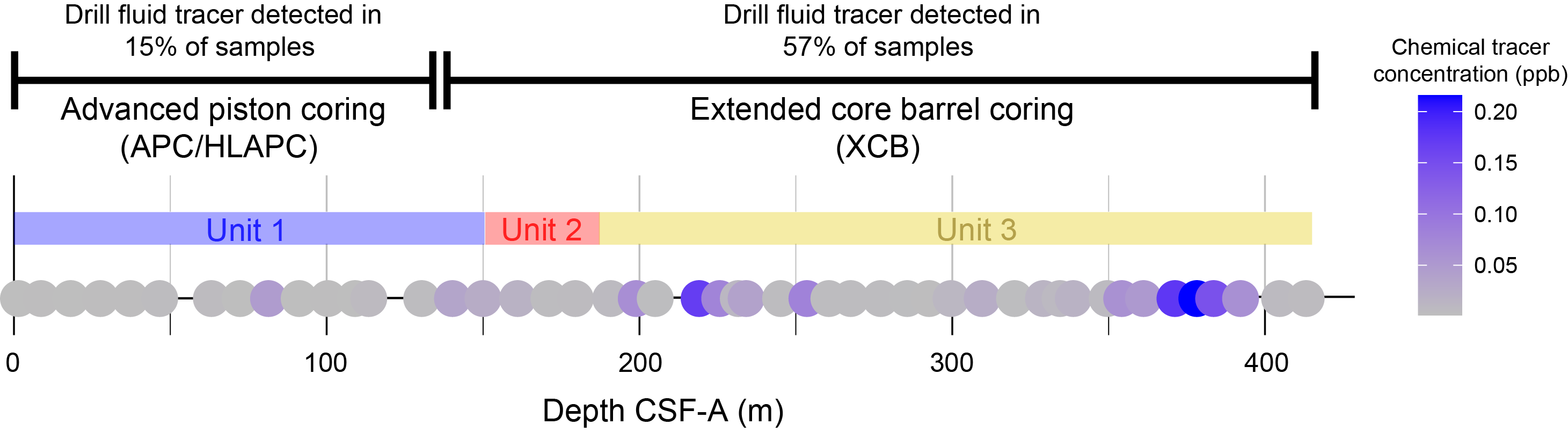 A total of 61 cores were taken from Hole U1618C (Table T1) over a 411.1 m interval with 450.59 m recovered (109.61%). The APC system was used for 14 cores over a 113.0 m interval with 112.48 m recovered, the HLAPC system was deployed for 3 cores over a 14.1 m interval with 13.71 m recovered (97.3%), and the XCB coring system was deployed for 43 cores over a 287.5 m interval with 337.18 m recovered (114.82%).