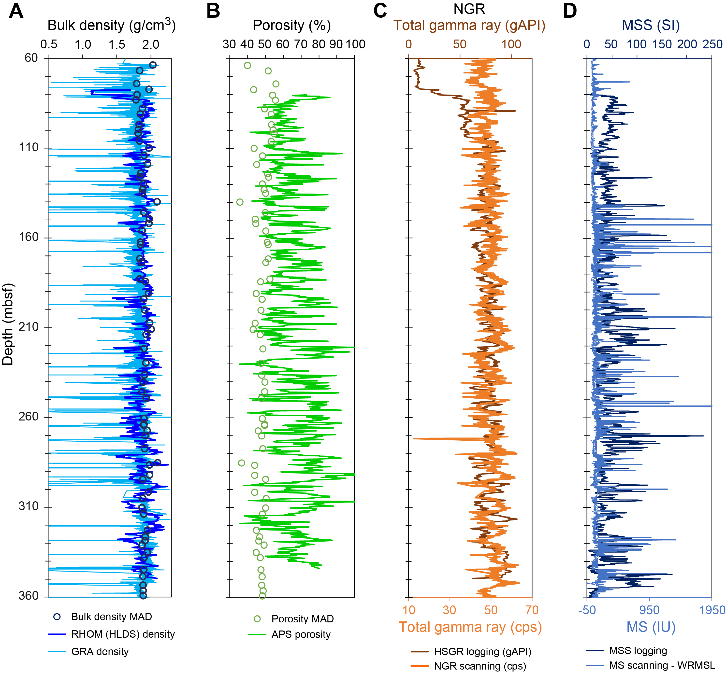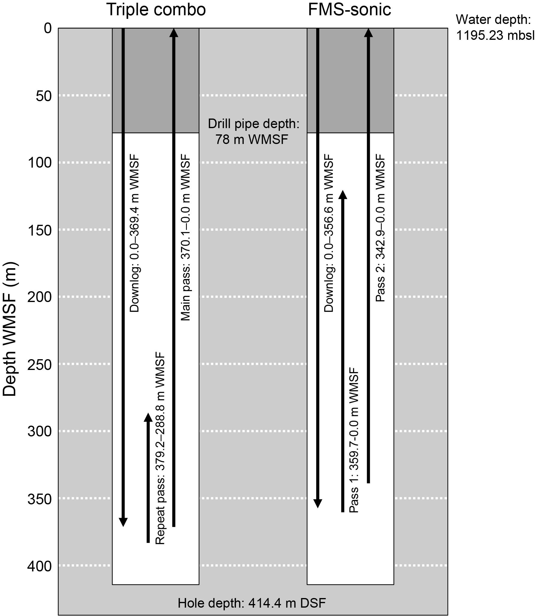 Downhole natural gamma ray was reported as total spectral gamma ray (HSGR) data and potassium (K), uranium (U), and thorium (Th) contents. Each K, U, and Th component was derived from the spectrum of total natural gamma ray counts and 256-window spectroscopy. For the total natural gamma ray measurements not influenced by the drill pipe (>104 m WMSF), the average value is 78 American Petroleum Institute gamma radiation units (gAPI). Cyclic amplitude fluctuations around this value were observed. The amplitude of these cyclic variations is higher in the lower part (>280 m WMSF) of the measurements. An interval of lower HSGR values occurs around 160–180 m WMSF. Potassium and uranium showed similar trend and fluctuation to HSGR, whereas thorium indicates relatively lower amplitudes. The HSGR data showed great similarity to natural gamma ray measured on cores with the natural gamma ray logger (Figure F51C), indicating that core and log depth scales can be readily correlated. The differences of the depth scales can be assumed to be less than 1 m. Absolute values of the HSGR in the upper 100 m are much lower because measurements were made through the drill pipe.