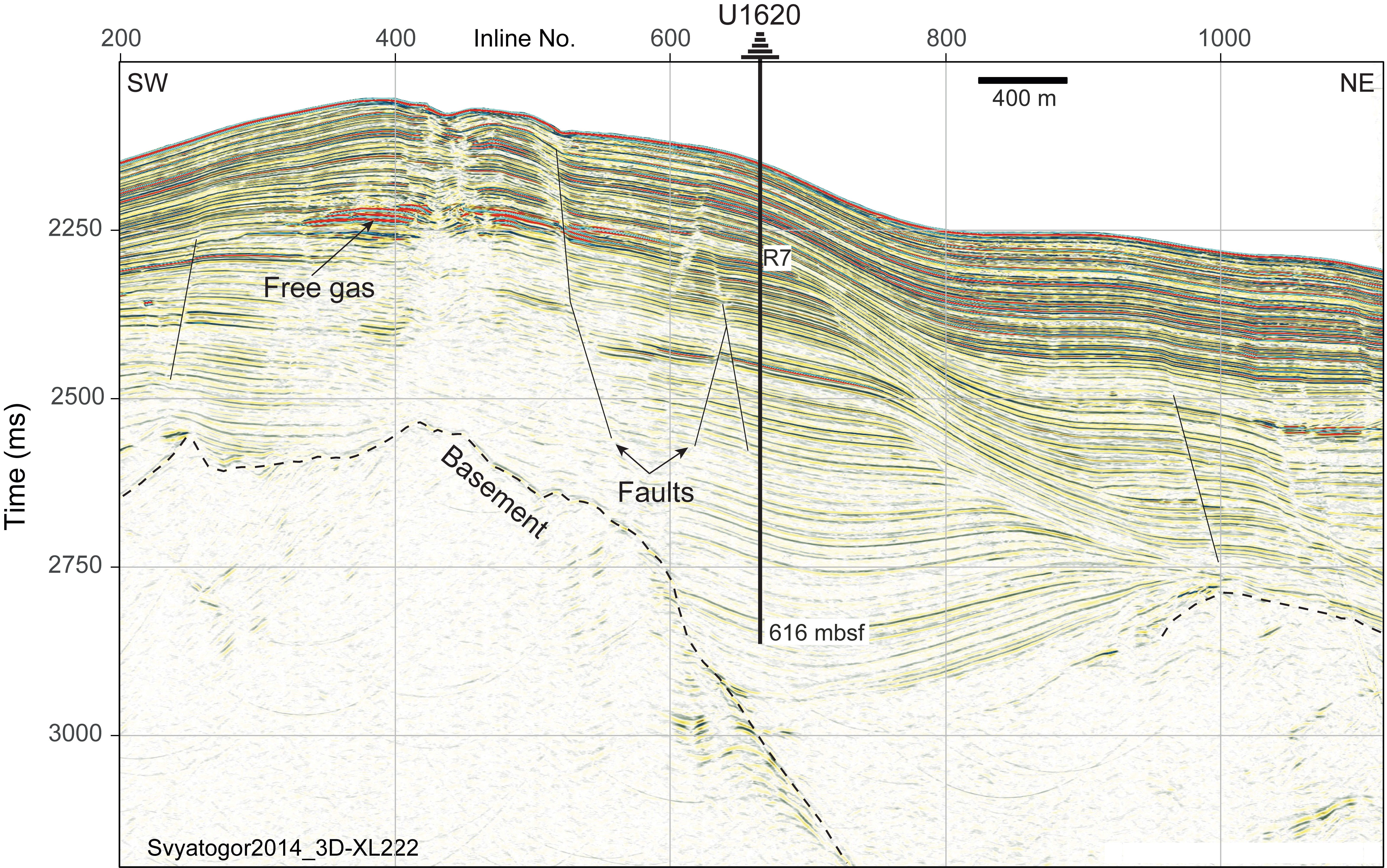Site U1620 comprises four holes drilled between 1589 and 1609 m water depth. Hole U1620A is positioned at the cross point of two seismic lines from a 3D survey (Waghorn et al., 2018): Svyatogor2014_3D-XL222 (crossline) and SVR2014_3D-IL665 (inline) (Figures F1B, F2). Holes U1620B–U1620D are located within 200 m northwest of Hole U1620A along Seismic Line Svyatogor2014_3D-XL222. The maximum subseafloor penetration was at Hole U1620D (616 mbsf).