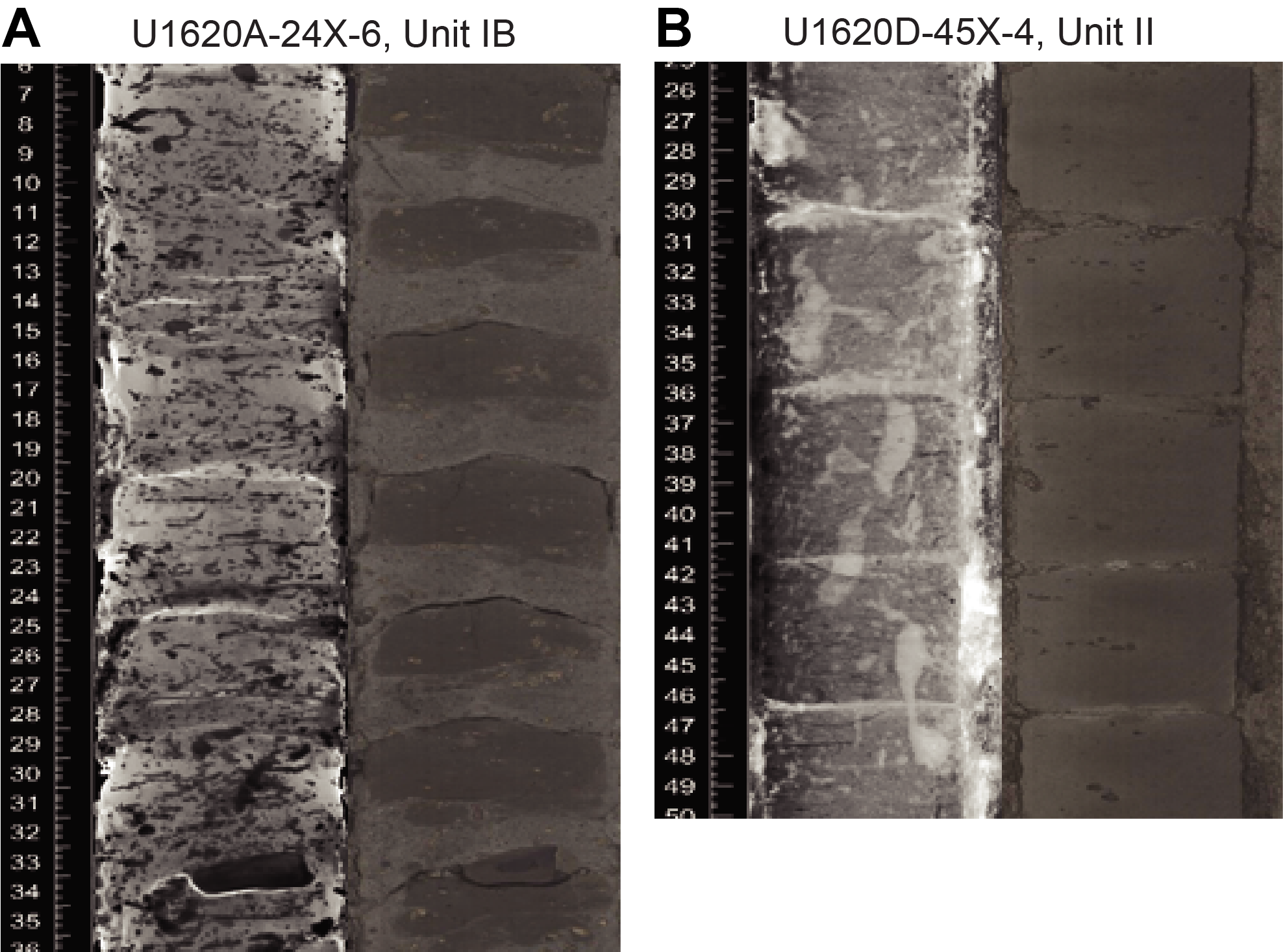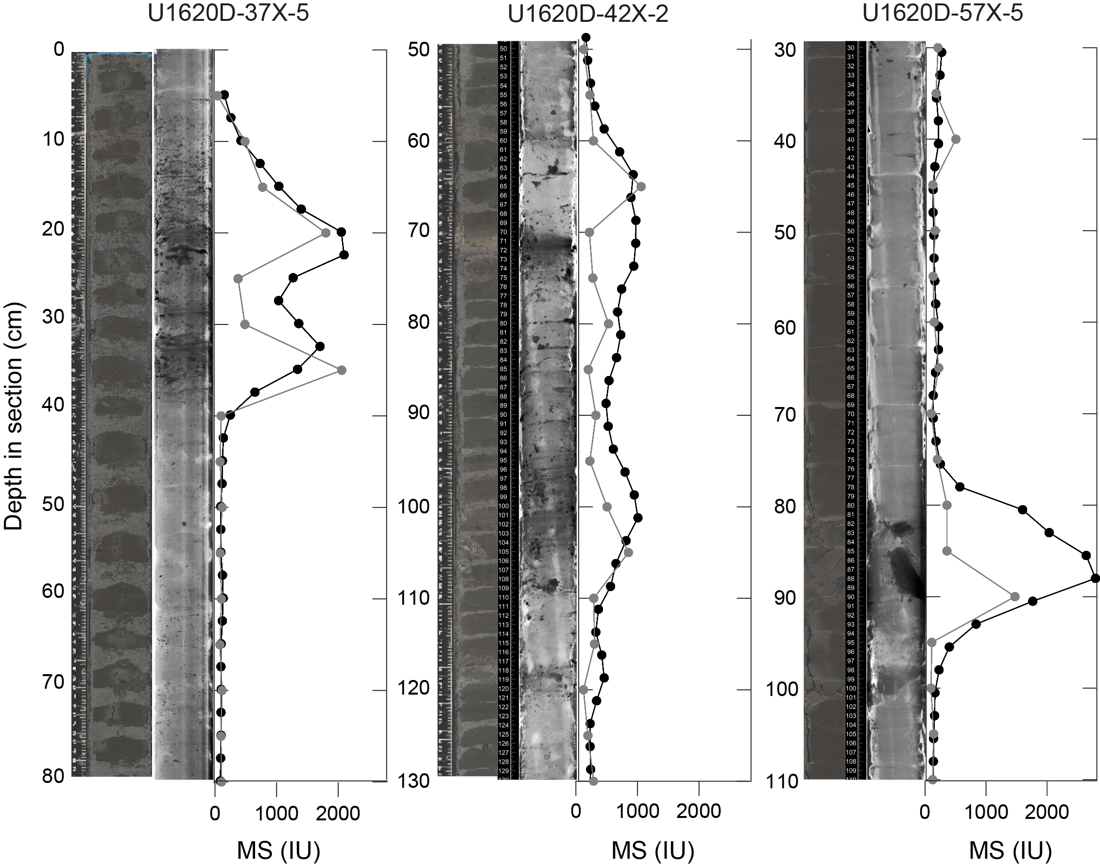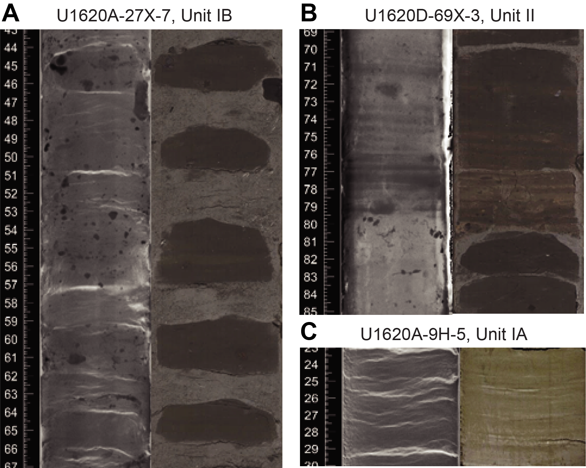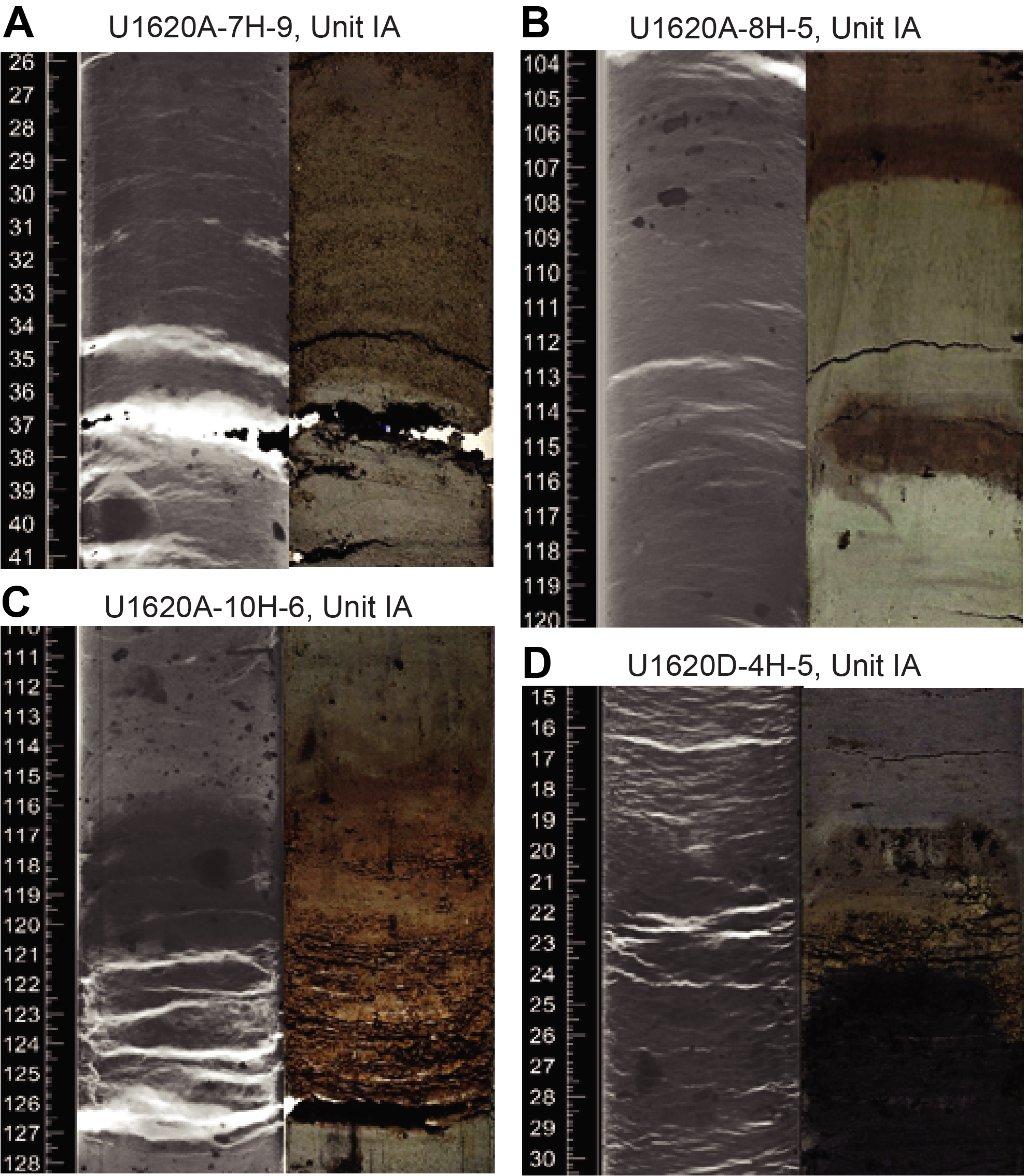 The Lithostratigraphic Subunit IA/IB boundary occurs at the transition from soft to firm sediments (Hole U1620A = 117.72 m; Hole U1620C = 114.18 m; and Hole U1620D = 116.94 m), with a relative increase in the amount of clay and decrease in the amount of silt. Bioturbation becomes more frequent in Lithostratigraphic Subunit IB, with many slightly to heavily bioturbated intervals. The presence of clasts continues through this subunit. Subunit IB contains a shift to higher MS values, with spikes reaching more than 1000 IU, corresponding to increased abundances of iron sulfide minerals, as observed in smear slides. Additionally, the shift to a dominant lower frequency L* pattern emerges at the top of Subunit IB, continuing to the base of the Site U1620 sedimentary record. The presence of authigenic carbonate increases downhole within Subunit IB.