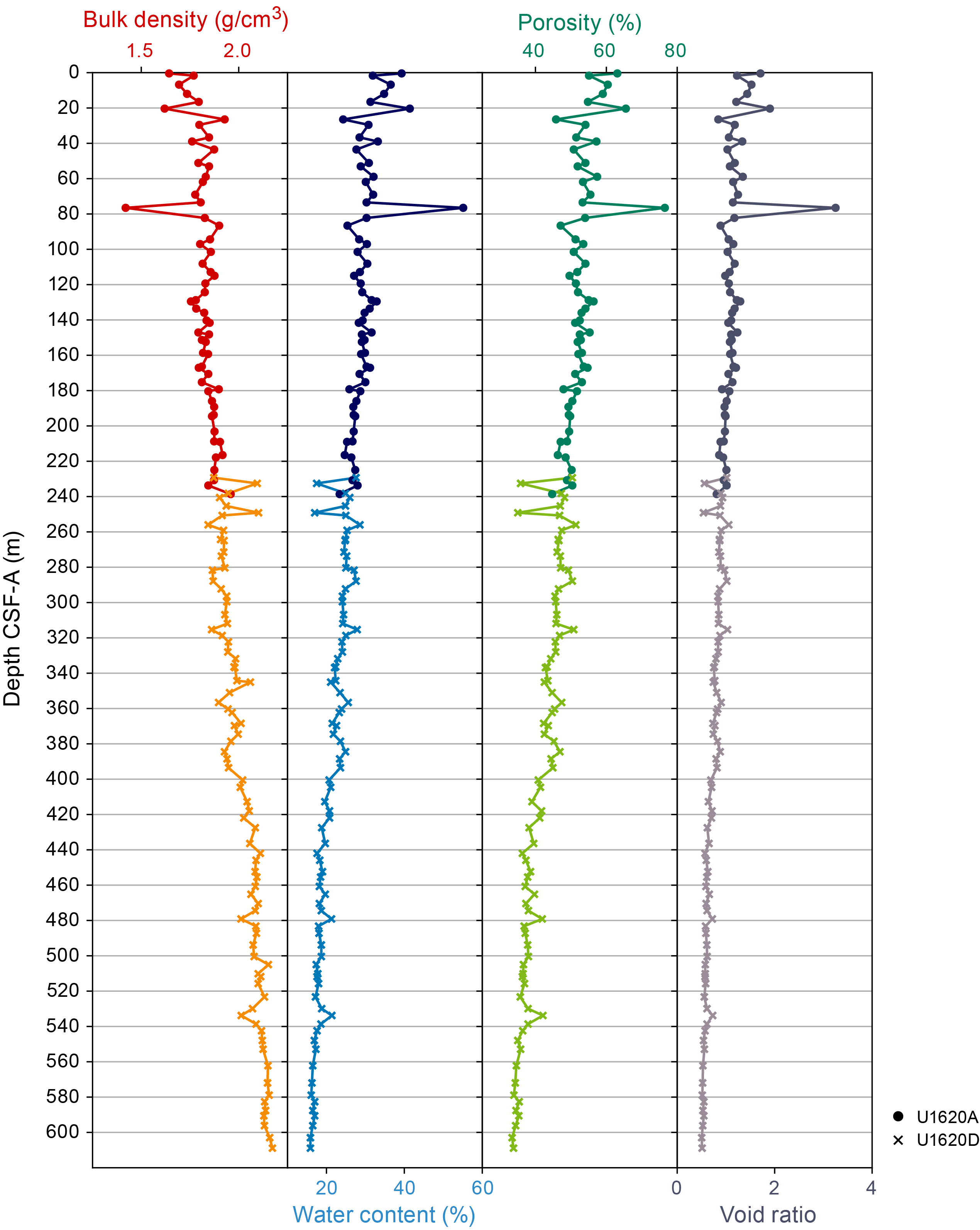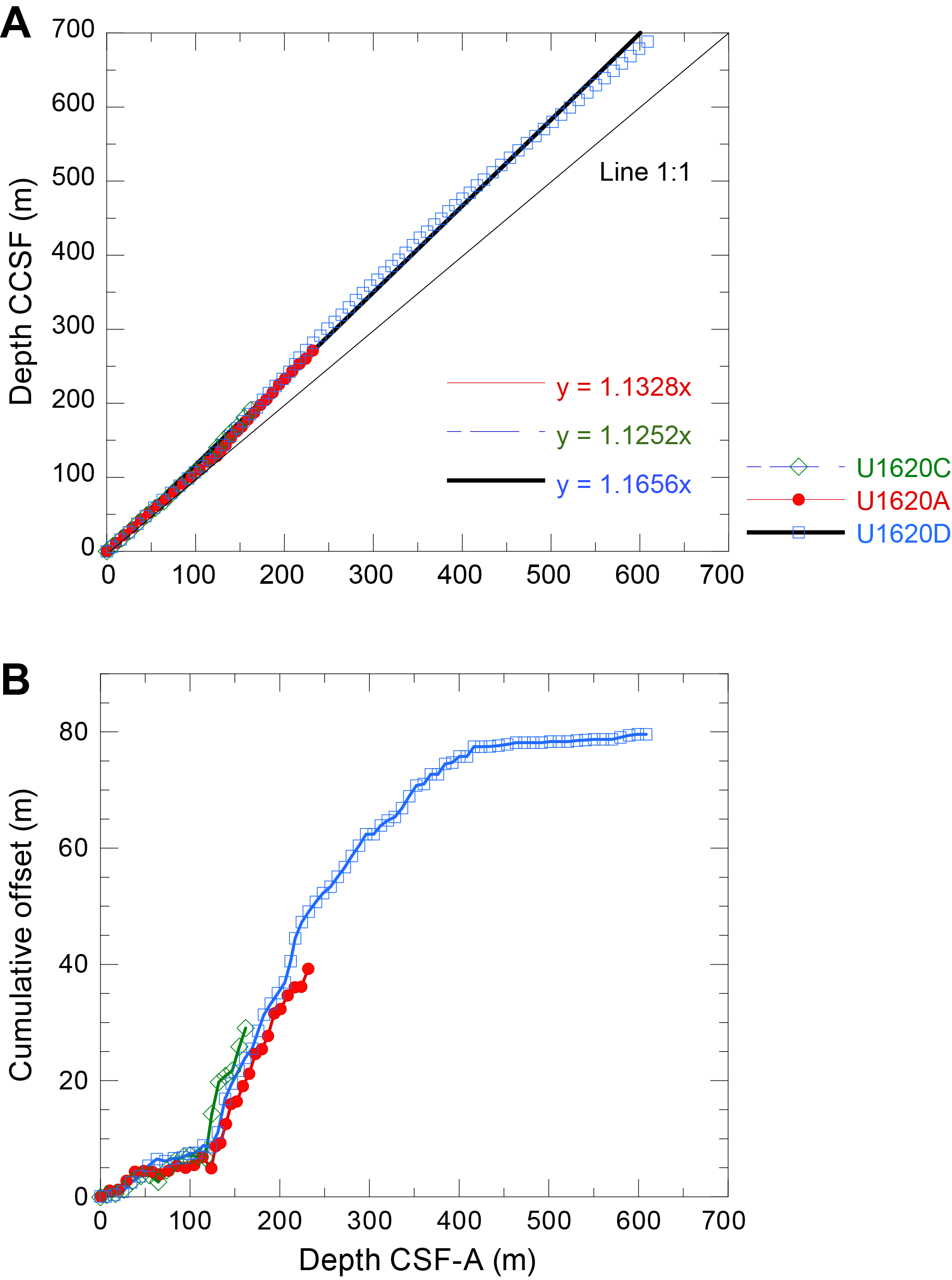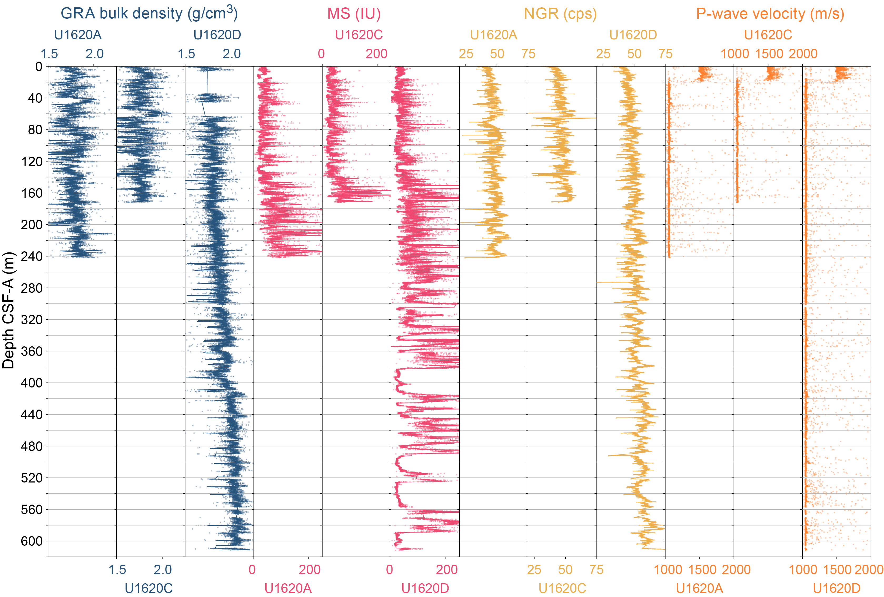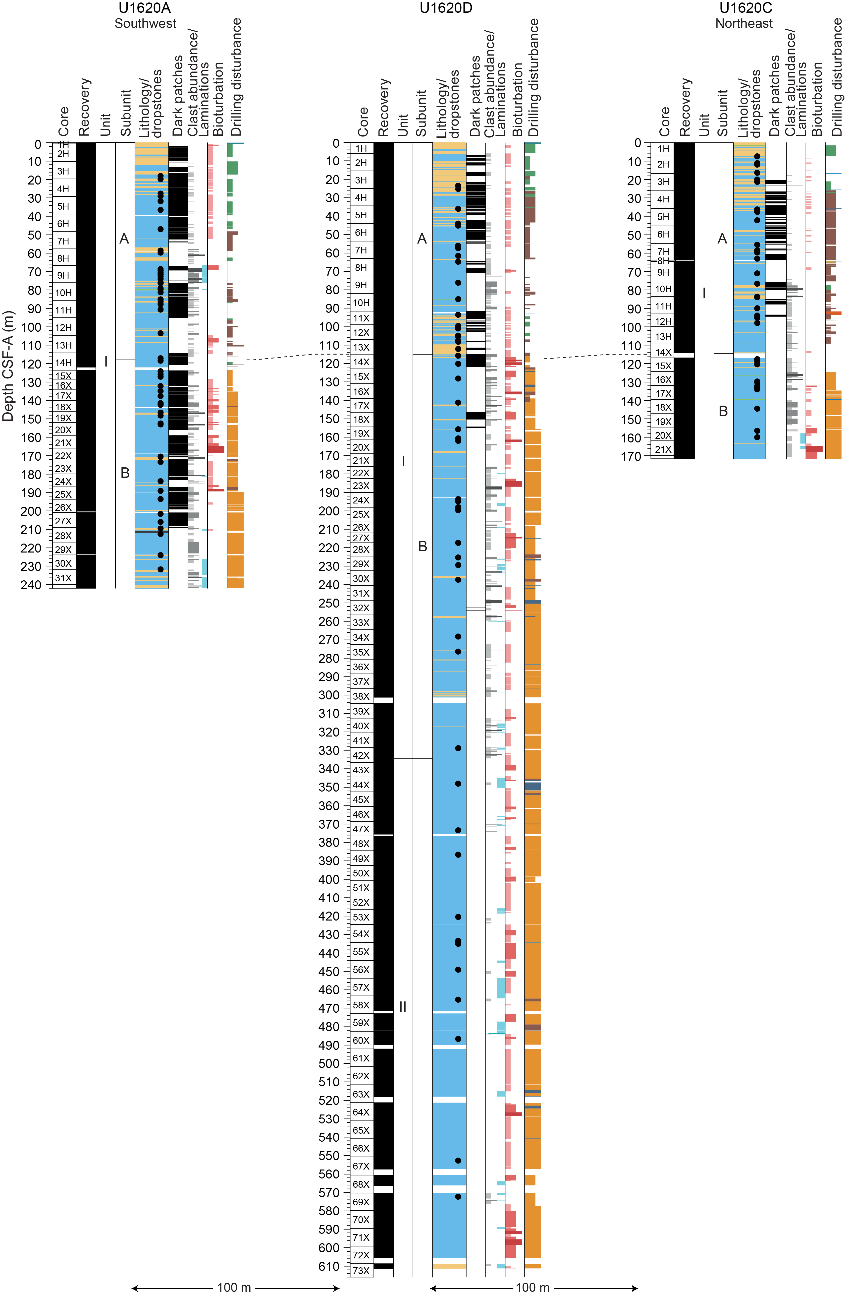 - Depths: Hole U1620A = 117.72–241.90 mbsf; Hole U1620C = 114.18–171.66 mbsf; Hole U1620D = 116.94–334.34 mbsf