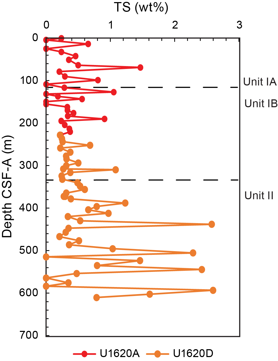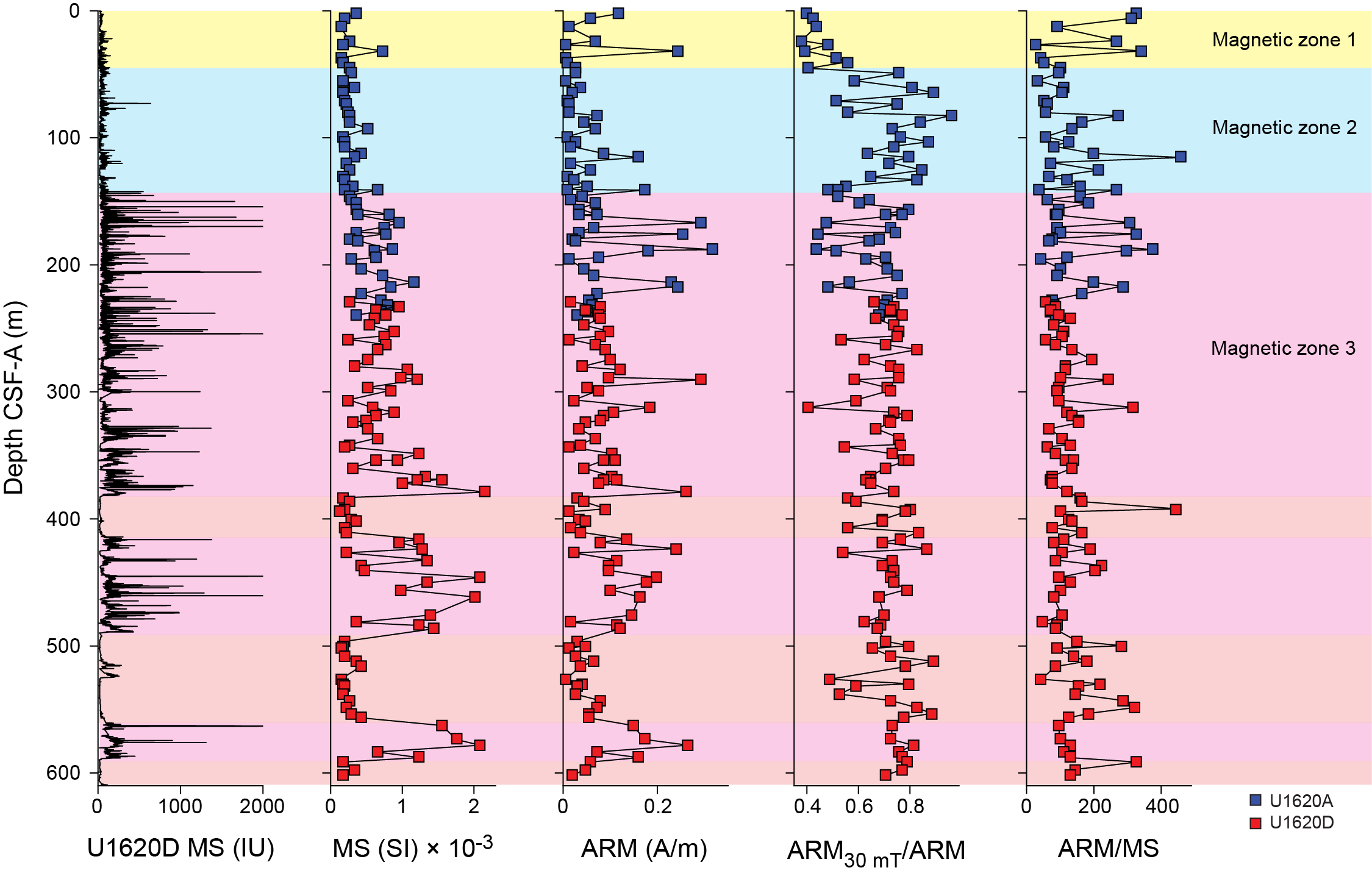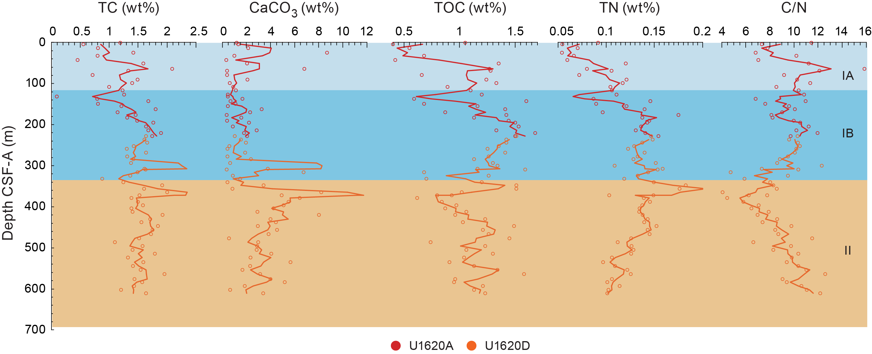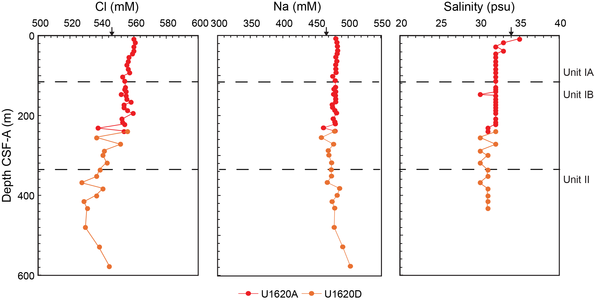 - Depths: Hole U1620A = 117.72–241.90 mbsf; Hole U1620C = 114.18–171.66 mbsf; Hole U1620D = 116.94–334.34 mbsf