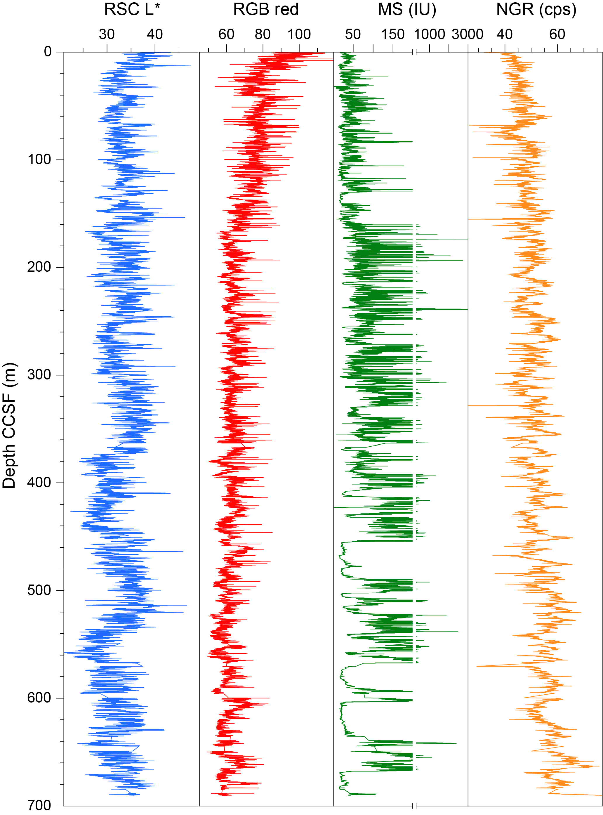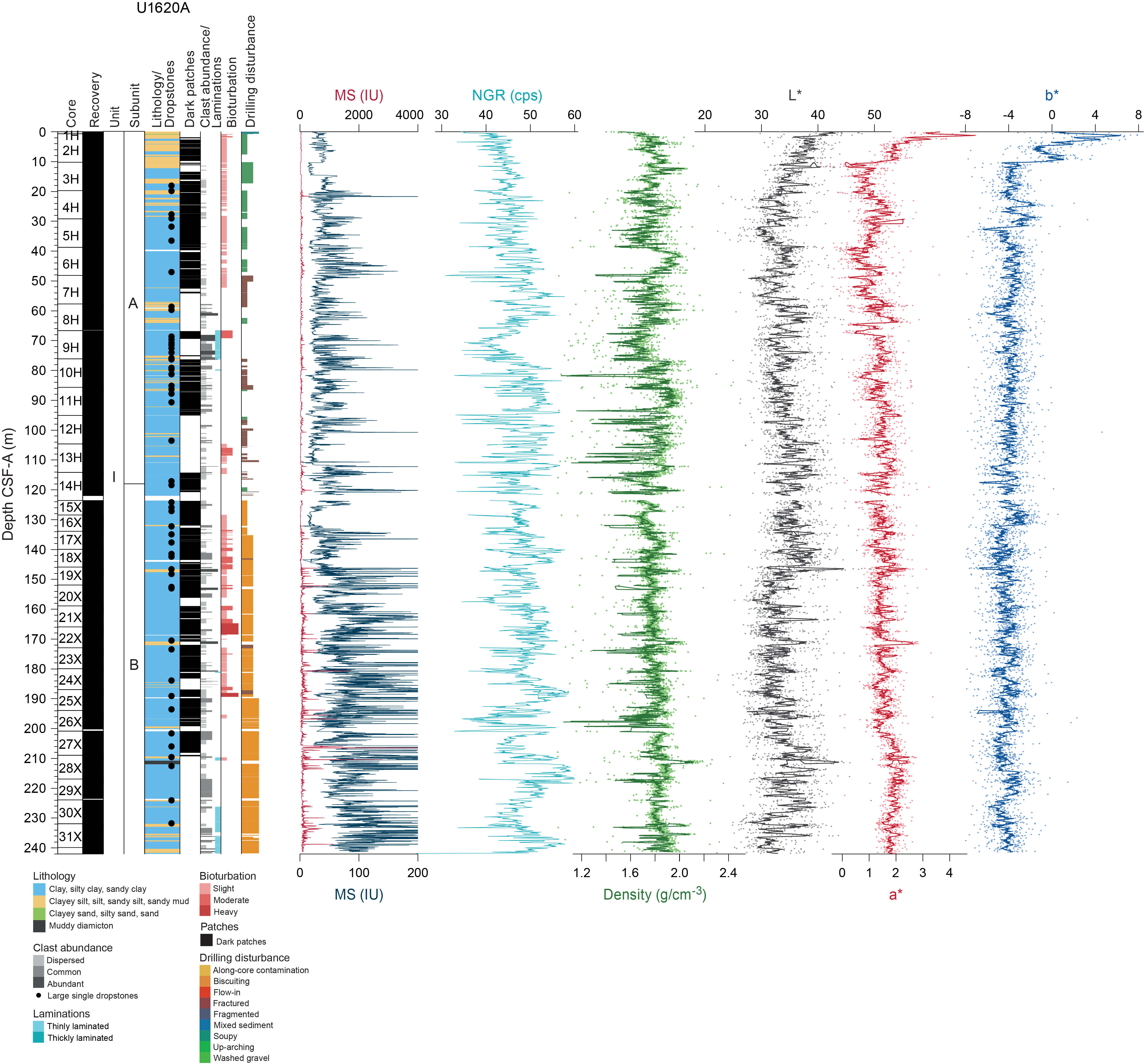 The lithostratigraphy of Site U1620 demonstrates that this location is well suited for reconstructing the Pliocene–Pleistocene evolution of the warm WSC and tracking the initial establishment and history of the paleo-SBSIS. The uphole stepwise transition from clay-rich, clast-poor lithologies in Lithostratigraphic Unit II to an increased occurrence of coarser intervals (e.g., including silts and sandy muds) and more dispersed clasts in Unit I hints at a major climate reorganization; the timing of such a reorganization may coincide with the expansion of Northern Hemisphere glaciation. An uphole increase in the presence of large clasts (i.e., dropstones) within Subunit IB, may point to specific changes in the ice margin of the paleo-SBSIS, perhaps marking the establishment of shelf-edge glaciation. Additionally, the cyclicities observed in the color reflectance and physical properties such as NGR (see Physical properties) suggest orbital pacing throughout the record, with a reorganization of the dominant signal at the Subunit IA/IB boundary. The increase in silts near the top of the record may further indicate either changes in the WSC and/or changes in ice sheet dynamics.
