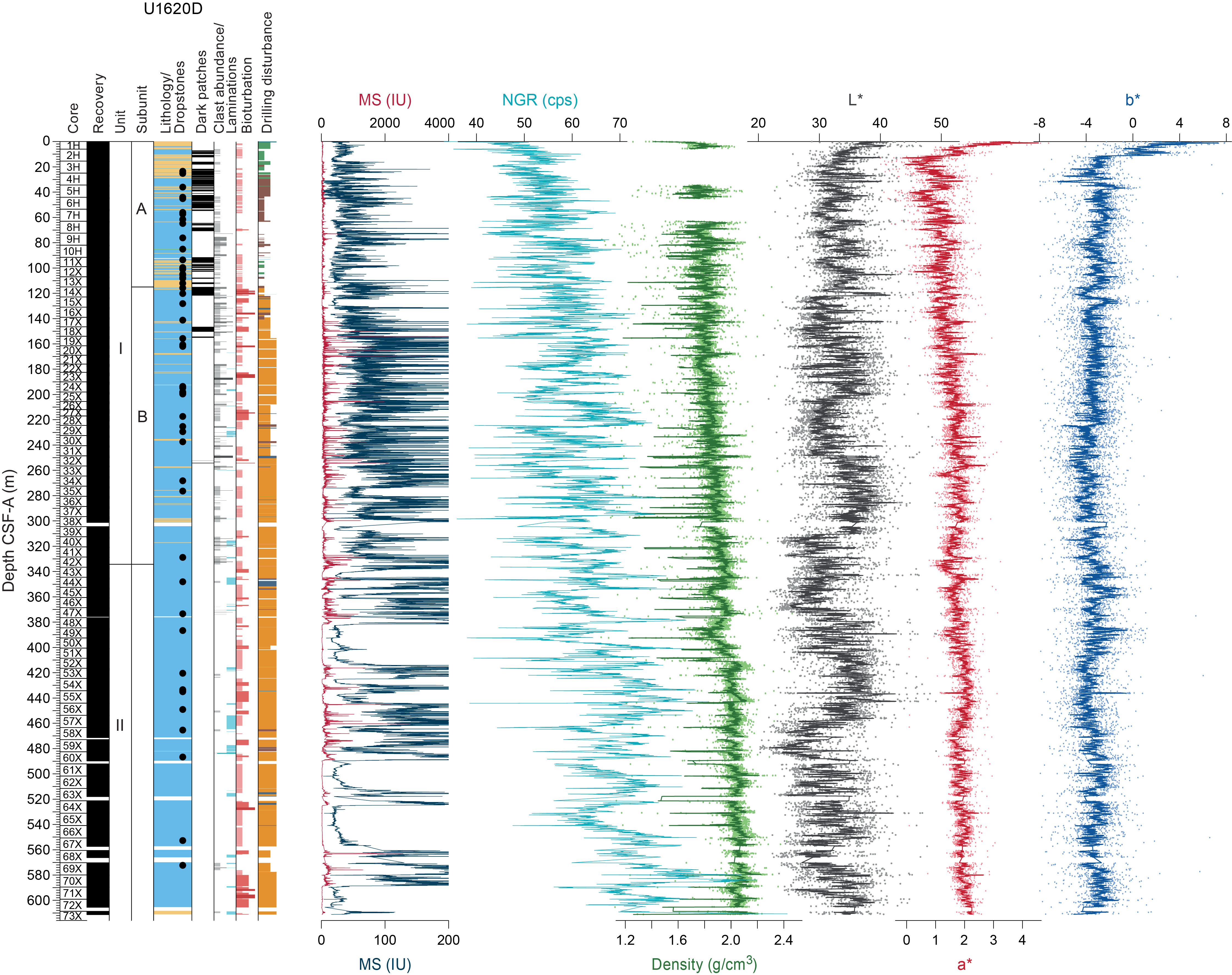Based on the primary (i.e., detrital siliciclastics) and secondary (i.e., diagenetic) sediment characteristics, two primary lithostratigraphic units and additional subunits are defined for Site U1620 (Table T2). Holes U1620A, U1620C, and U1620D were used to define the lithostratigraphic characteristics of Unit I and Subunits IA and IB, whereas the deeper Unit II was recovered in Hole U1620D only. The stratigraphic boundary between Subunits IA and IB was first placed in Hole U1620D, and the boundary was subsequently identified in Holes U1620A and U1620C in good agreement with the stratigraphic correlation (see Stratigraphic correlation) on the CSF-A scale (Figure F11).