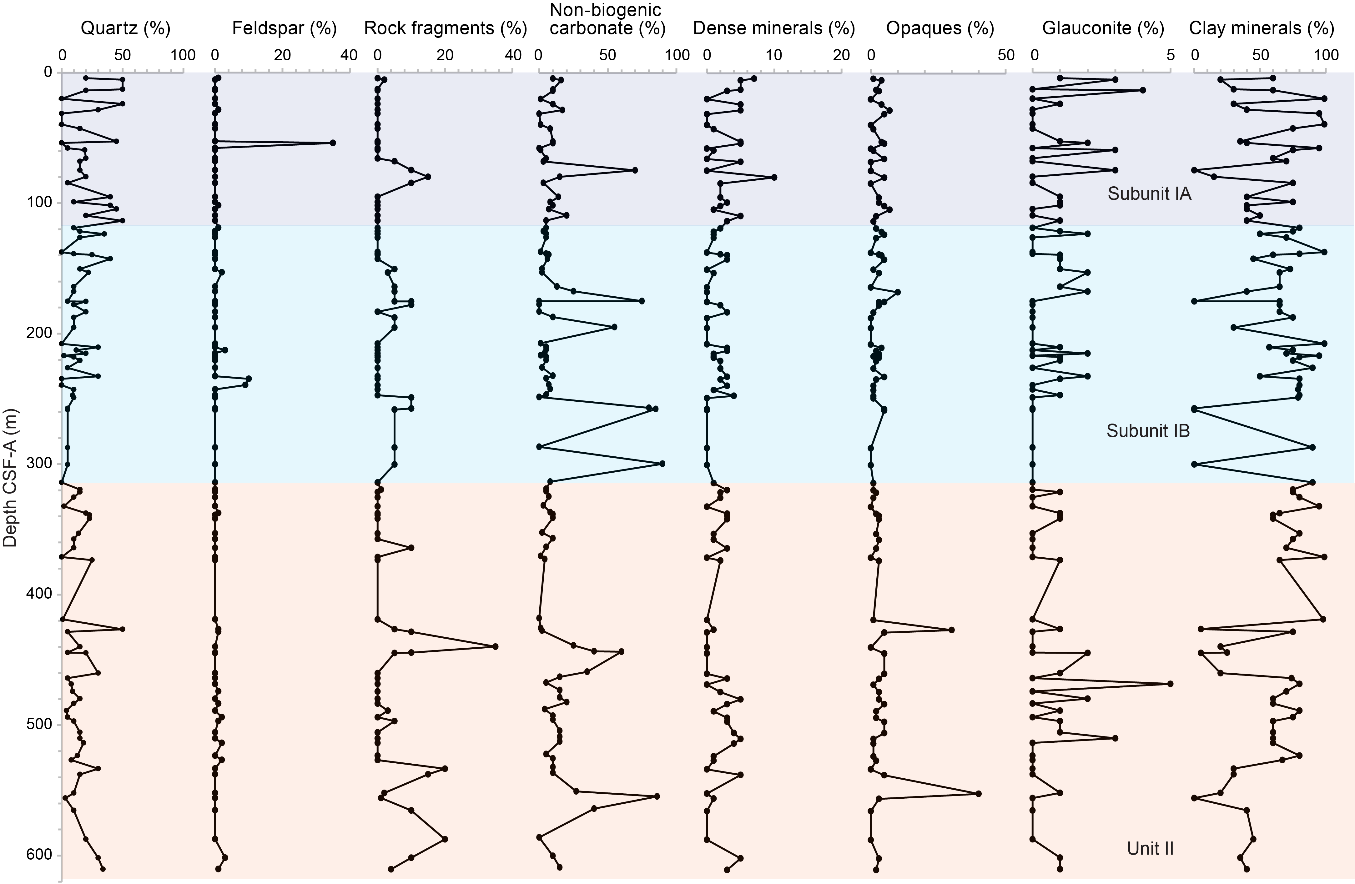 The most common minerals observed in smear slides are clay minerals, quartz, and nonbiogenic carbonate. Rock fragments, micas, and dense minerals occur in varying amounts throughout (Figure F13). Glauconite is observed in low percentages (1%–4%) discontinuously downhole. Opaque minerals, including iron sulfide minerals, occur discontinuously in abundances of 1%–10% and are also sporadically observed on the surface of the split core. Their occurrences correspond to the higher MS values observed toward the lower part of Unit I. The biogenic component of the sediments within Unit I is low, with only 5 of the 53 smear slides taken from the unit containing biogenic components in amounts of 2%–7%.