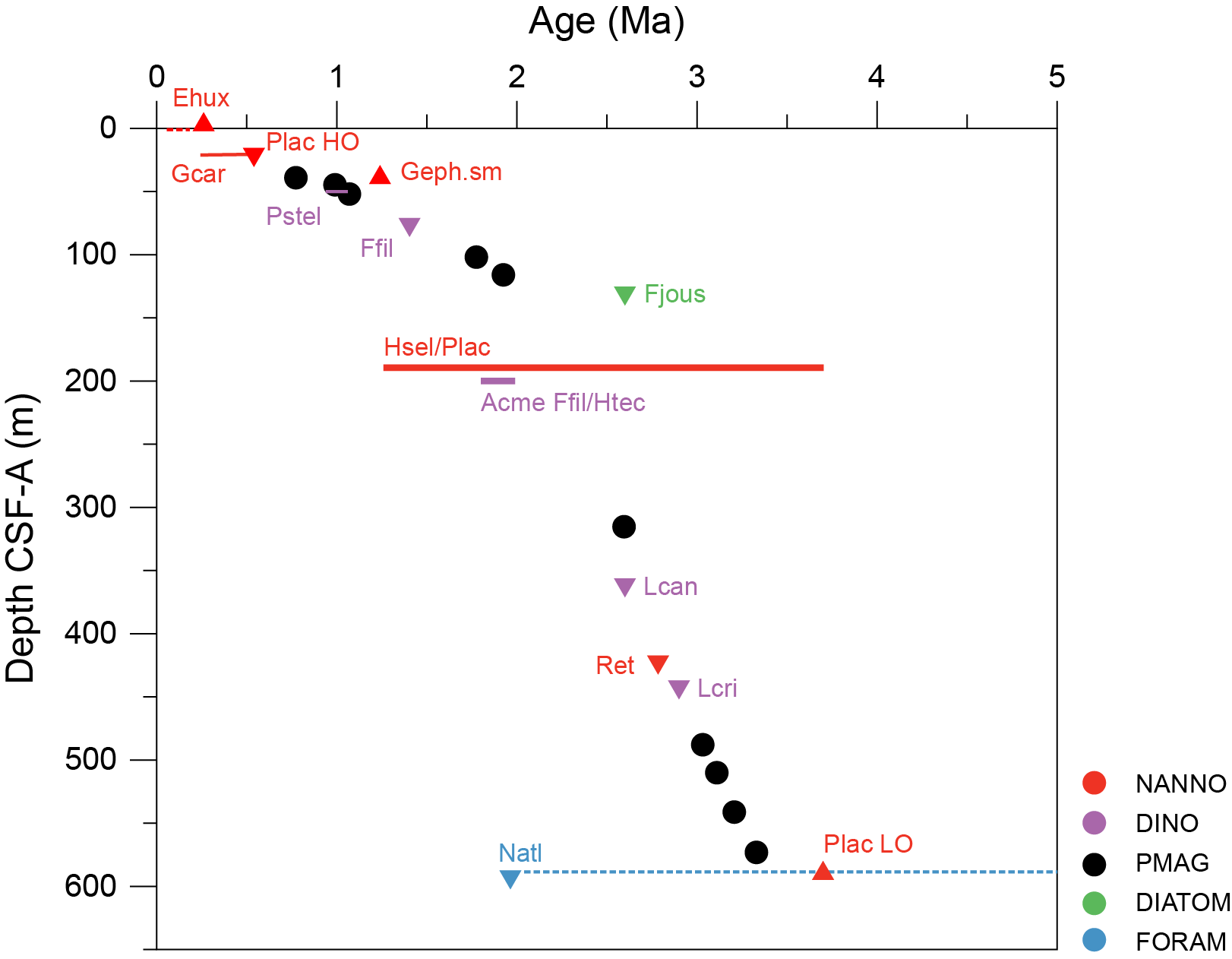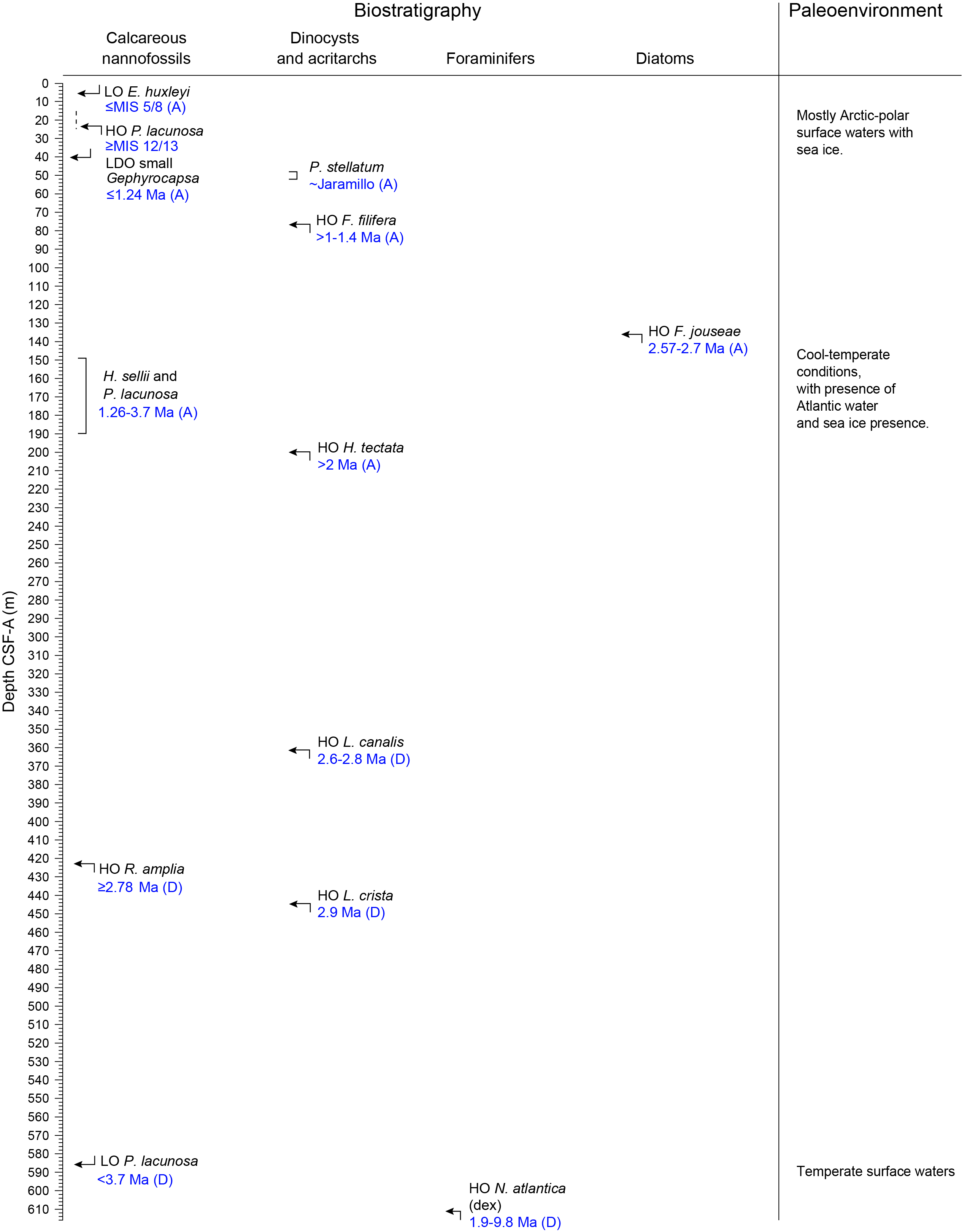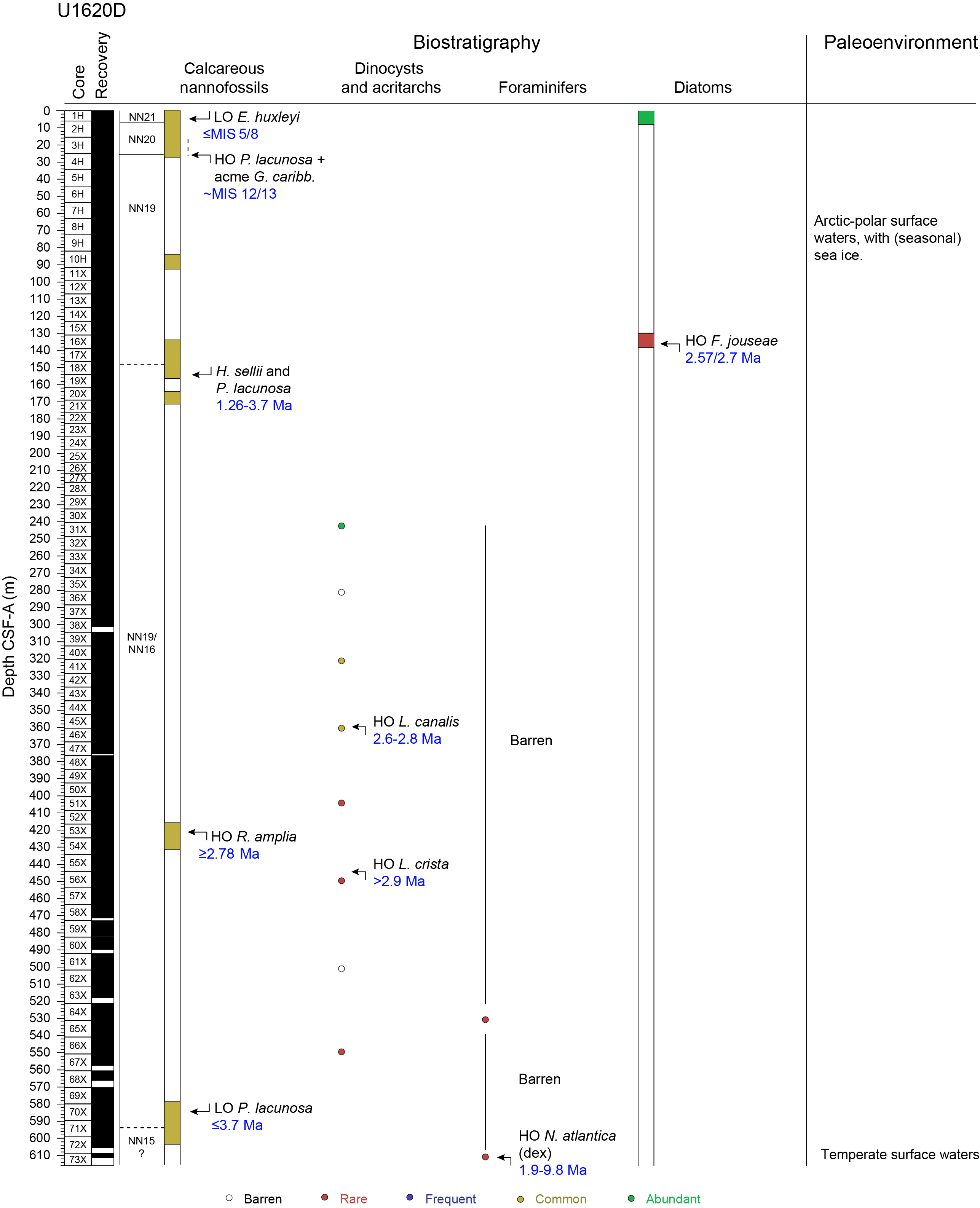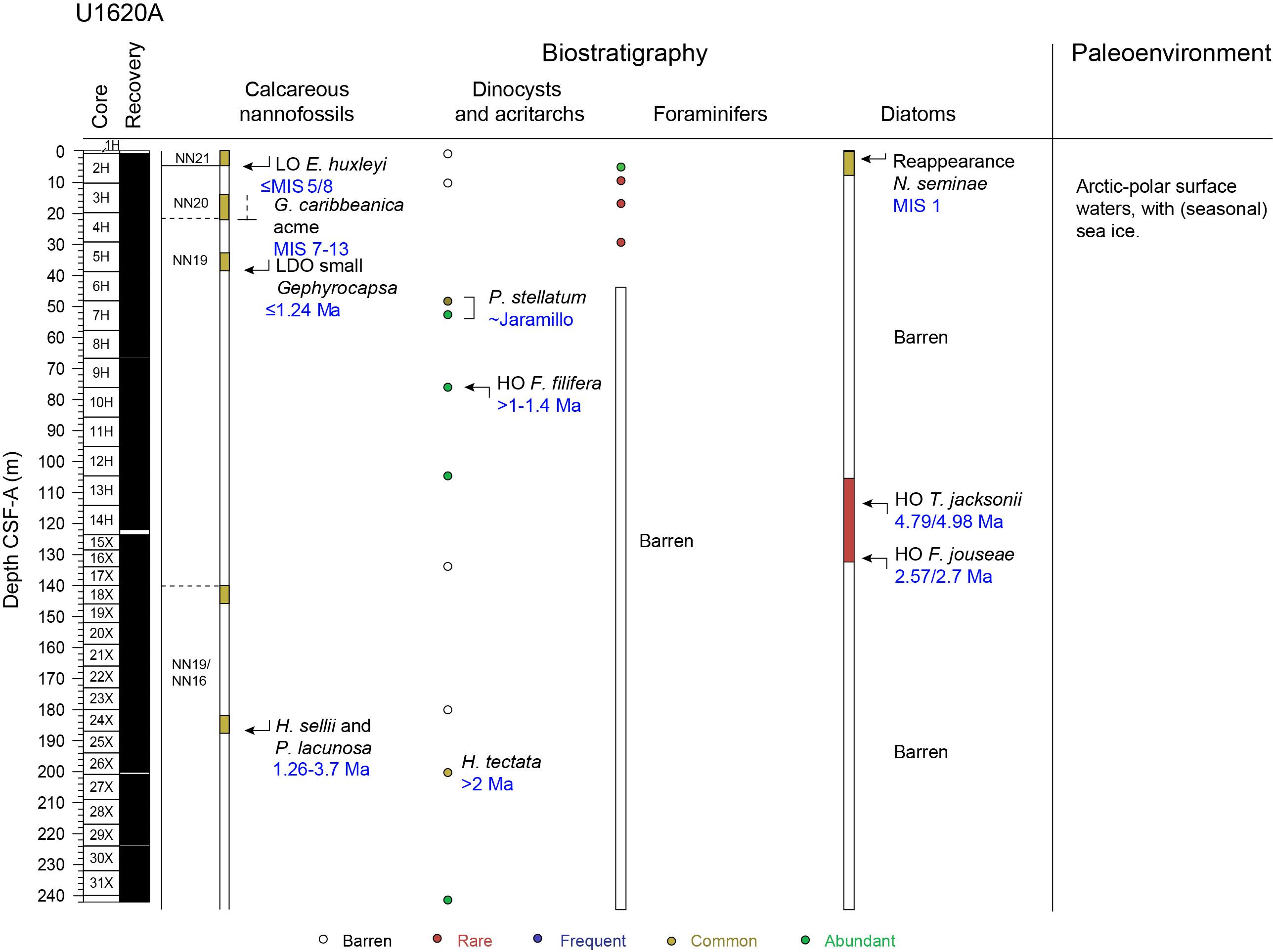 Several biostratigraphic events of Pleistocene age are recorded by calcareous nannofossils in Holes U1620A, U1620C, and U1620D and by dinocysts in Hole U1620A (Table T4). Planktonic foraminifers, calcareous nannofossils, and dinocysts converge on a Late Pliocene age for the lower part of Hole U1620D (Figure F14). Overall, biostratigraphic data show that Site U1620 ranges from Late Pliocene to Pleistocene and, together with paleomagnetic data, enables the development of an age-depth model for Site U1620 (Figure F15). Planktonic foraminifers, diatoms, and dinocysts show a paleoenvironment dominated by Arctic–polar surface waters with seasonal sea ice during the Pleistocene. During the Late Pliocene, sea ice was reduced and surface waters were temperate.