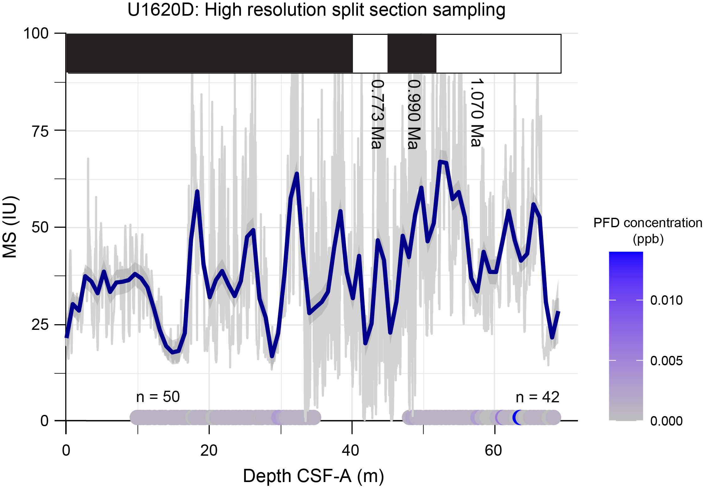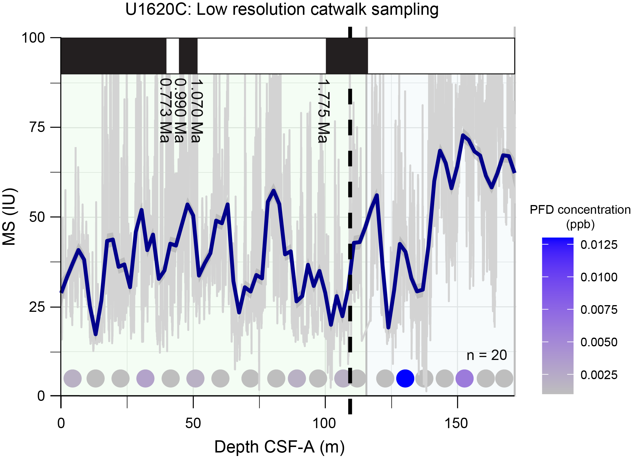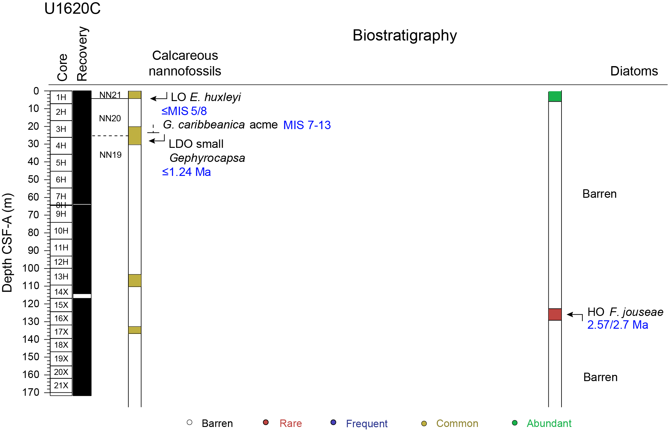 Hole U1620C was sampled continuously at low resolution for the complete ~187 m recovered length (Figure F47). Preliminary age estimates from the shipboard chronology suggest the record will span the Holocene to Early Pleistocene (see Biostratigraphy and paleoenvironment and Paleomagnetism).