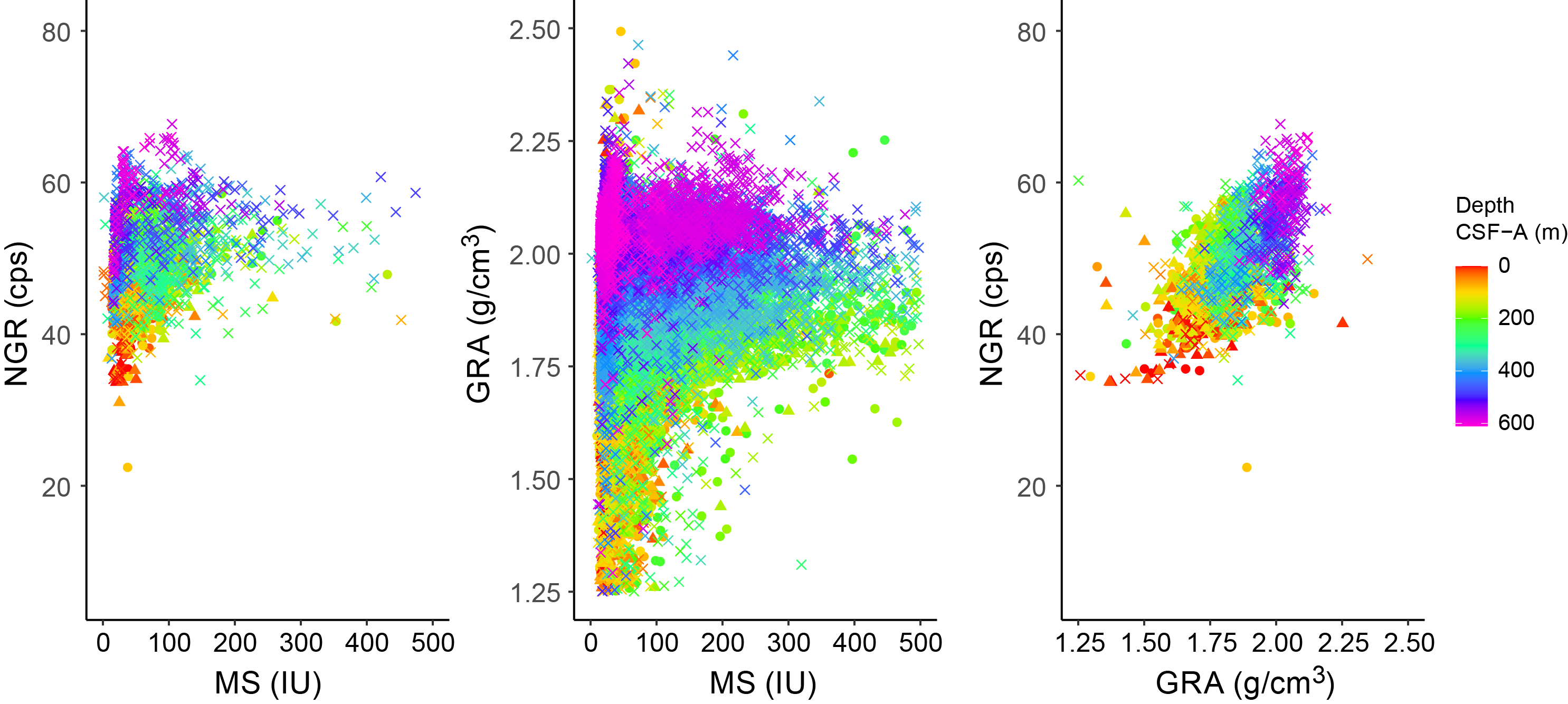 The triple combo tool string acquired borehole diameter, natural gamma ray, density, and electrical resistivity, although most of the data suffered from noise caused alternately by swelling and washed-out formations. Because of some technical issues, the Accelerator Porosity Sonde (APS) and Magnetic Susceptibility Sonde (MSS) could not obtain porosity except in intervals deeper than ~484.9 m WMSF of the repeat log and entire MS logs, respectively (Figure F51).